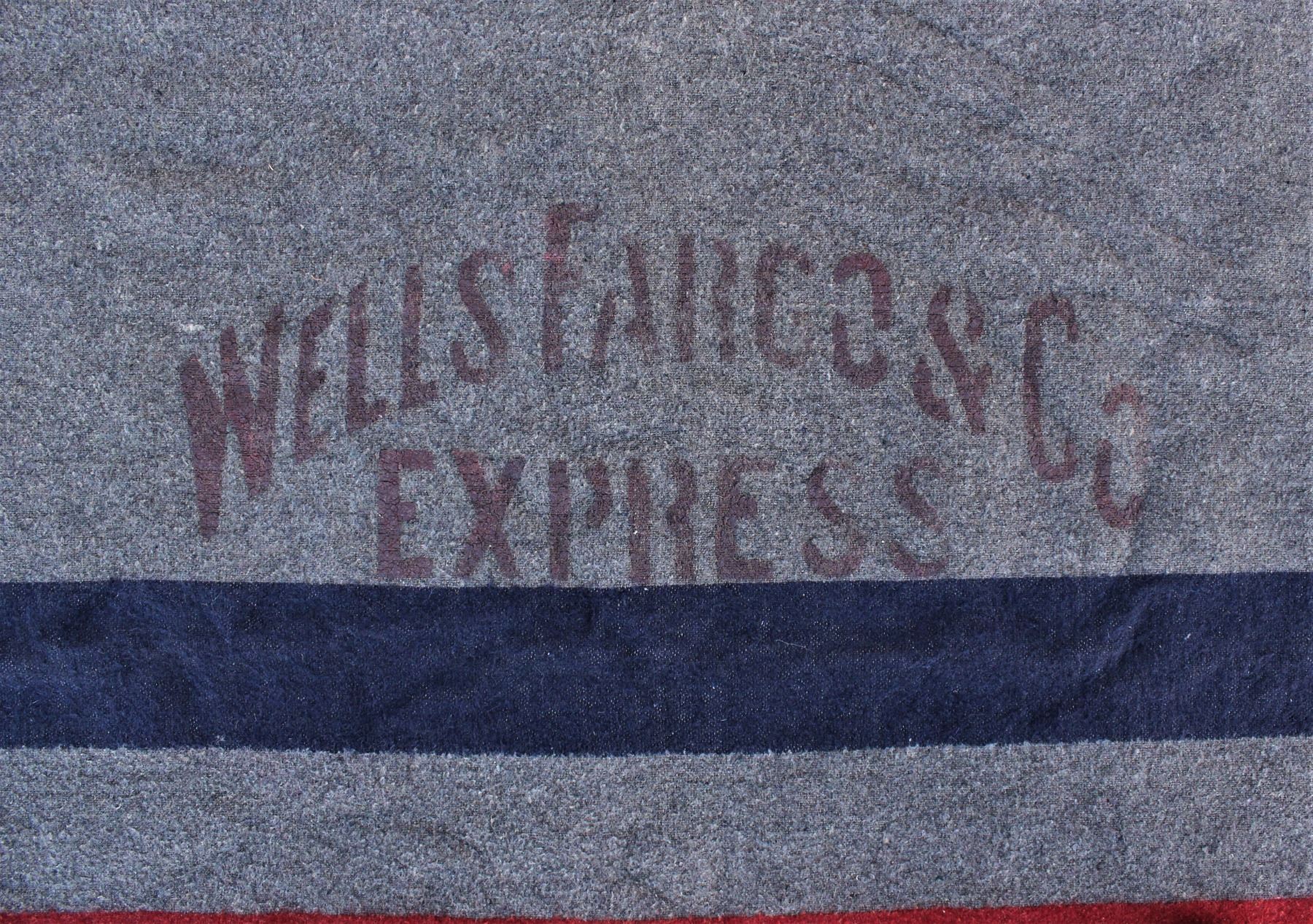 Seldom seen, wonderful wool full size horse blanket measuring 85" x 88", with great colors and Wells Fargo markings.