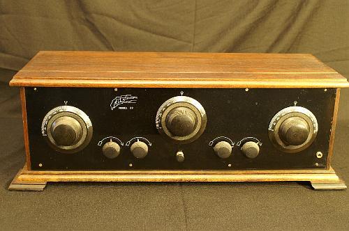 The internal construction of this set almost certainly dates to 1923 as I believe the Model # also indicates. One collectors guide indicates a date of 1925. The set may have been sold in that year but almost certainly is older in design and manufacture. The three coils are spool wound and positioned geometrically behind the tuning condensers in a style that clearly precedes the mid 1924 introduction of the Freshman Masterpiece. It uses potentiometer bias to reduce oscillation, which preceded the Neutrodyne circuits as well. Anyone familiar with early radio can, at a glance inside, know this is truly one of the first three-dial TRF sets made. It is in near mint original condition and is likely the oldest three-dial set in this collection.