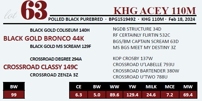 KHG ACEY 110M - Homo Polled - Bred to TSF Missouri 25M. Exposed March 15 - May 20. Due Jan 1.