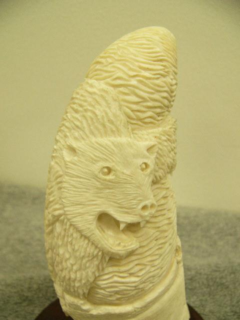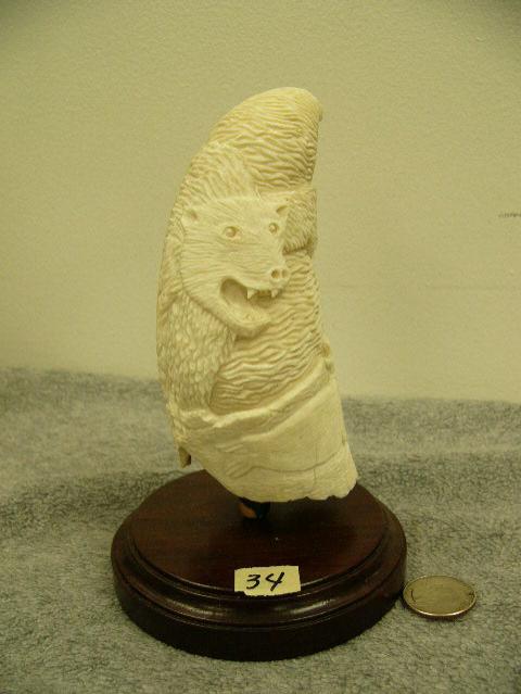 Whales tooth carved with polar bear preparing to swat a seal mounted on wood 6.5" tall (33)
