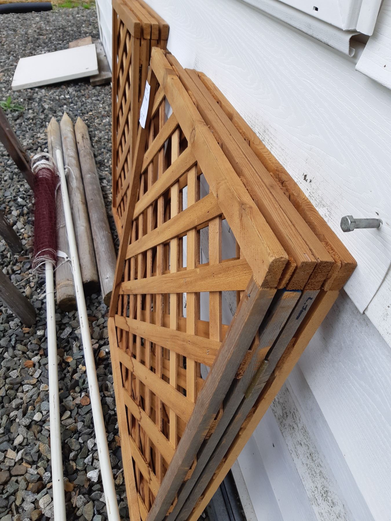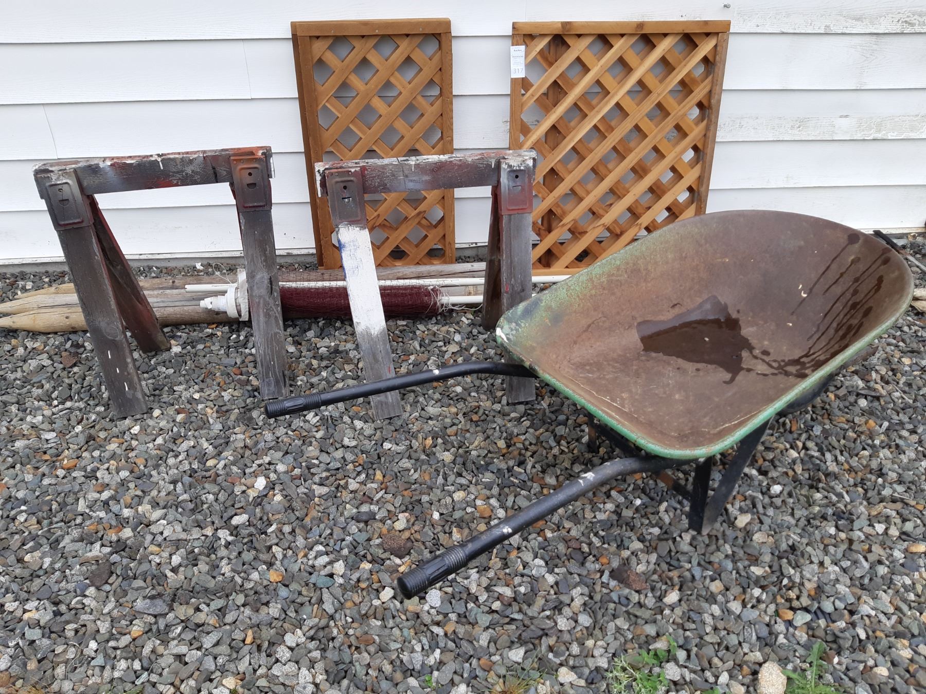 Wheelbarrow, hinged lattice 36 high x2, 3 fence post, saw horses, Volleyball net, horseshoes, pickup 9 am