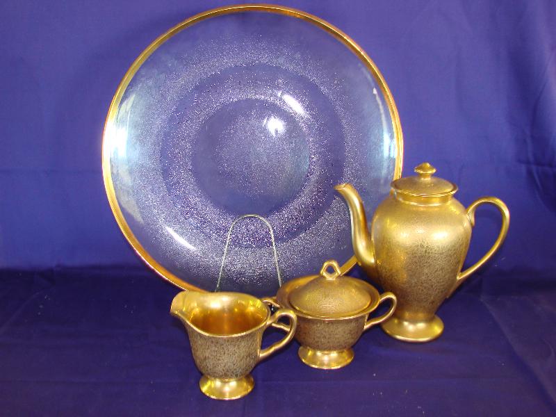 Wheeling Co. coffee, cream, sugar, w/large gold rim platter