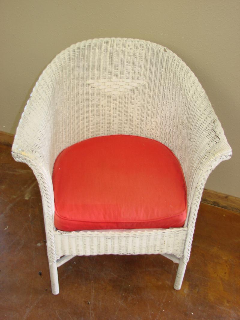 White wicker chair w/red cushion