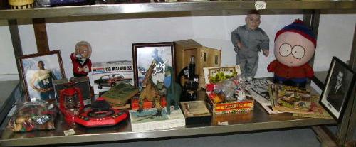 Whole shelf of collectible toys and sports and comic books (76)