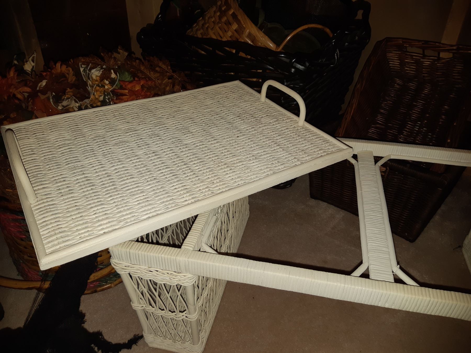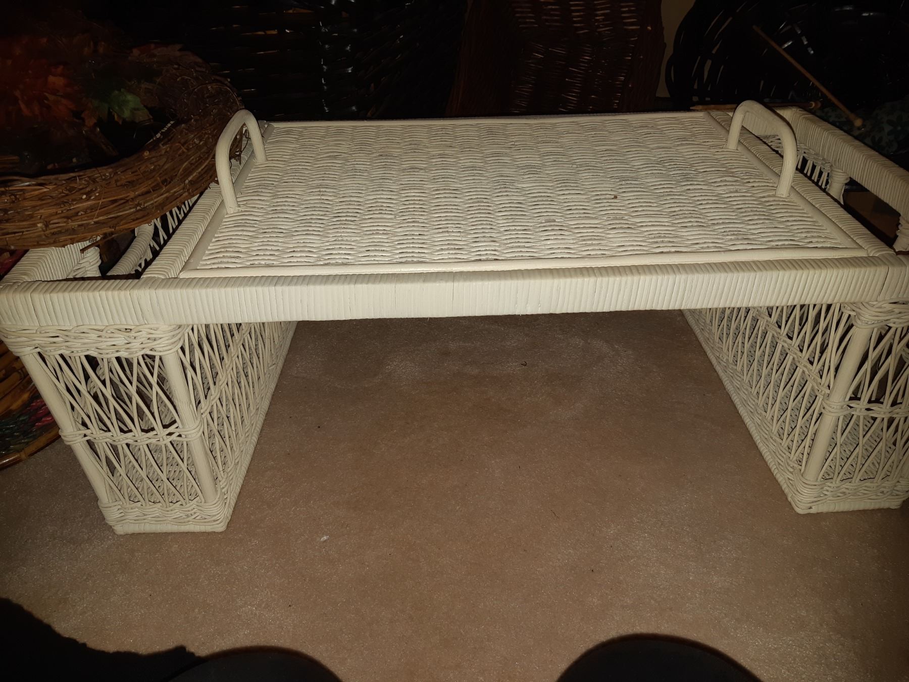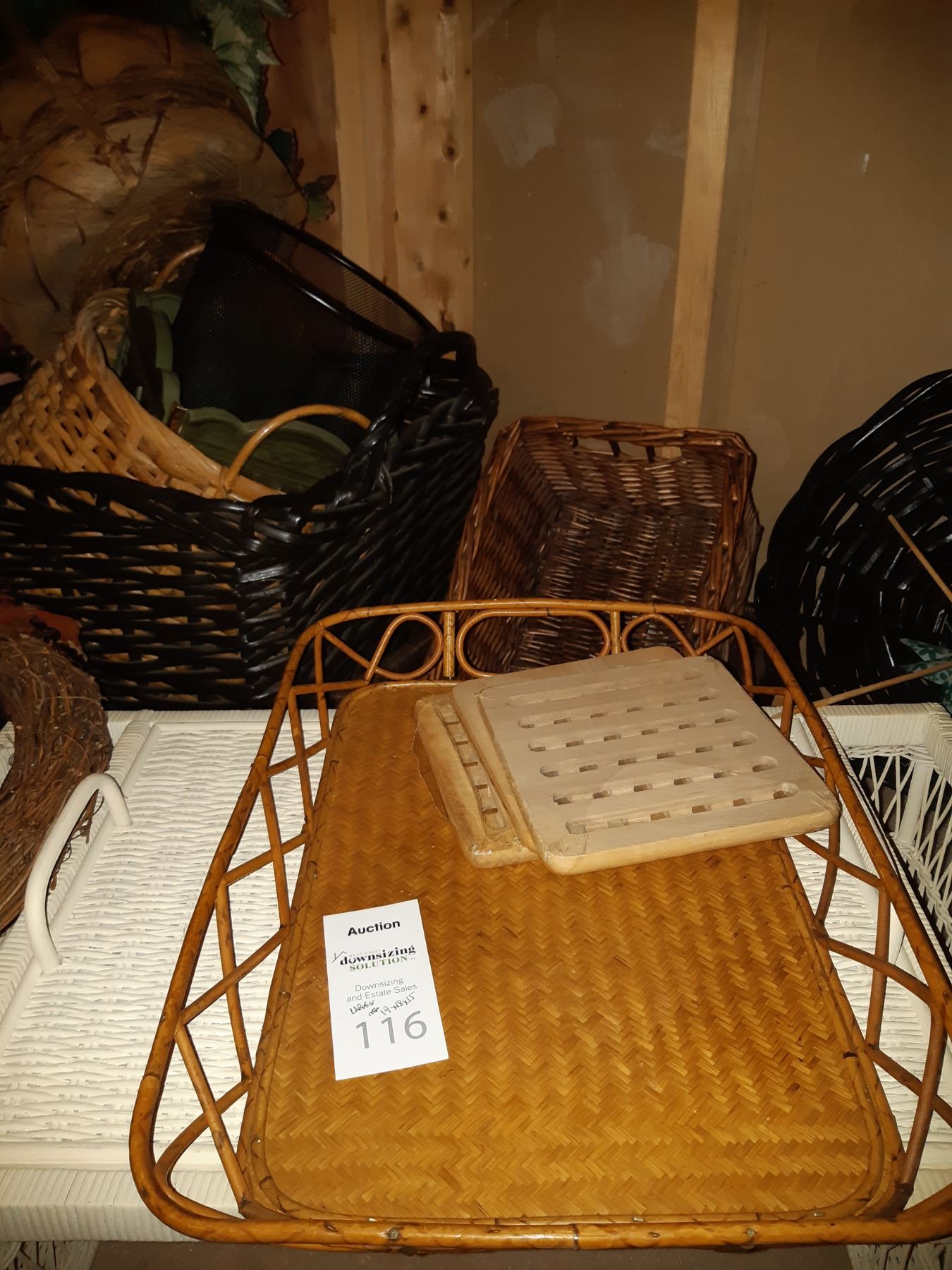 Assortment of wicker baskets and bed tray. Pickup at 11 am