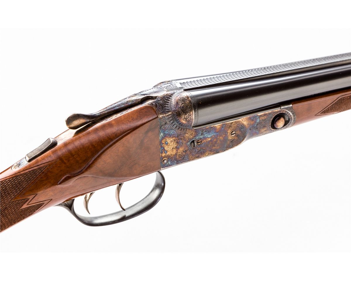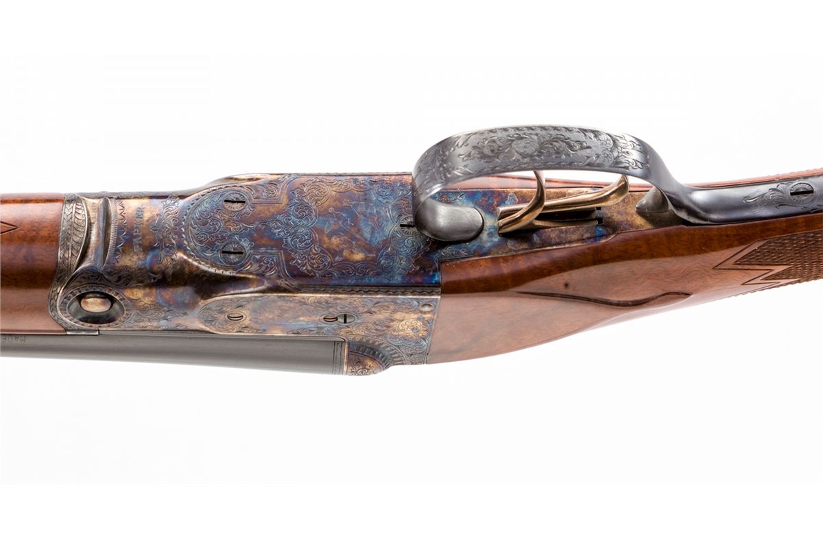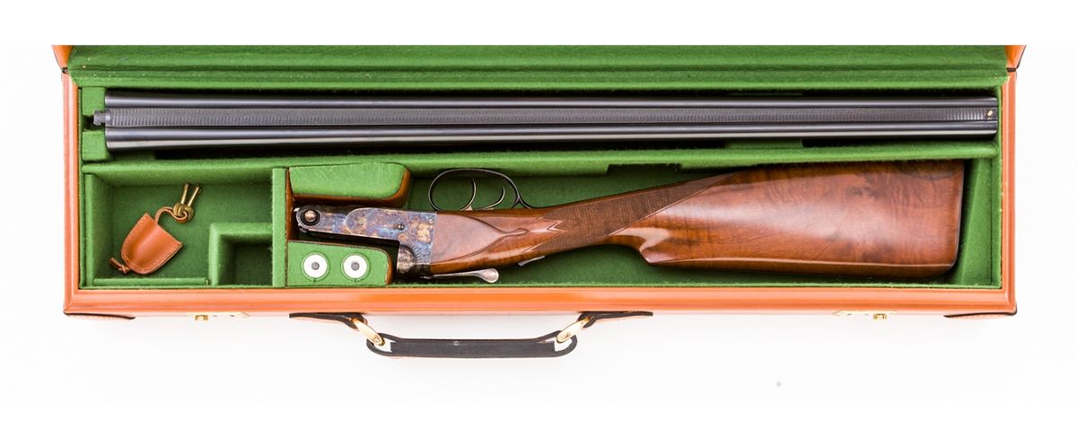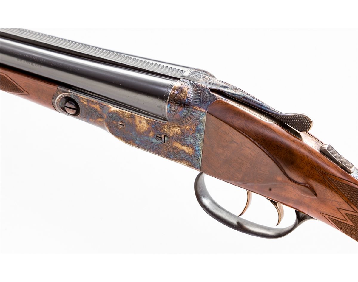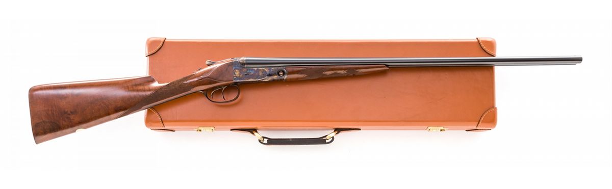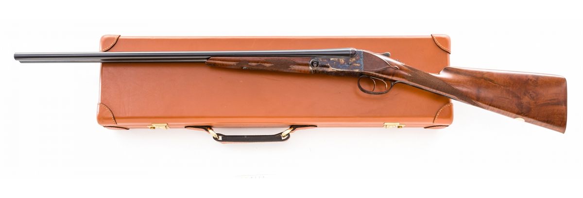 Winchester-Parker Reproduction DHE Grade Side-by-Side Shotgun, #28-3501, 28 ga., 26'' game rib blue matte barrels choked IC/Cyl., roll-engraved game scene case-hardened boxlock frame, checkered straight-grip walnut stock with engraved steel skeleton buttplate and splinter forend. All features are standard to this model, including auto safety, auto ejectors, single brass bead front sight, and double triggers. Condition is excellent, appearing new and unfired. Stock shows minor marks from handling. In original leather case, with Parker marked snap cap and canvas cover. Length of pull: 14-1/4''. Est.: $3,000-$5,000. (Modern) (Ernest A. Bryant III estate)