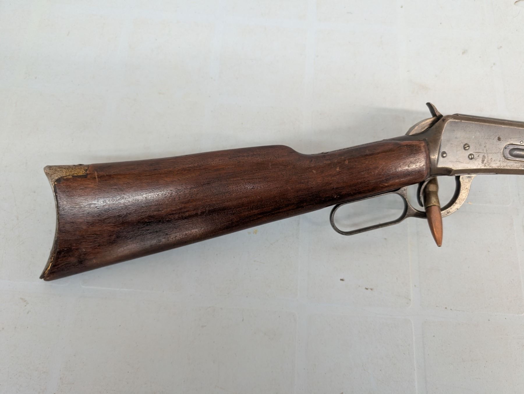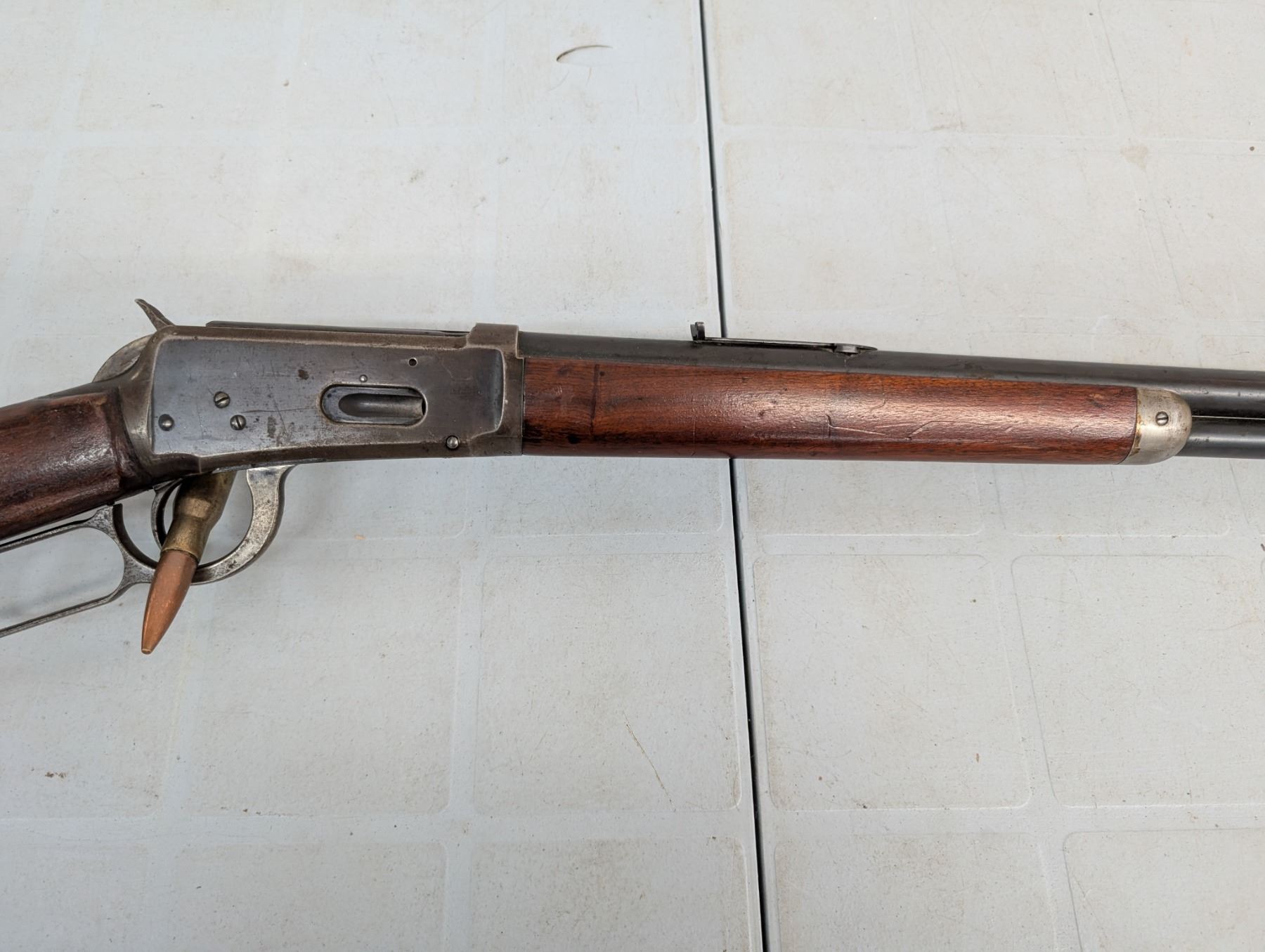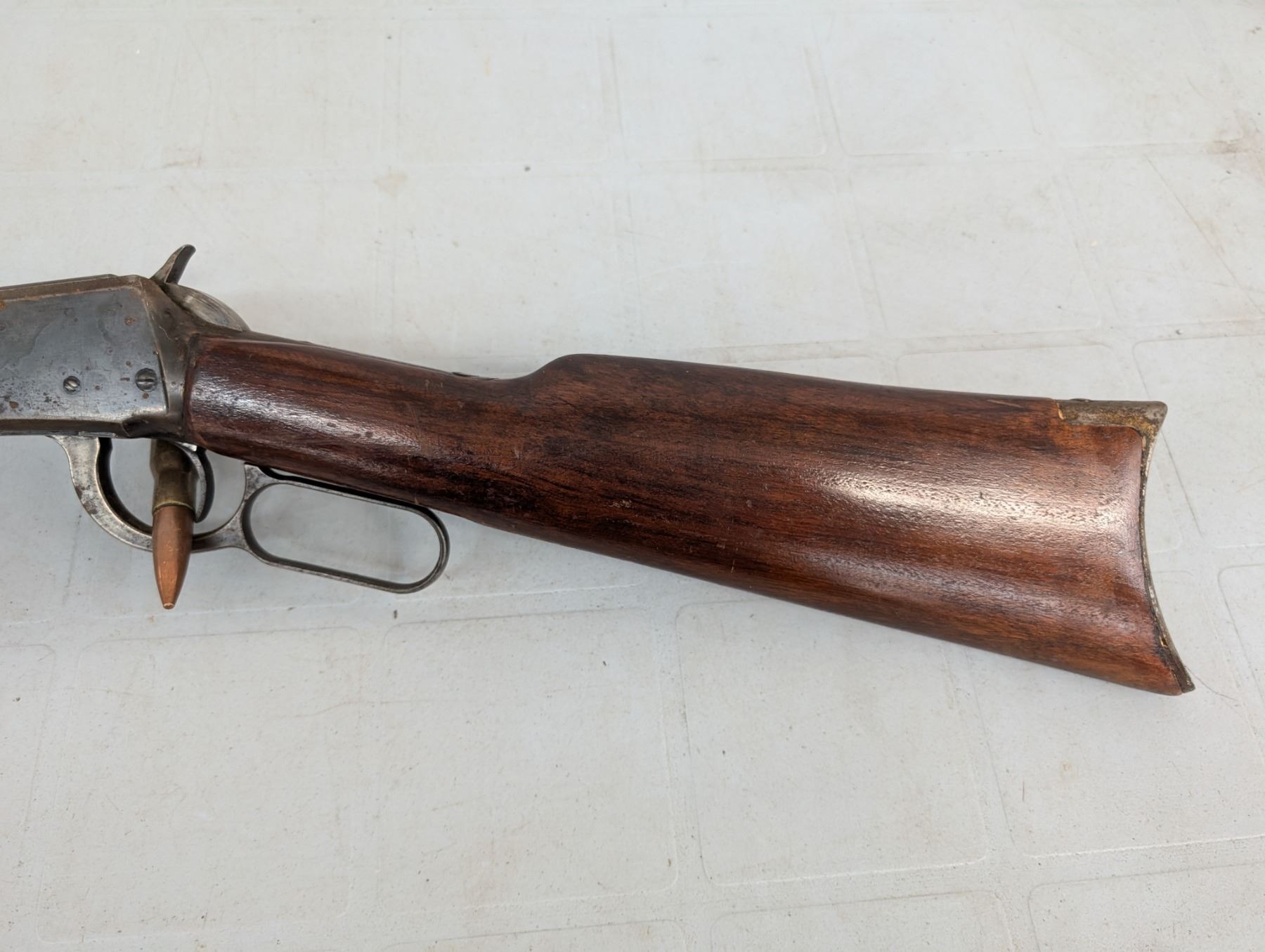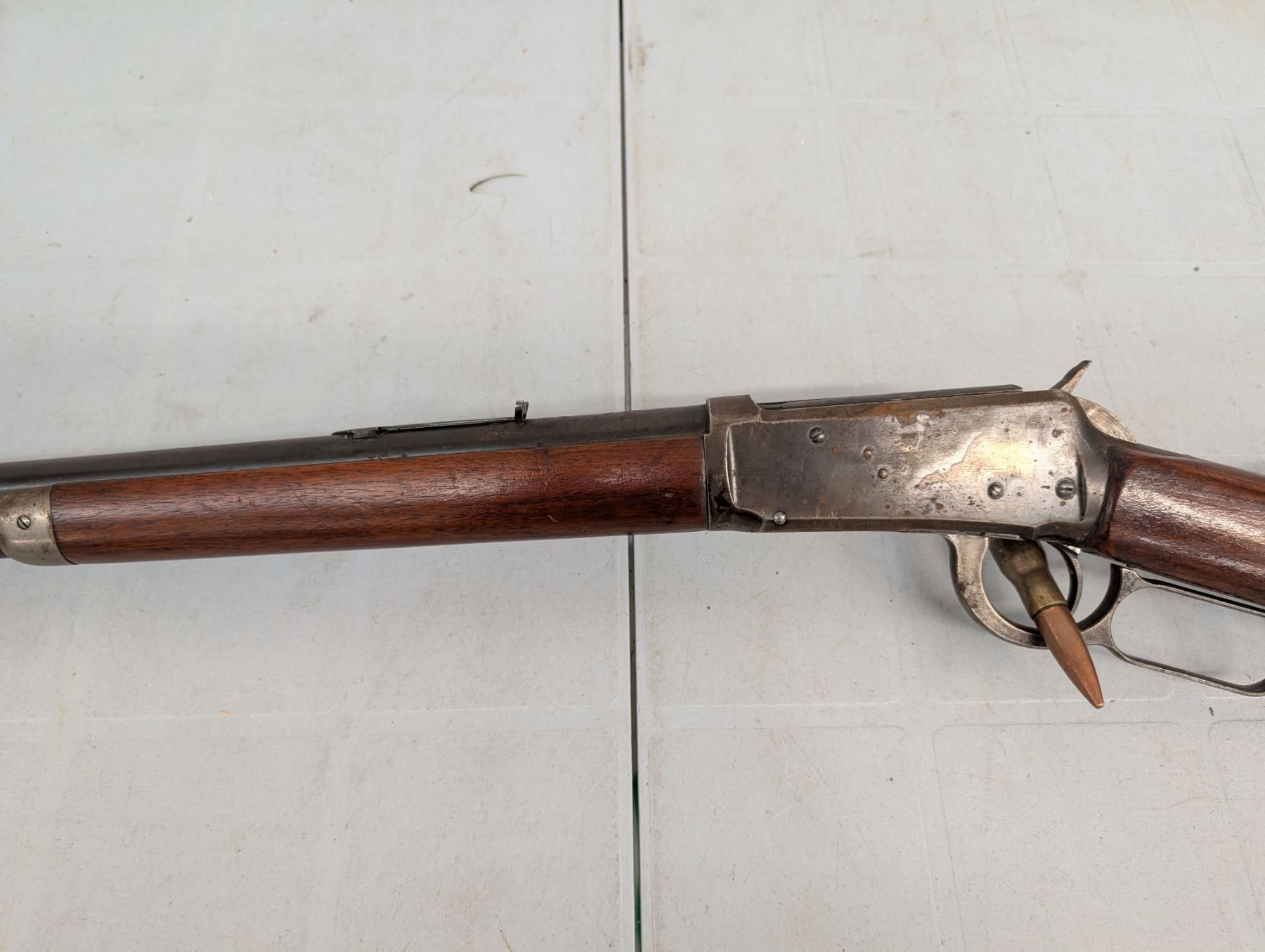 Lever action. DOM 1906. Bore is shiny with good rifling. 26" barrel. Retains approx. 70% of original bluing. Stock is in good condition with no cracks.