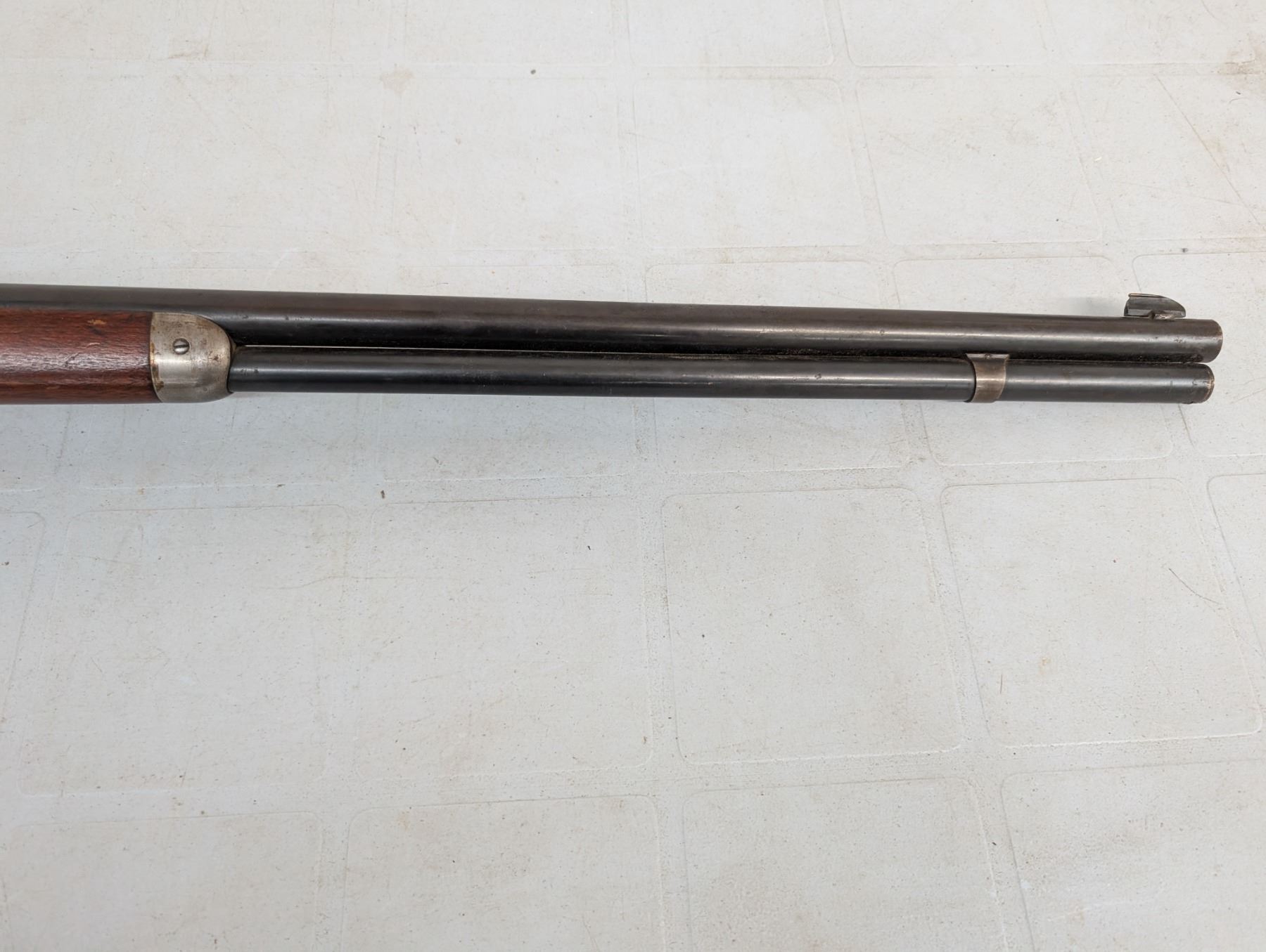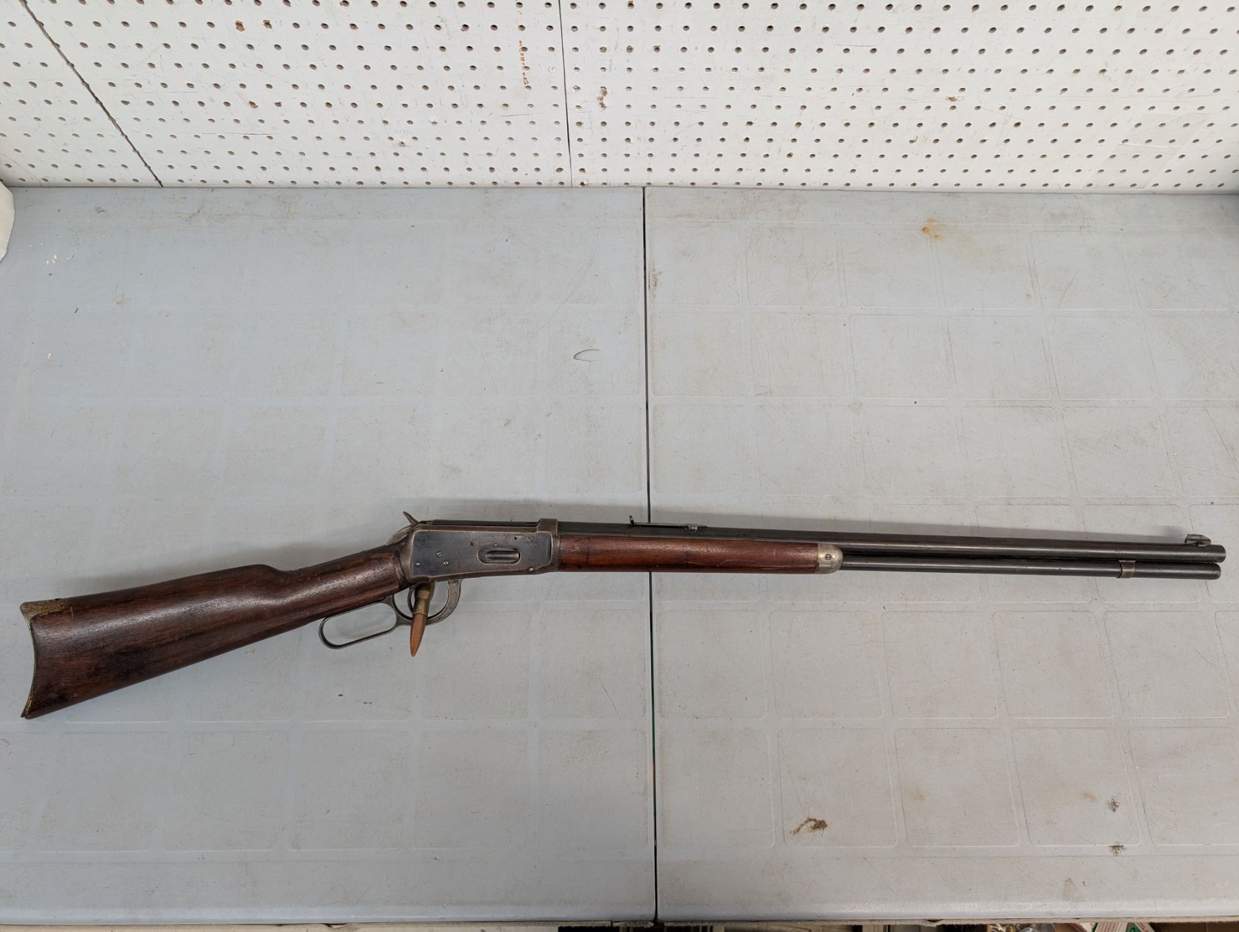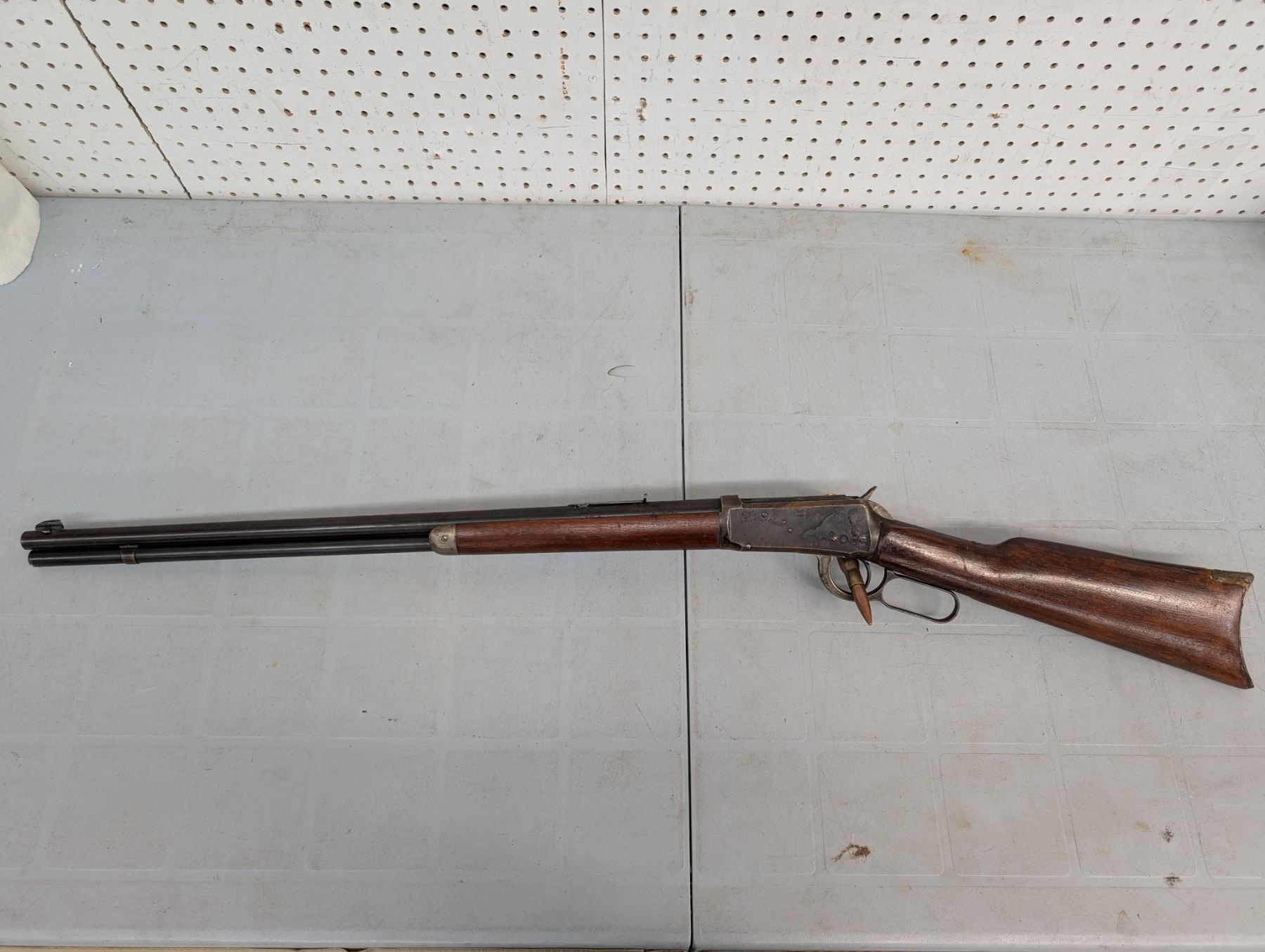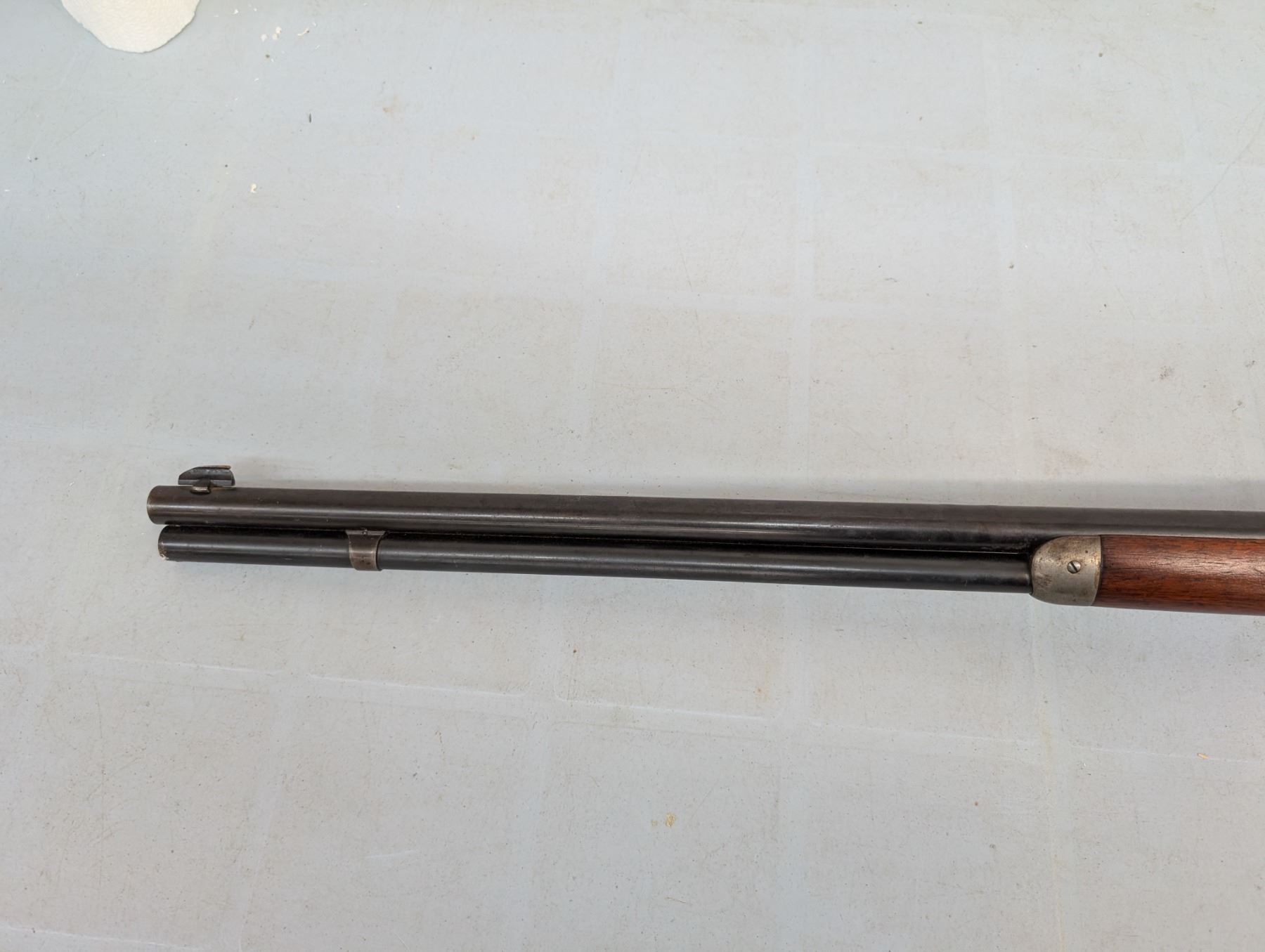 Lever action. DOM 1906. Bore is shiny with good rifling. 26" barrel. Retains approx. 70% of original bluing. Stock is in good condition with no cracks.