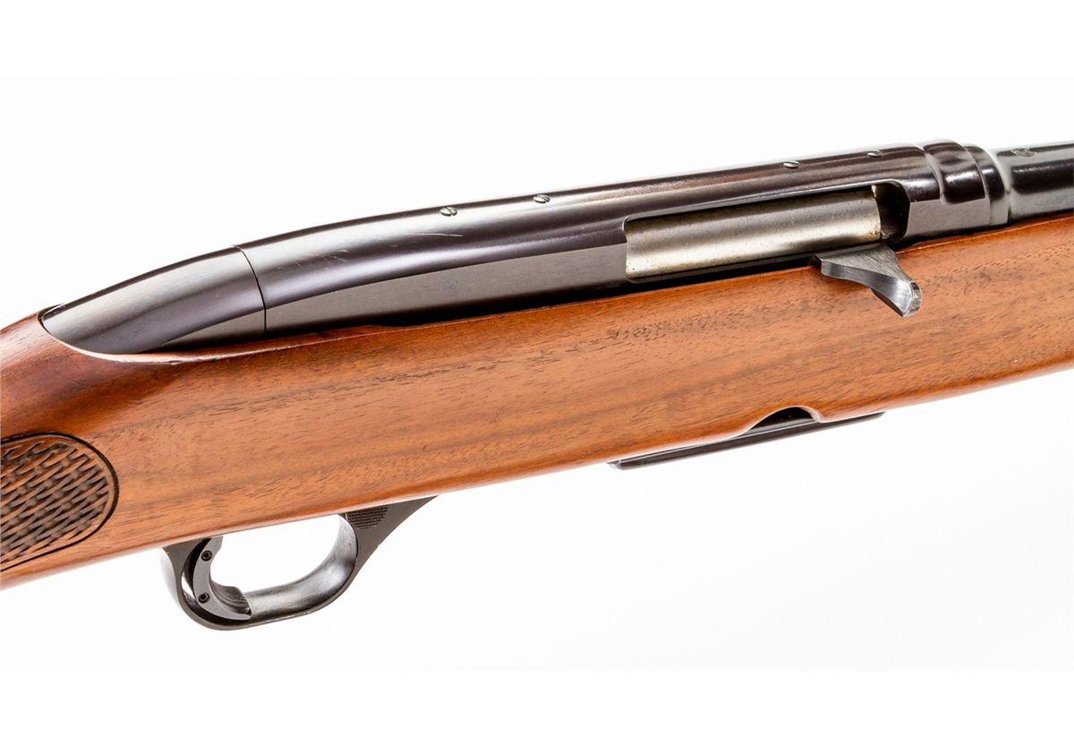Winchester Model 100 Semi-Automatic Rifle, #A217953, .308 cal., 22'' barrel, blue finish, pressed checkered walnut stock, with brown leather sling and one correct magazine. Mfg'd 1970. Condition is excellent retaining approx. 98% original finish. Stock with light marks from handling. Action is crisp, bore is mirror bright. Est.: $500-$750. (Modern)