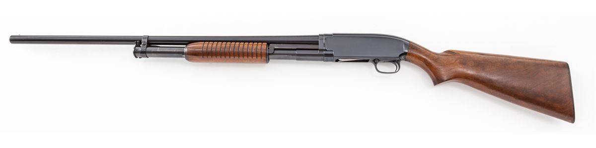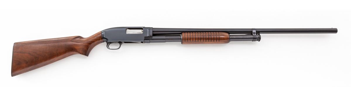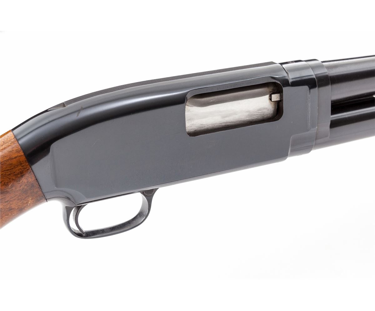 Winchester Model 12 Pump Action Shotgun, #1350127, 12 ga., 28'' round barrel choked Mod. For 2-3/4'' shells, blue finish, walnut stock. Mfg'd 1953. Condition is excellent showing only the slightest marks in actioning areas. Est.: $600-$800. (C&R)