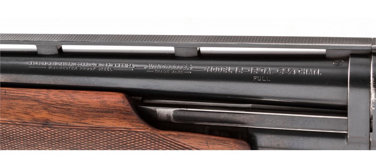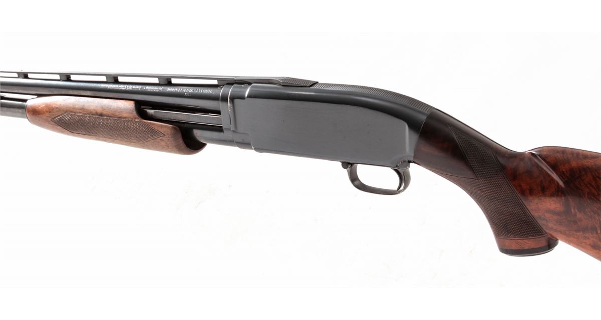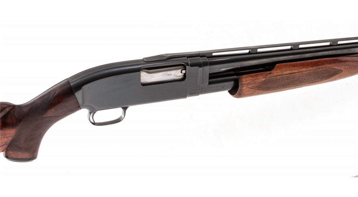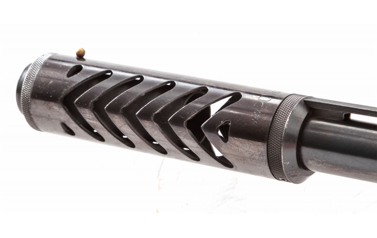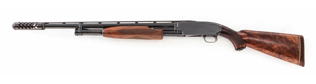 Winchester Model 12 Pump Action Trap Shotgun, #1119162, 12 ga., barrel shortened to 23'' with Power Pac muzzlebrake and choke system; blue finish, fancy checkered walnut stock with rubber butt pad. Factory vent rib. Mfg'd 1948. Condition is near excellent as modified with later accomplished blue finish showing high edgewear at barrel extension and smooth parts of receiver. Stock with scuffs and scratches and flattening to checks. Good action and bore. Pistol grip cap with added pewter duck motif. Est.: $450-$600. (C&R)