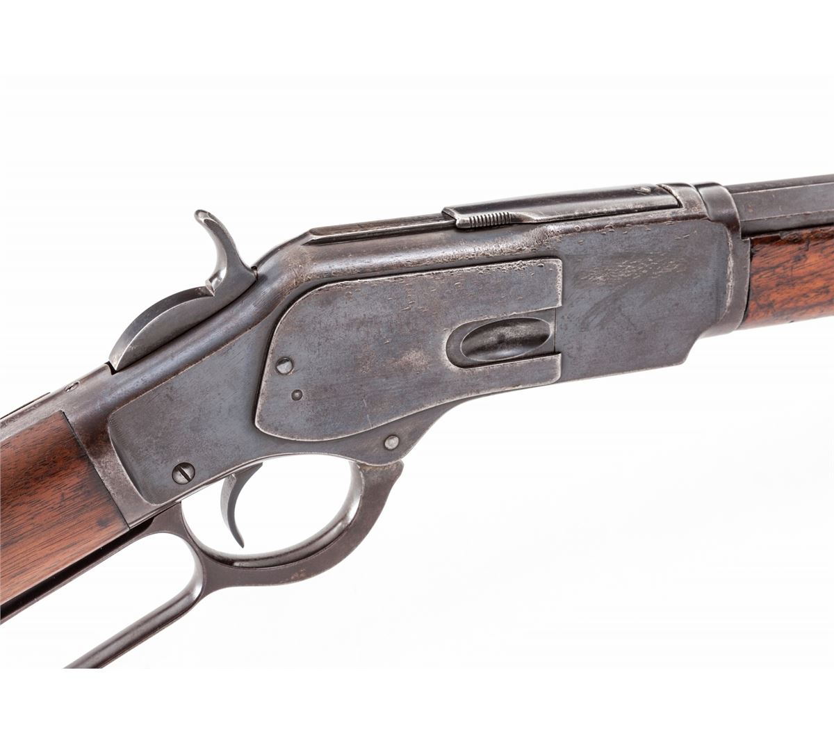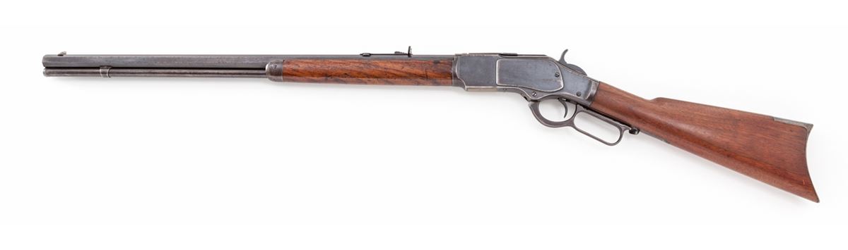 Winchester Model 1873 Lever Action Rifle, #552335, .32-20 cal., 24'' octagon barrel, blue finish, walnut stock, with standard sights. Mfg'd 1900. Condition is about fine retaining approx. 85%-90% blue. Buttstock shows evidence of sanding; forend remains unsanded with moderate scratches, oil darkening, and an additional coat of varnish. Action is good, bore is fair. Est.: $1,000-$1,500. (C&R)
