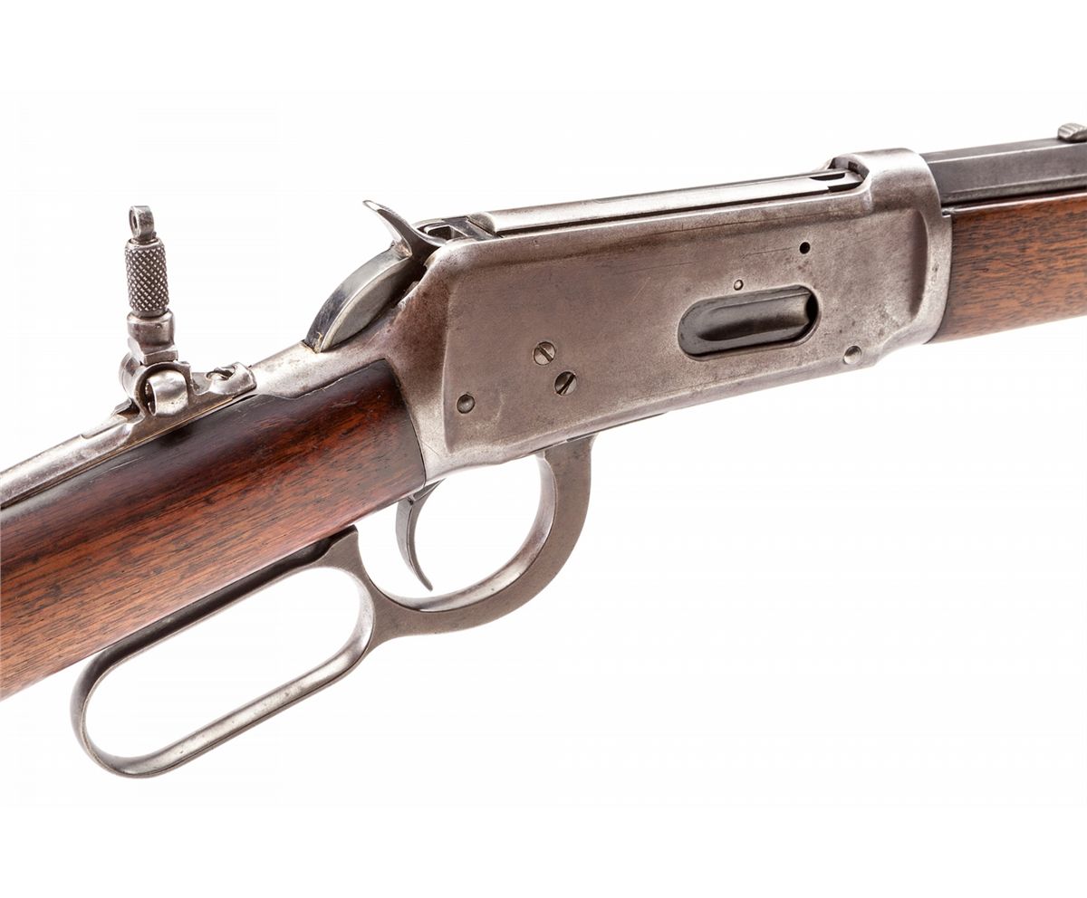 Winchester Model 1894 Lever Action Rifle, #852697, .30 WCF (.30-30) cal., 26'' octagon barrel, blue finish, walnut stock and handguard, with period Marbles tang rear sight and white bead No. 3 front sight. Mfg'd 1919. Condition is very good retaining approx. 90% blue to barrel and mag tube; 30% thinning and toning blue to frame. Stock with oil darkening, scuffs and scratches. Rear tang screw slot with some distortion. Action is crisp, bore is very good. Est.: $1,000-$1,500. (C&R)