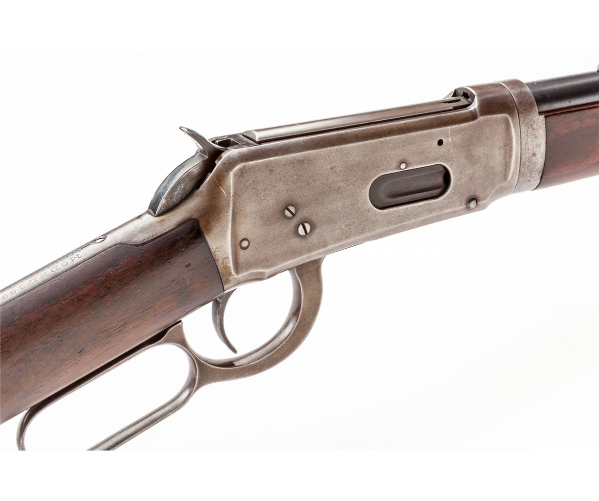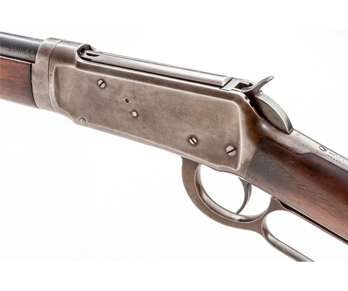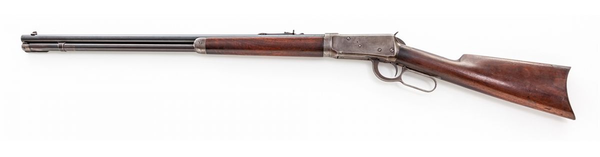 Winchester Model 1894 Lever Action Takedown Rifle, #879976, .30-30 cal., 26'' barrel, blue finish, walnut stock, standard front and rear sights. Mfg'd 1920. Condition is very good to near fine. Barrel and magazine tube retain approx. 96% thinning and toning blue with most of the losses at actioning area of magazine tube. High nickel content frame has flaked and toned a light even gray. Stock is unsanded with light pressure dings and minor scuffs, with some oil darkening near metal contact points. Action is crisp, bore is fine. Est.: $1,200-$1,800. (C&R)