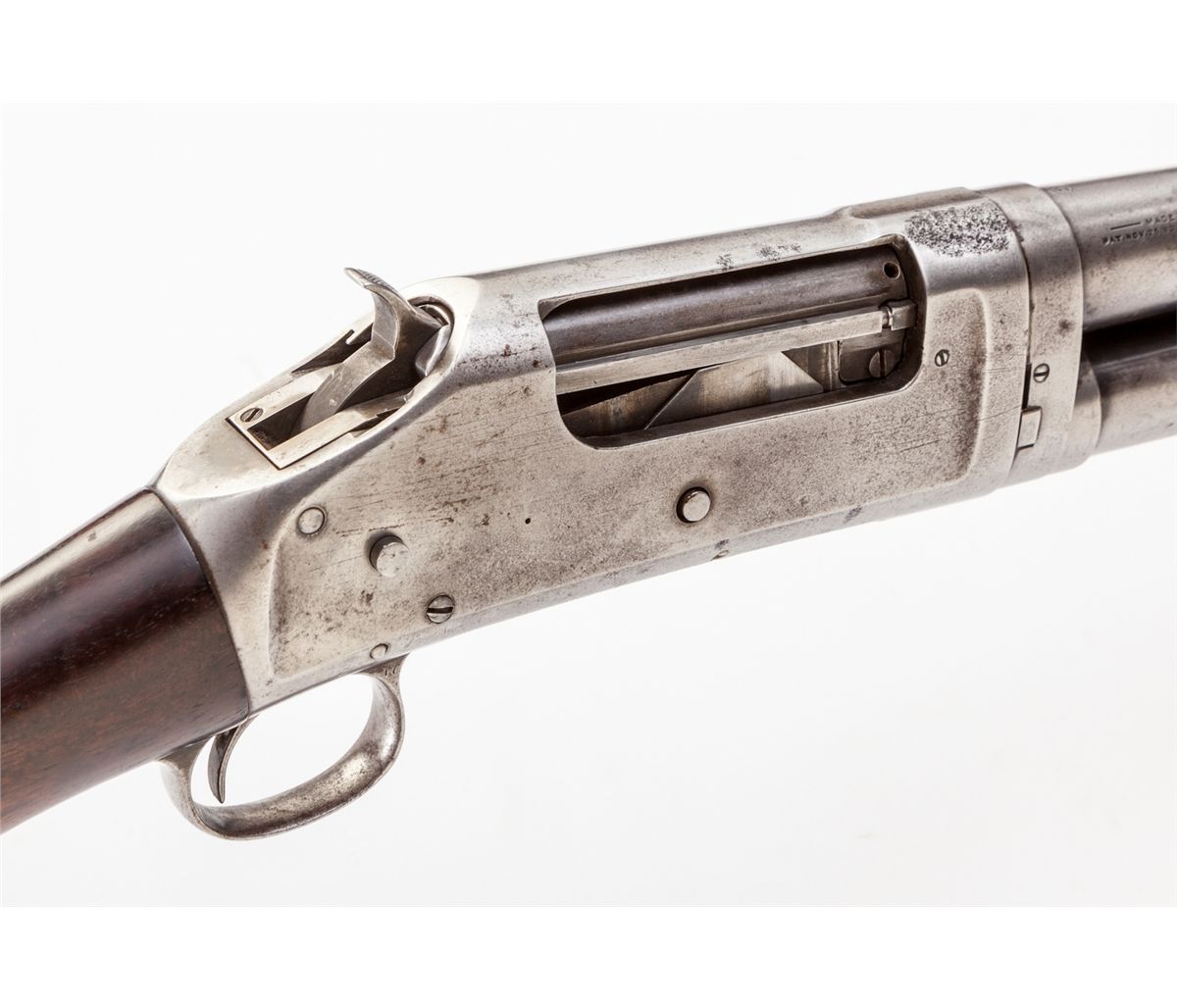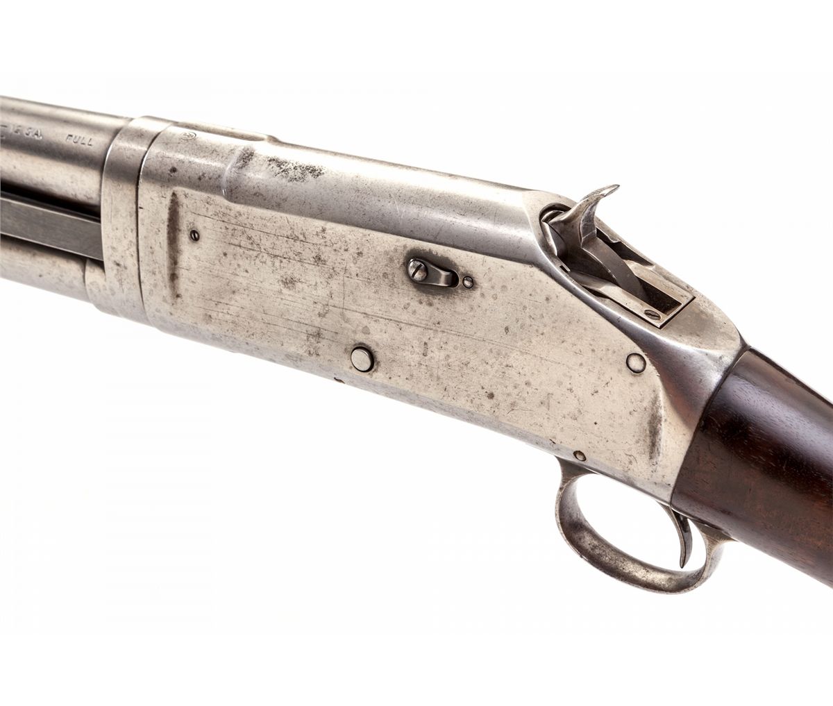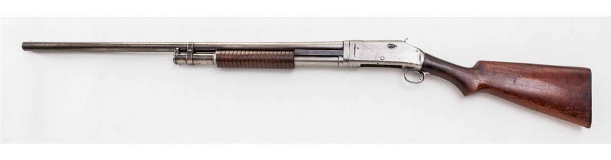 Winchester Model 1897 Pump Action Shotgun, #840634, 12 ga., 30'' barrel choked Full, originally with blue finish, walnut stock, with factory hard rubber butt pad. Mfg'd 1936. Condition is very good retaining approx. 30% blue with receiver having gone bright. Stock retains approx. 65% original varnish. Action is good and crisp, bore is mirror bright. Est.: $400-$600. (C&R)
