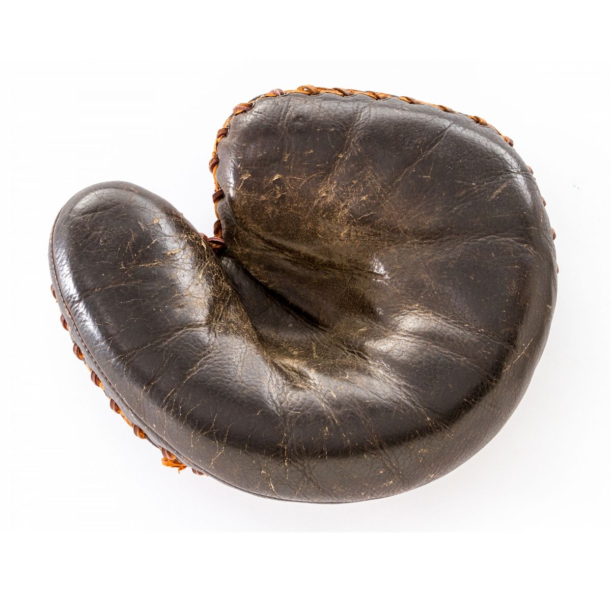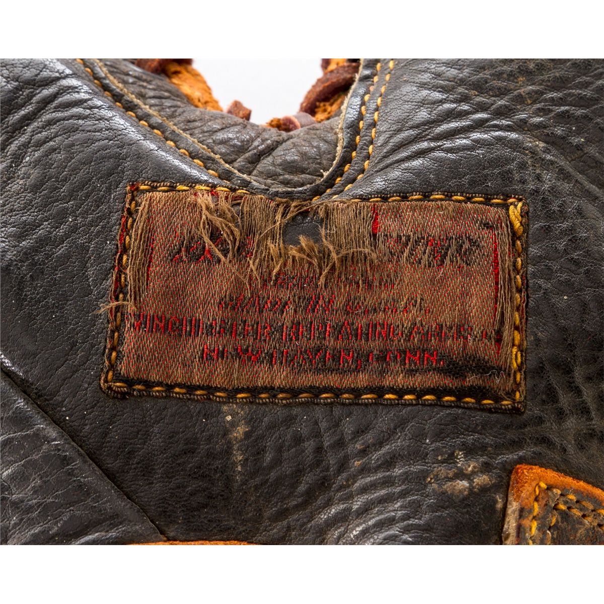 Winchester Model 2056 Pre-War Catcher's Mitt, made of specially selected chocolate calf's skin, felt hand-formed, and making a deep pocket, with black leather roll style binding, leather welted seams, tan rawhide laced, and buckle fastening with non-chafing wrist protector. Condition is excellent. Original Winchester tag shows some minor fraying but is completely legible. Markings inside the face of glove are faint. Rawhide lacing is a somewhat later replacement. Est.: $750-$1,000.