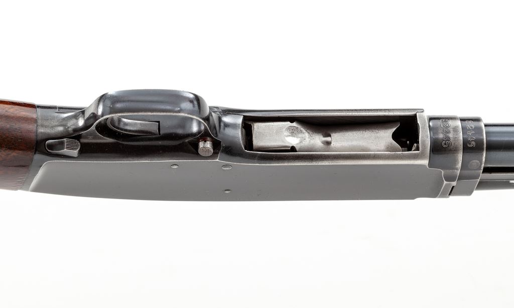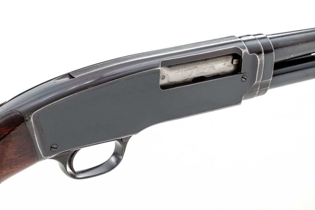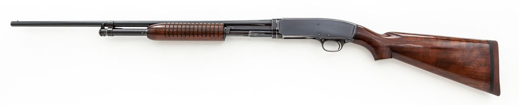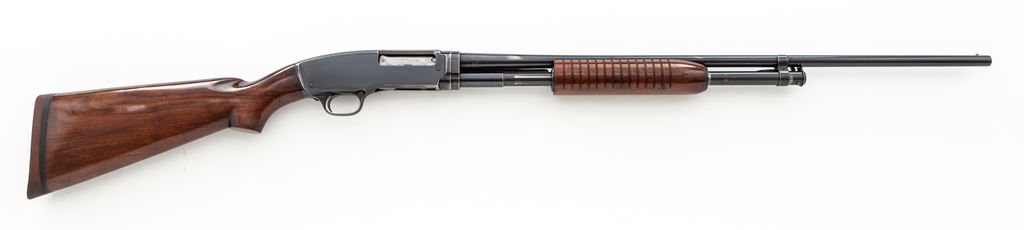 Winchester Model 42 Standard Grade Slide-Action Shotgun, #82445, .410 bore. 28'' plain barrel has a 3'' chamber and is choked Mod. 14-groove post-war forend and uncheckered pistol-grip buttstock are of American walnut with some figure; length of pull is 14-1/8'' to a solid red Winchester butt pad. Mfg'd 1950. Condition is near excellent with approx. 95% blue on receiver, showing only edgewear from carry. Wood has a few small nicks and bumps, but no serious gouges. Action shows little use and functions crisply; bore is bright. A very nice original Model 42. Est.: $900-$1,400. (C&R)