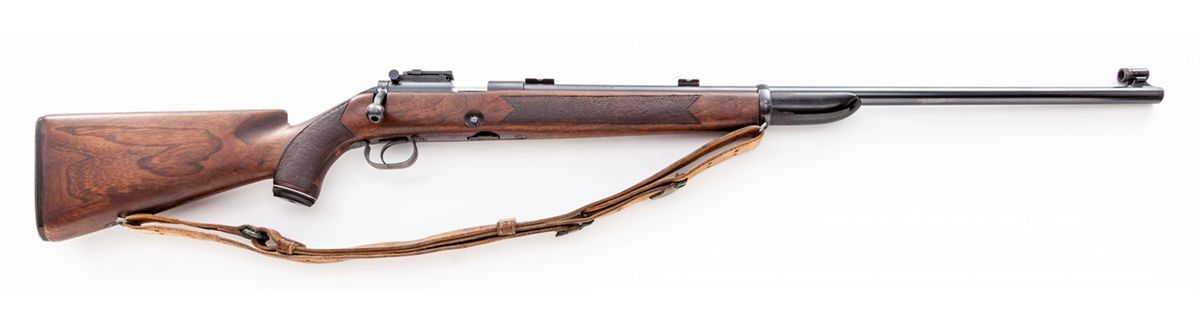 Winchester Model 52 Bolt Action Target Rifle, #33854, .22 LR cal., 28'' barrel, blue finish, custom checkered walnut stock with pistol grip. Dovetail sight blocks, standard rear and globe front sights. Mfg'd 1936. Condition to metal parts is excellent retaining approx. 97% original blue finish with nearly all the losses to bottom of triggerguard. Stock with added spacer near buttplate, and shooter-done peened type checkering to pistol grip and forend area. Crisp action, light trigger, bright bore. Est.: $500-$750. (C&R)