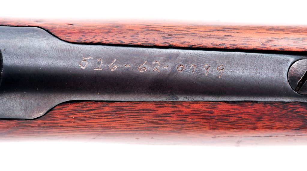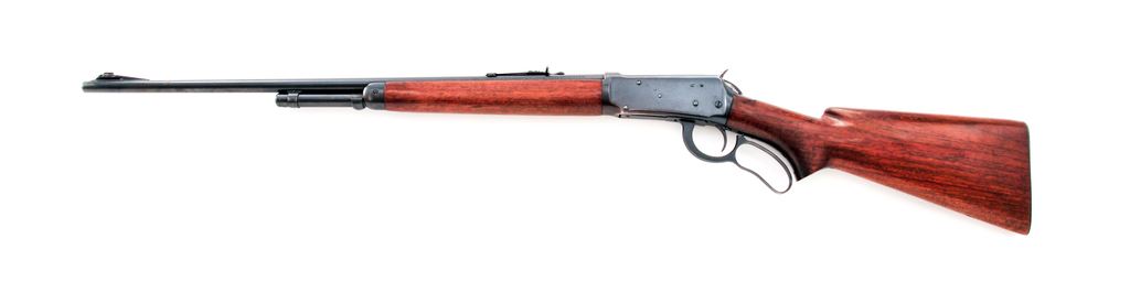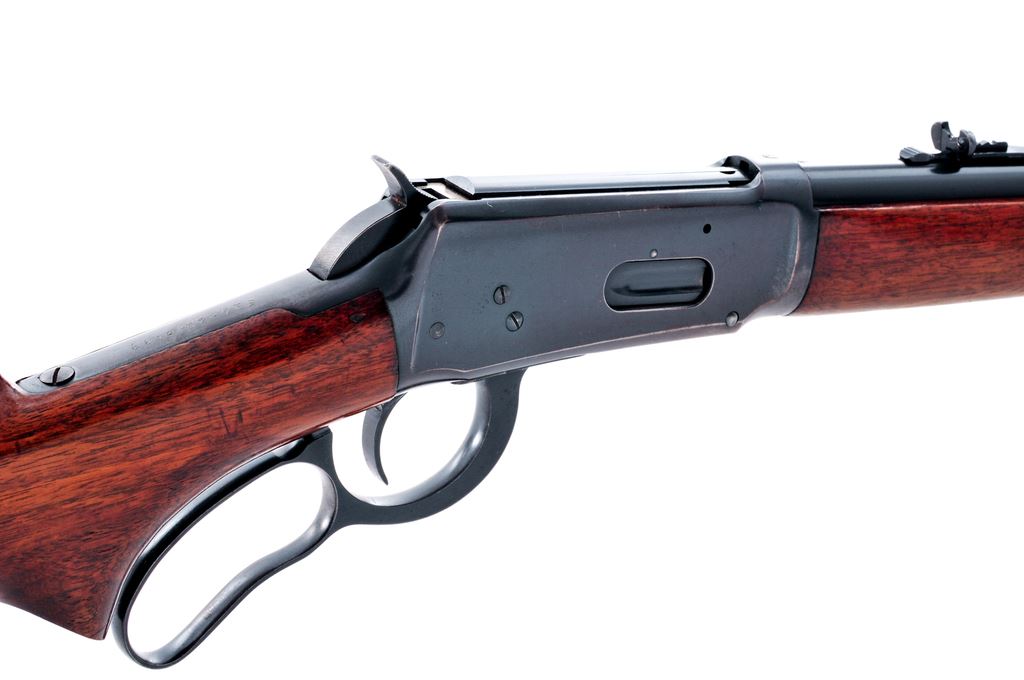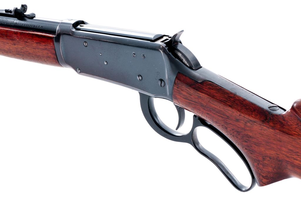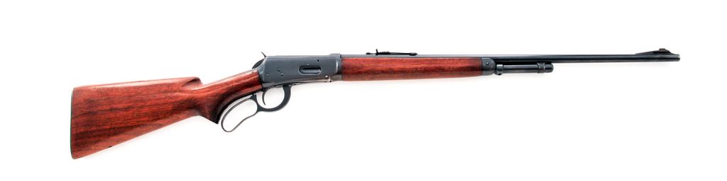 Winchester Model 64 Lever Action Rifle, #1411891, .30 WCF cal., 24'' round barrel, blue finish, pistol-grip walnut stock with checkered steel ''widow's peak'' shotgun butt. Rifle also features a dovetailed front sight on ramped base and a sporting rear sight with elevator. Magazine tube with a sling swivel collar; missing stud and swivel. Top of barrel and receiver are both Winchester proofed. Upper tang with social security number electro penciled into the surface. Mfg'd 1943-1948. Condition is very good with approx. 92% blue remaining showing some light toning and high edgewear on receiver. Left side of barrel near the front sight with one .25'' circular spot of finish loss. Wood with scattered small impressions and handling marks; finish shows some thinning in handling areas. Bottom edge of buttstock with a small hole from a previous swivel stud; pistol grip cap with a circular wood plug with two visible brass pins. Barrel address is clear and well defined. Action and bore are both excellent. Est.: $600-$800. (C&R)