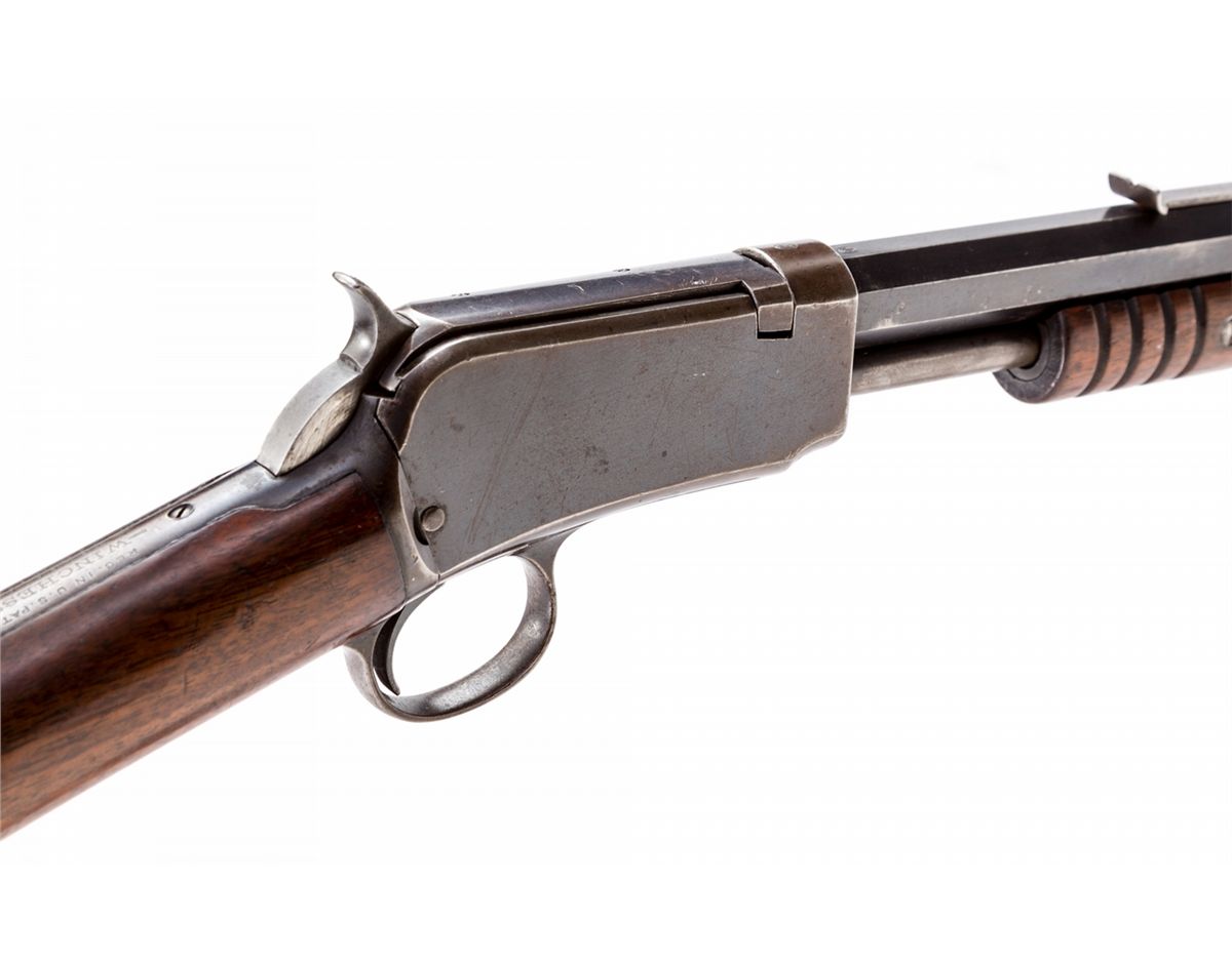 Winchester Model 90 Pump Action Rifle, #404290, .22 WRF cal., 24'' octagon barrel, blue finish, walnut stock with crescent buttplate. Mfg'd 1910. Condition is about fine retaining approx. 92% original factory blue with light areas of toning at top of frame and thinning to finish at both tangs and balance point. Stock with light dings and scuffs, but still retaining approx. 90% of its varnish (less so on forend). Action is crisp, bore is excellent. Est.: $800-$1,200. (C&R)