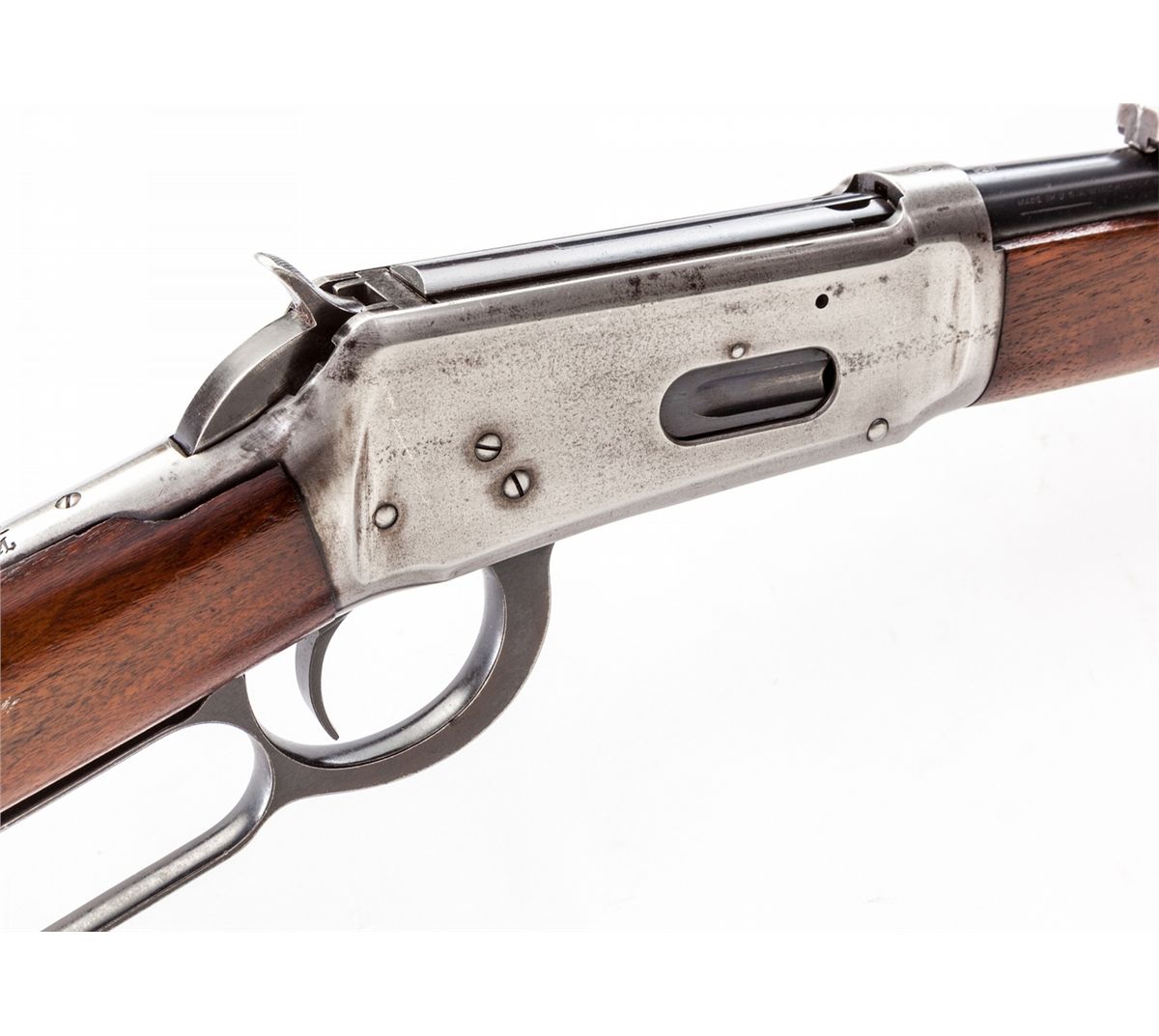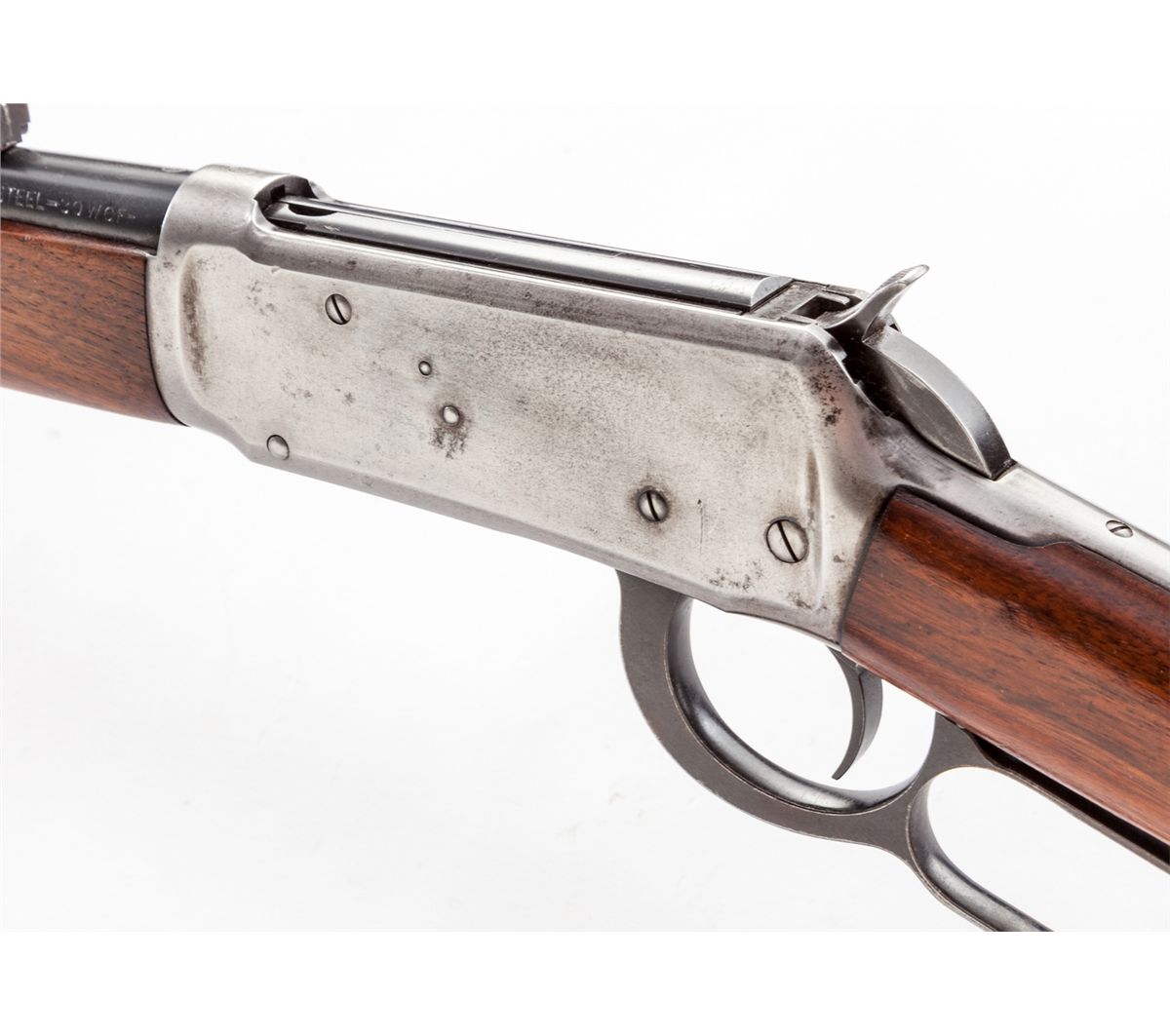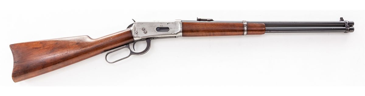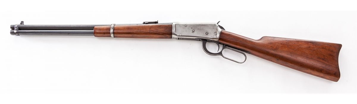 Winchester Model 94 Lever Action Carbine, #1054113, .30-30 cal., 20'' barrel, blue finish, smooth walnut stock and forend, with standard rear and high white bead front sight. Mfg'd without a saddlering in 1928. Condition is about fine. Barrel and mag tube retain approx. 95% slightly thinning blue. Frame has flaked and only has light amounts of finish near stock and tang. Lever, trigger, bolt, hammer and lower tang retain approx. 92% factory blue. Stock with light scuffs from handling and nice even oil finish. Action is good, bore is bright. Est.: $600-$800. (C&R)