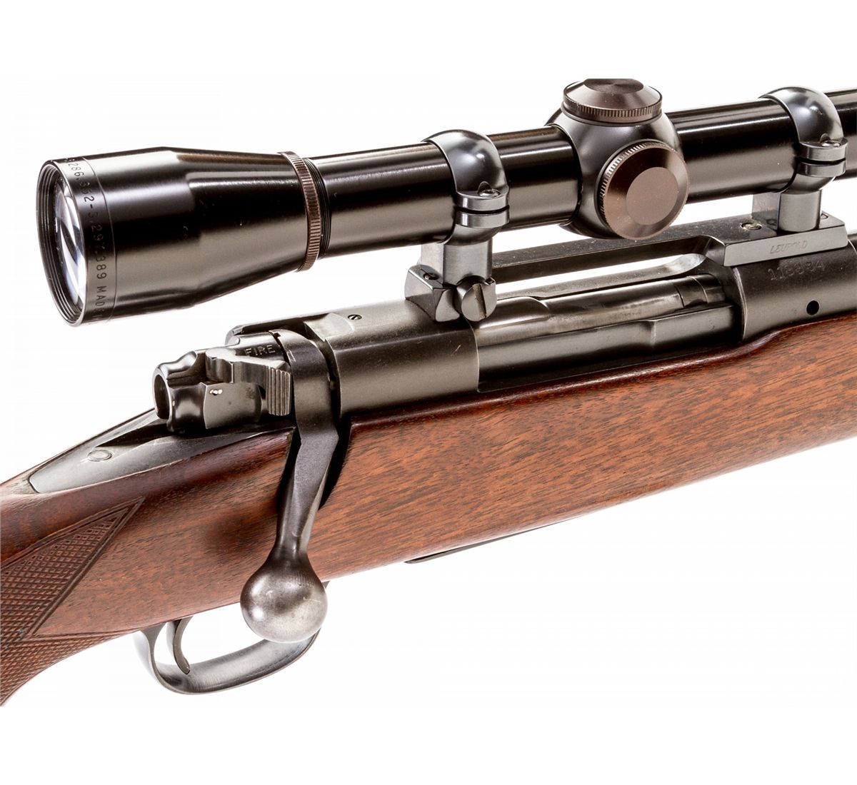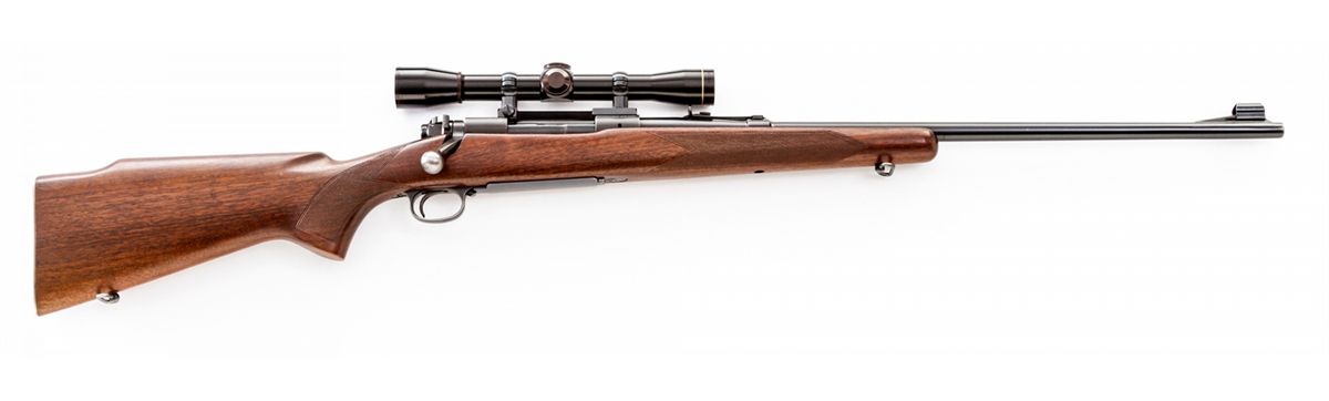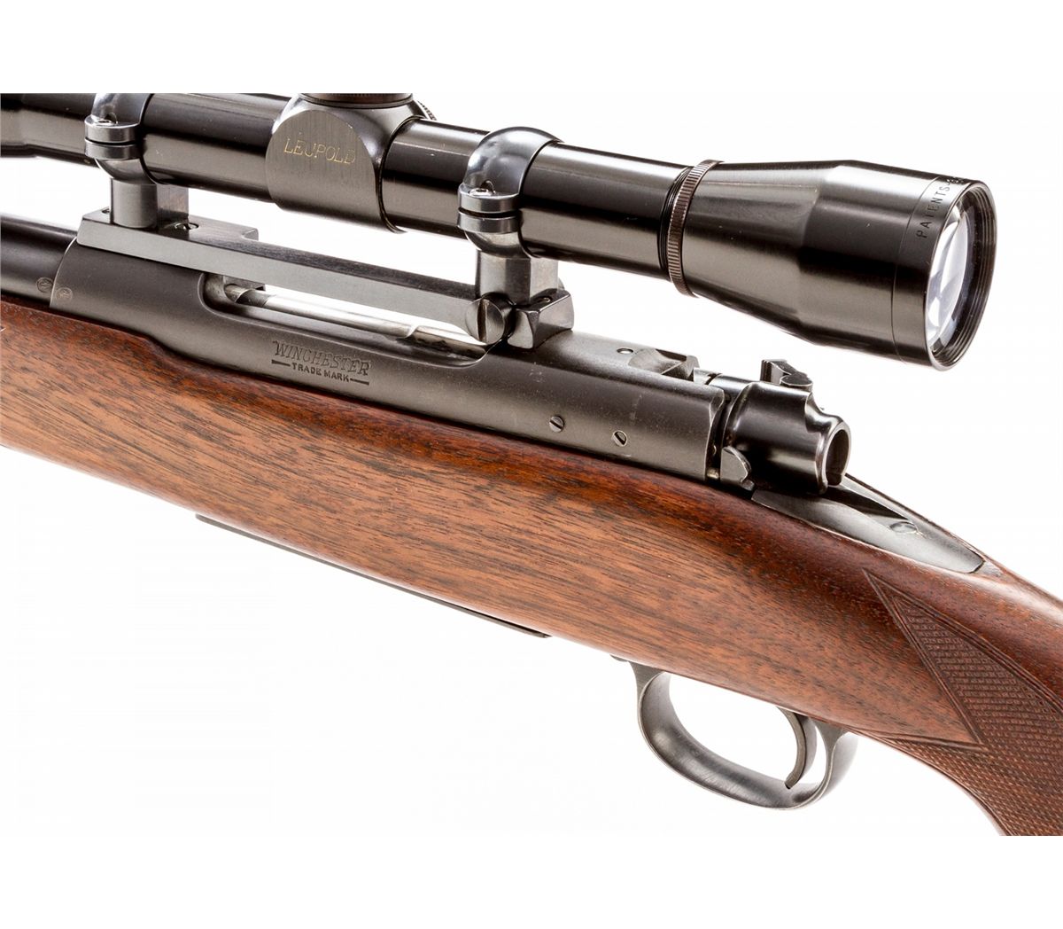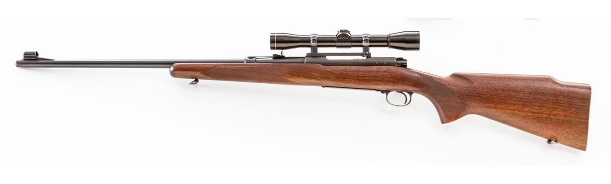 Winchester Pre-64 Model 70 Bolt Action Rifle, #118834, .270 WCF cal., 24'' barrel, blue finish, walnut stock, with original checkered steel buttplate. Iron sights are present, and topped with Leupold M8-4X scope on Leupold mounts and rings. Mfg'd 1949. Condition is excellent showing only light use, with some thinning to high edges of receiver and actioning marks to bolt. Stock is excellent, action is crisp, bore is bright. Est.: $1,200-$1,800. (C&R)