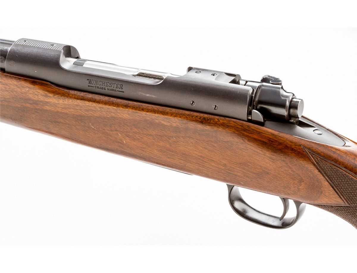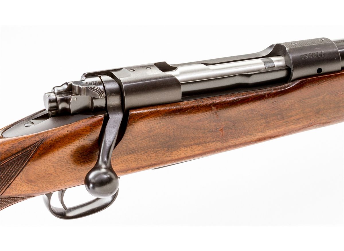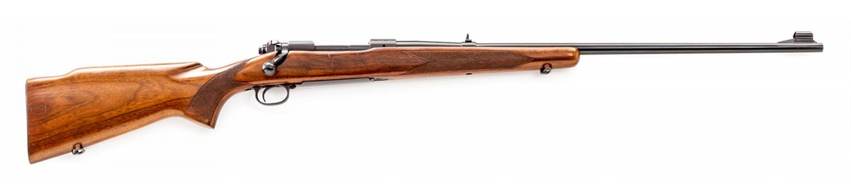 Winchester Pre-64 Model 70 Bolt Action Rifle, #296611, .300 H&H mag. cal., 26'' barrel, blue finish, factory iron sights, unlightened bolt handle, factory checkered walnut stock, with original checkered steel buttplate and sling swivels. Mfg'd 1954. Condition is excellent retaining approx. 98% lightly thinning blue. Stock with light scuffs and scratches. Top of receiver shows very light evidence of a previously installed scope. Action is crisp, bore is fine. Est.: $2,000-$3,000. (C&R)