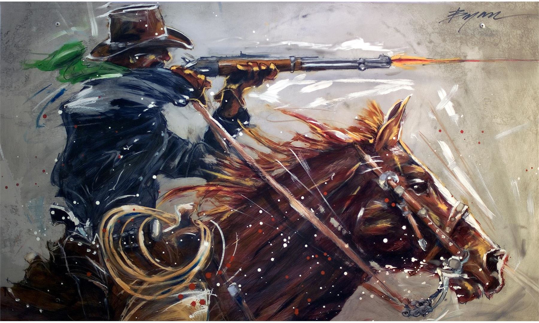 A lover of Classic Westerns from TV & movies, Michael Bryan has created this 23x40" handworked giclee on canvas, numbered 1/1 Unique.