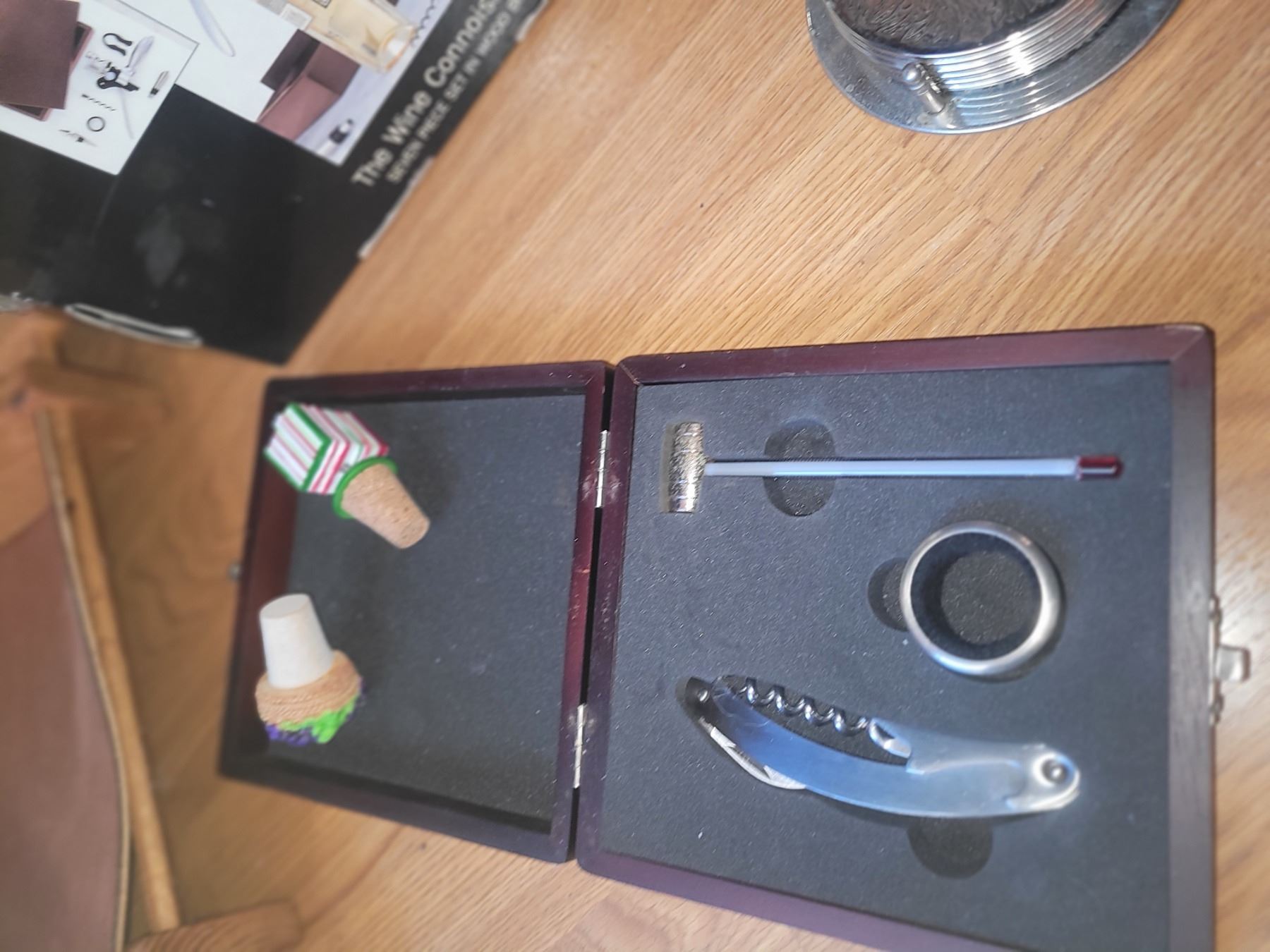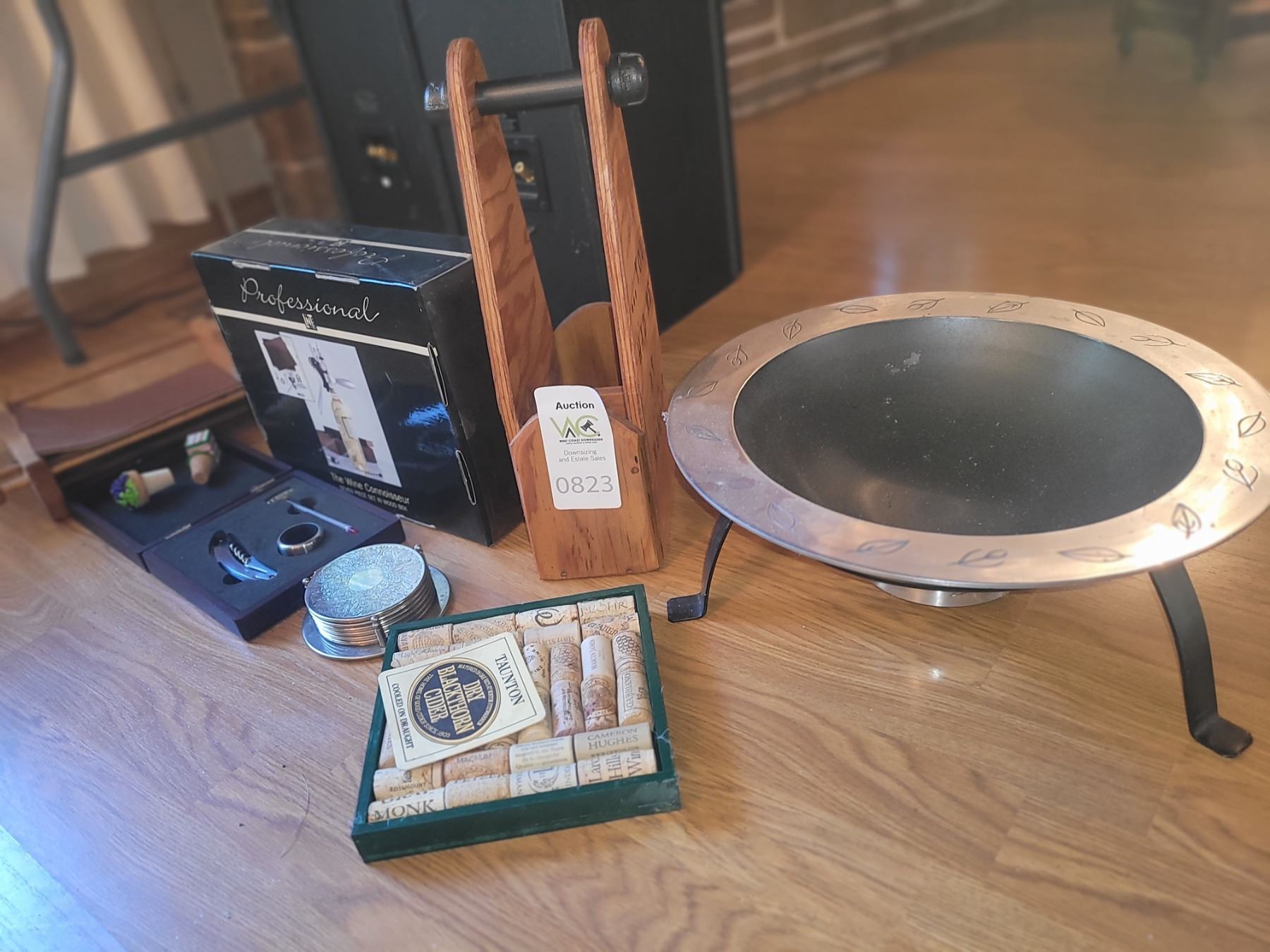 7 piece wine opening kit, wood wine carrier, metal food warmer. Pick up 9-10