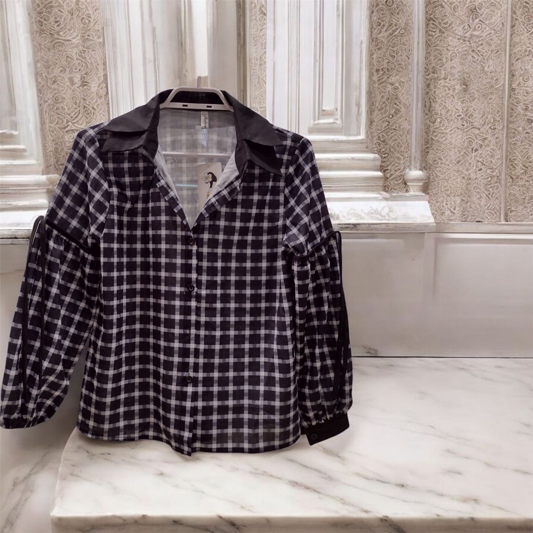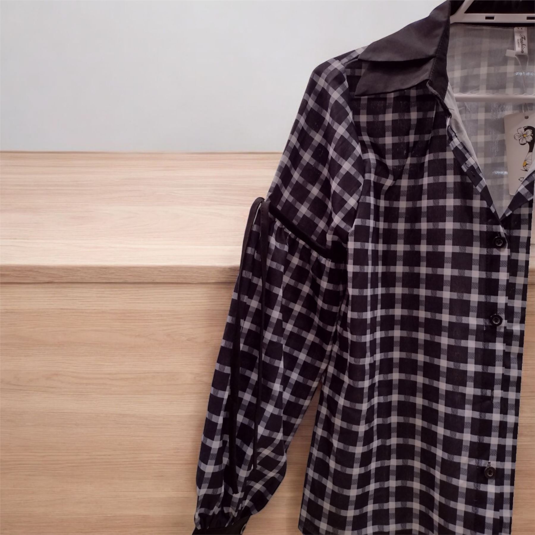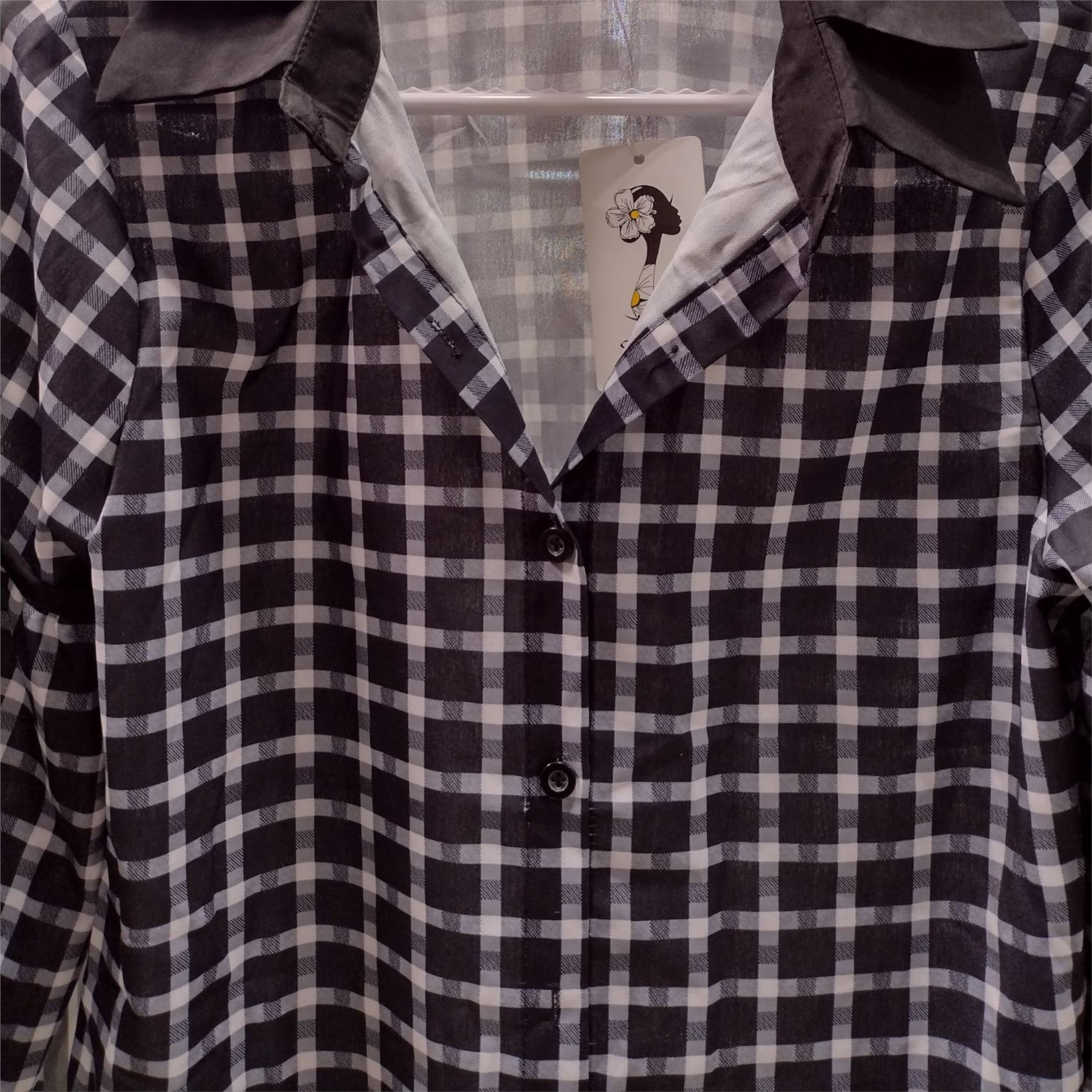 Women ice blue Denim skirt midi with black and greycheck Shirt Size M
