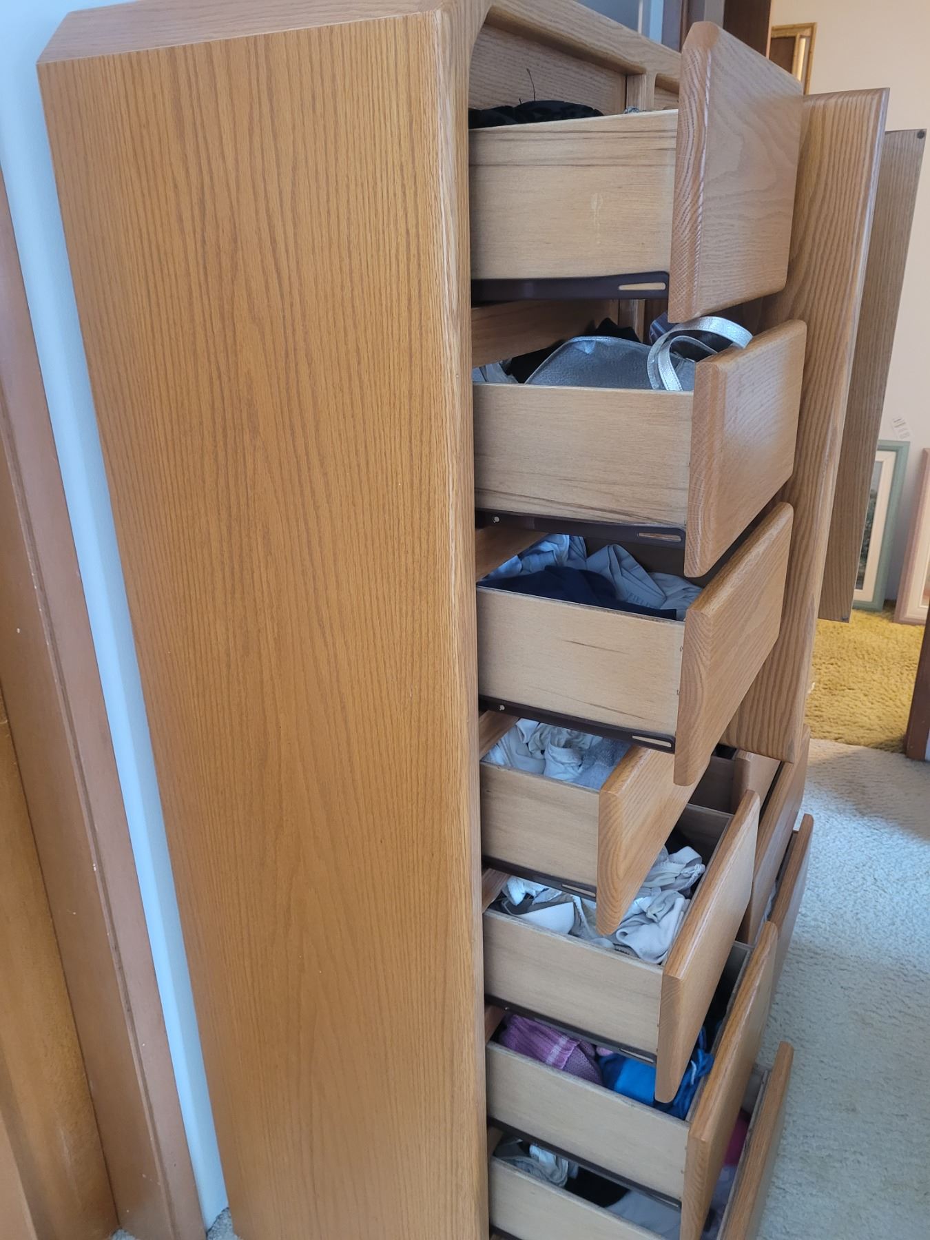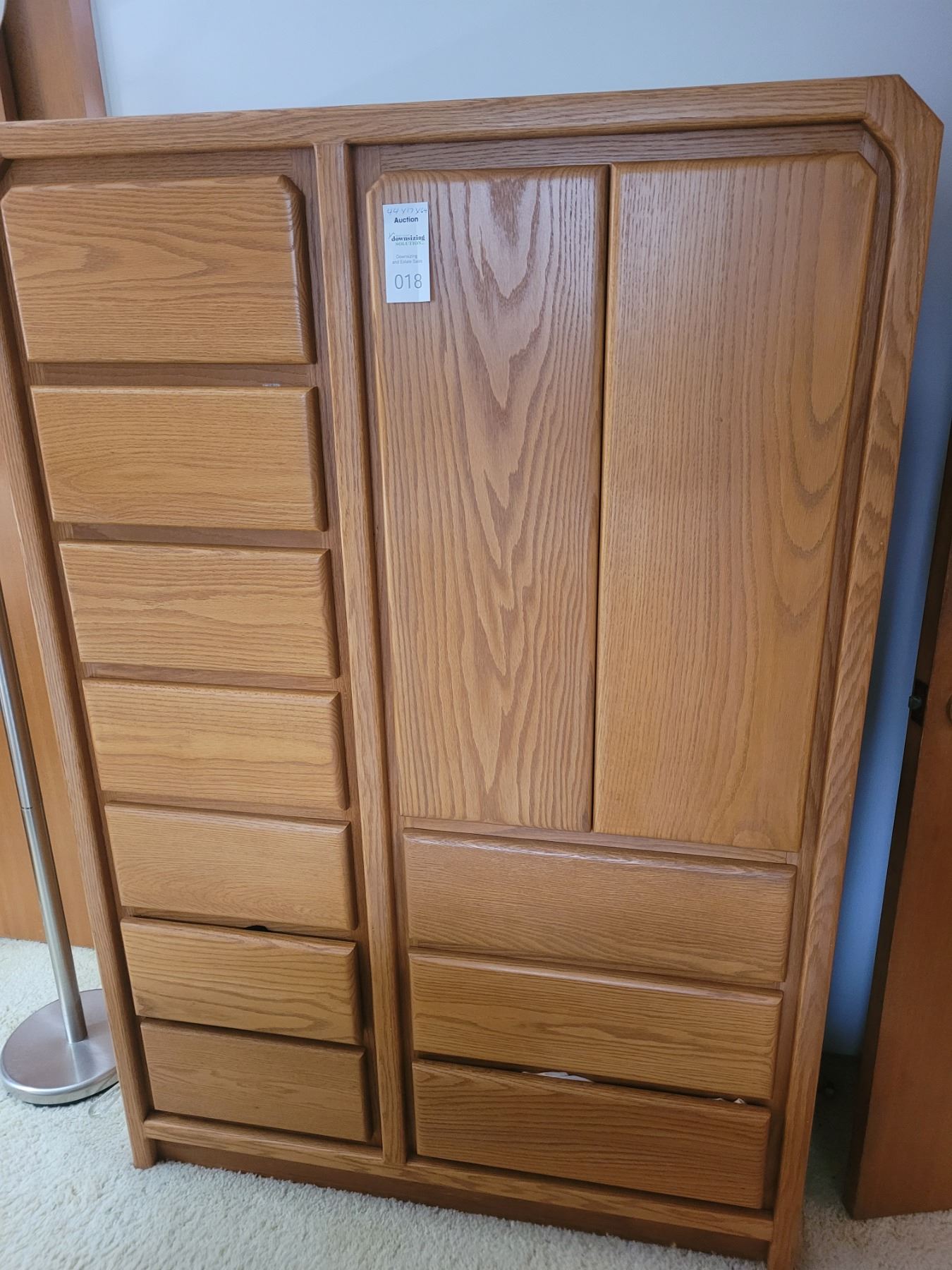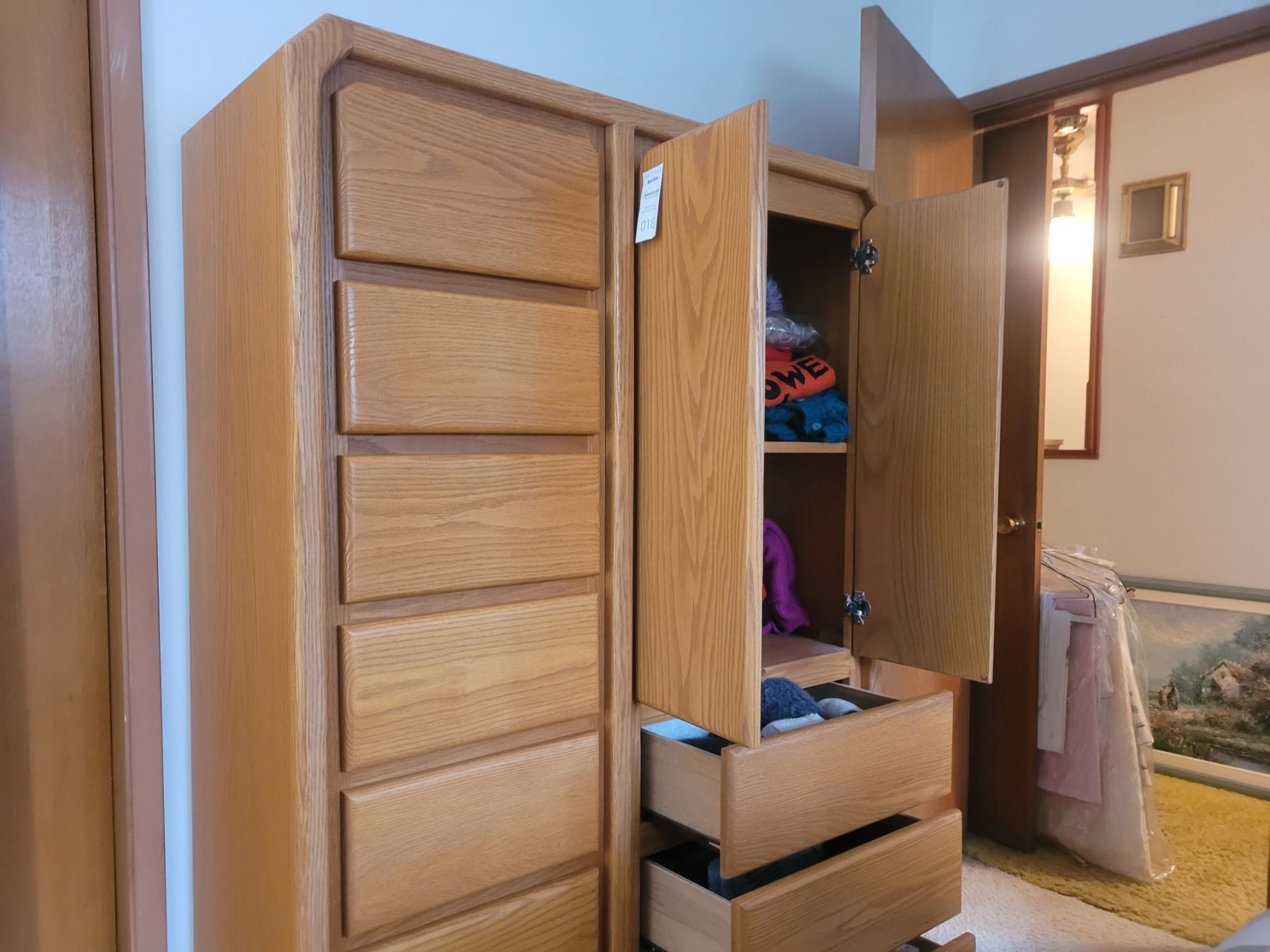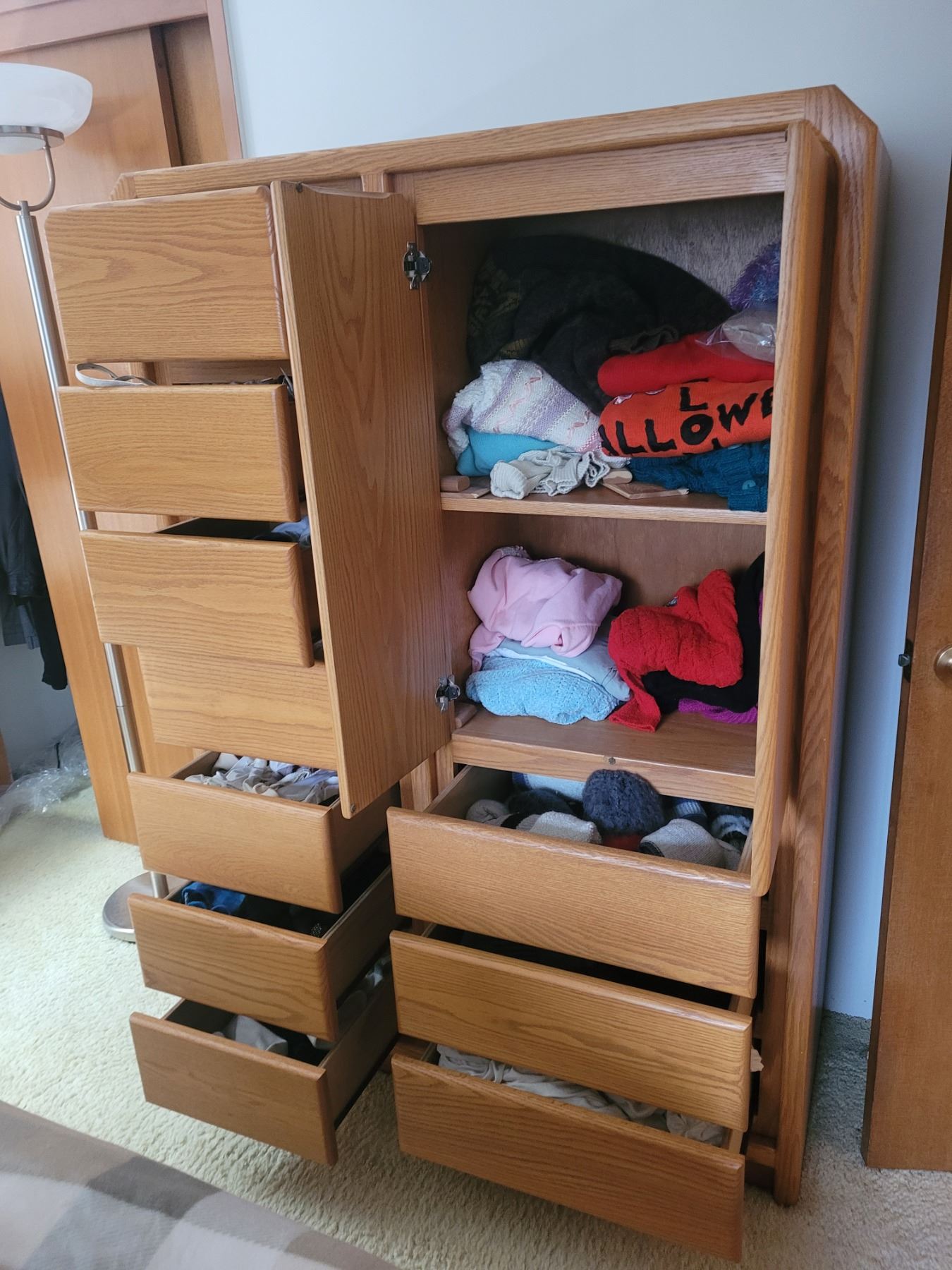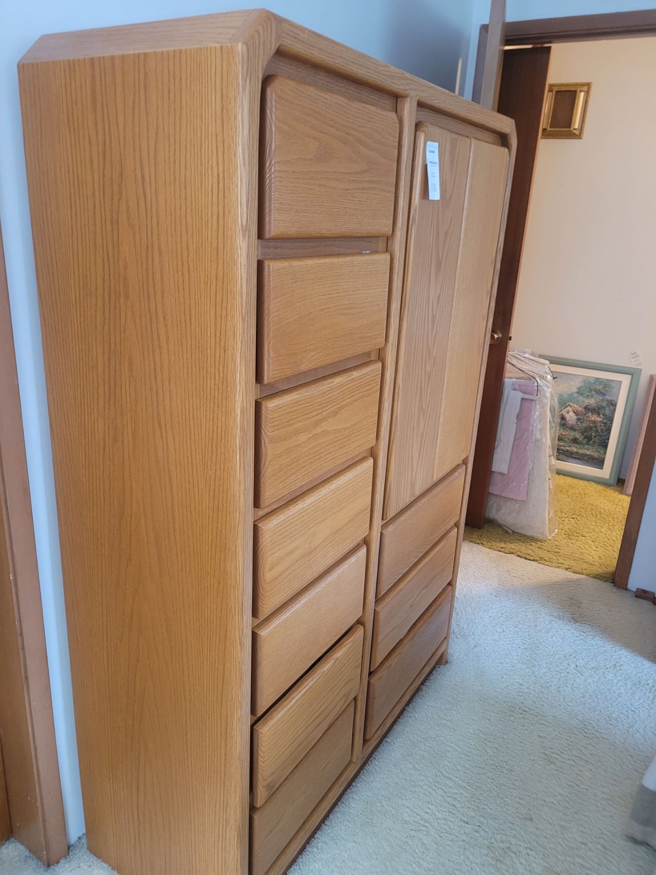 Wood armoire with 10 drawers, cupboard with 2 shelves, 44x17x64. Heavy, bring help to remove, stairs. Pick up 11-12