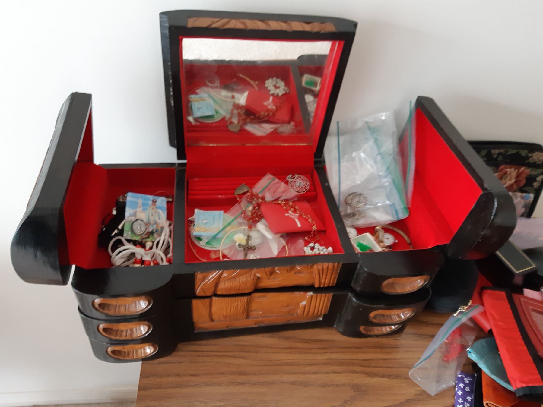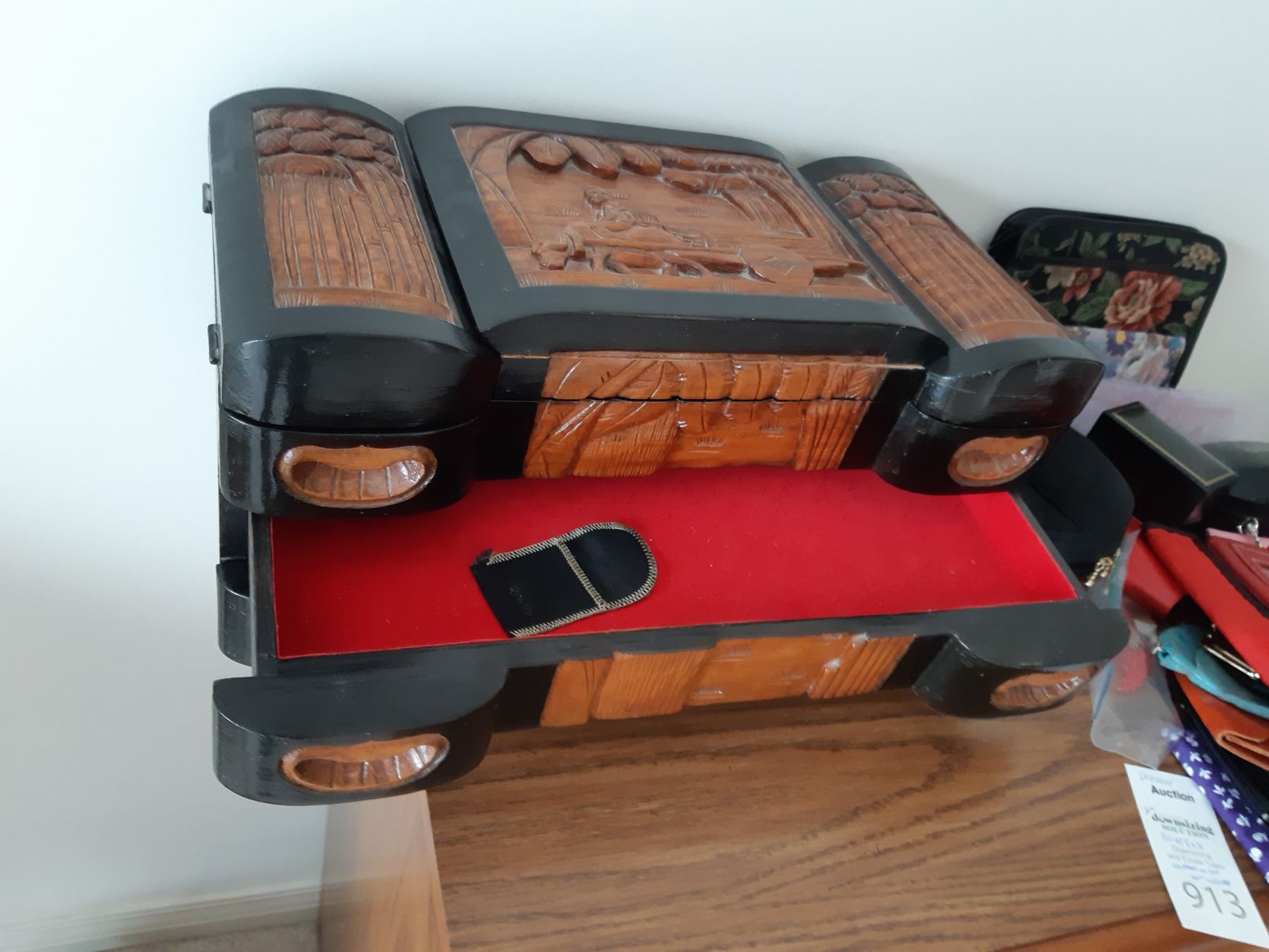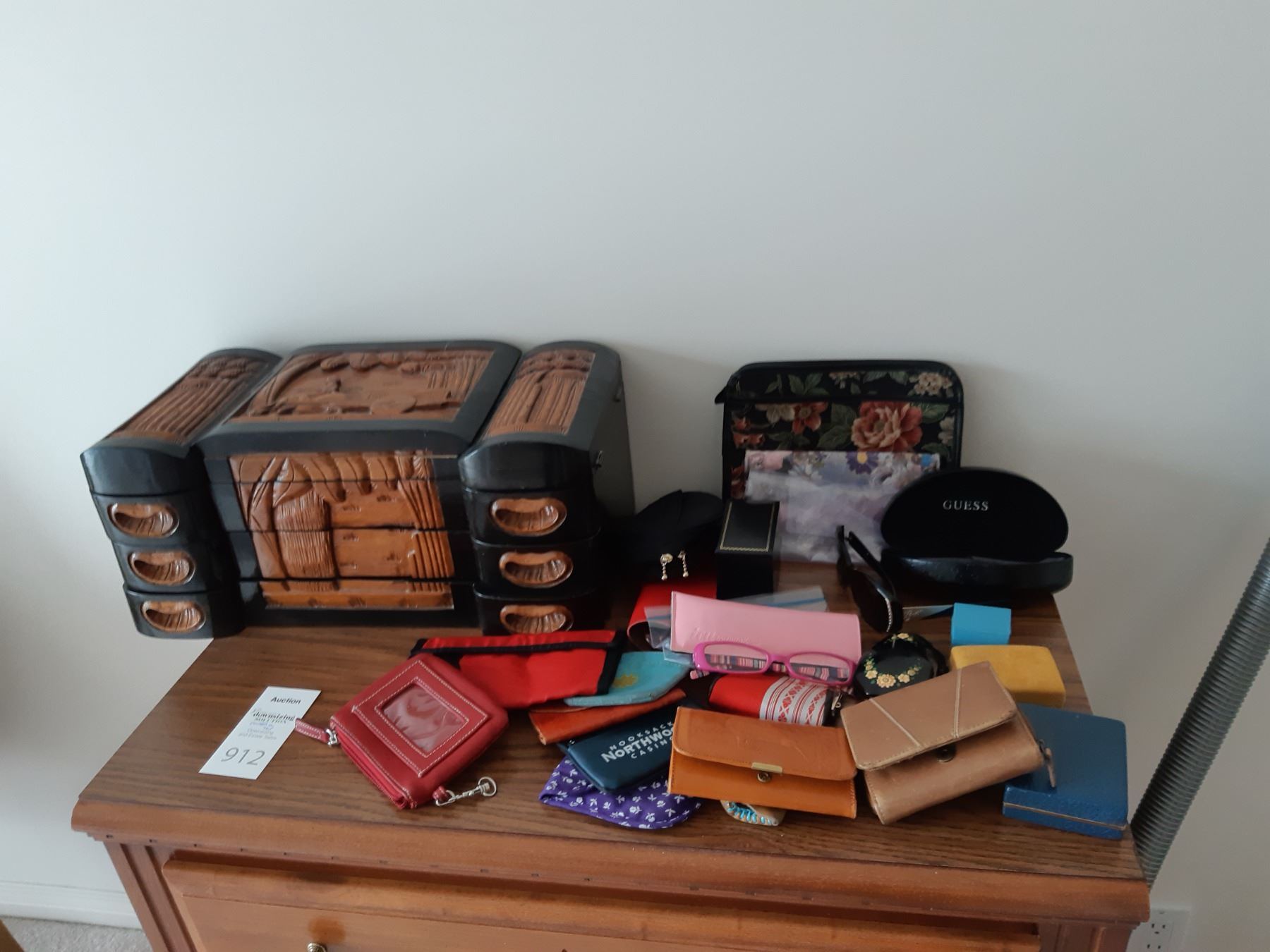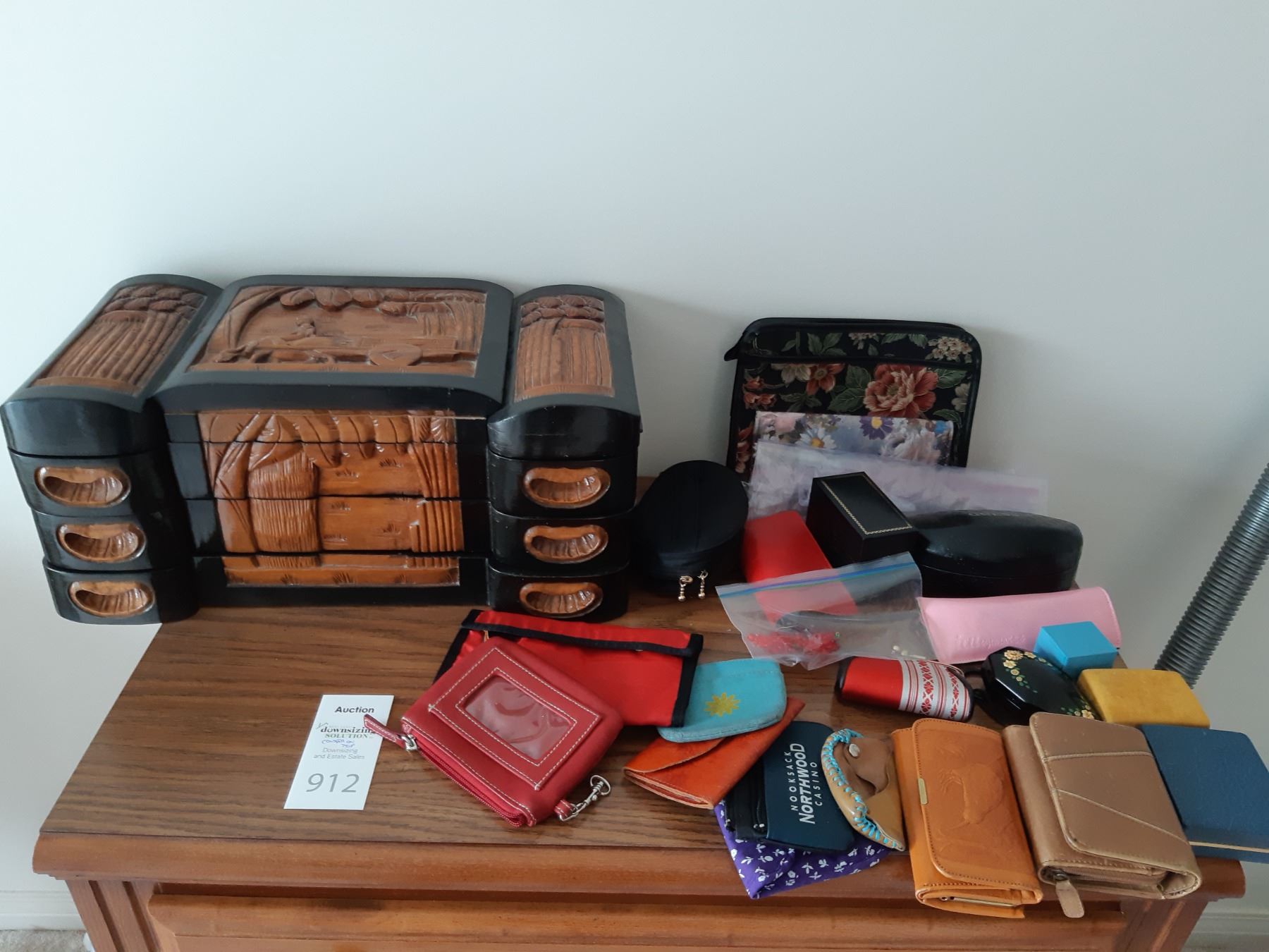Hand Carved Jewelry Box, collection of wallets, costume jewelry. Pick up 9-11