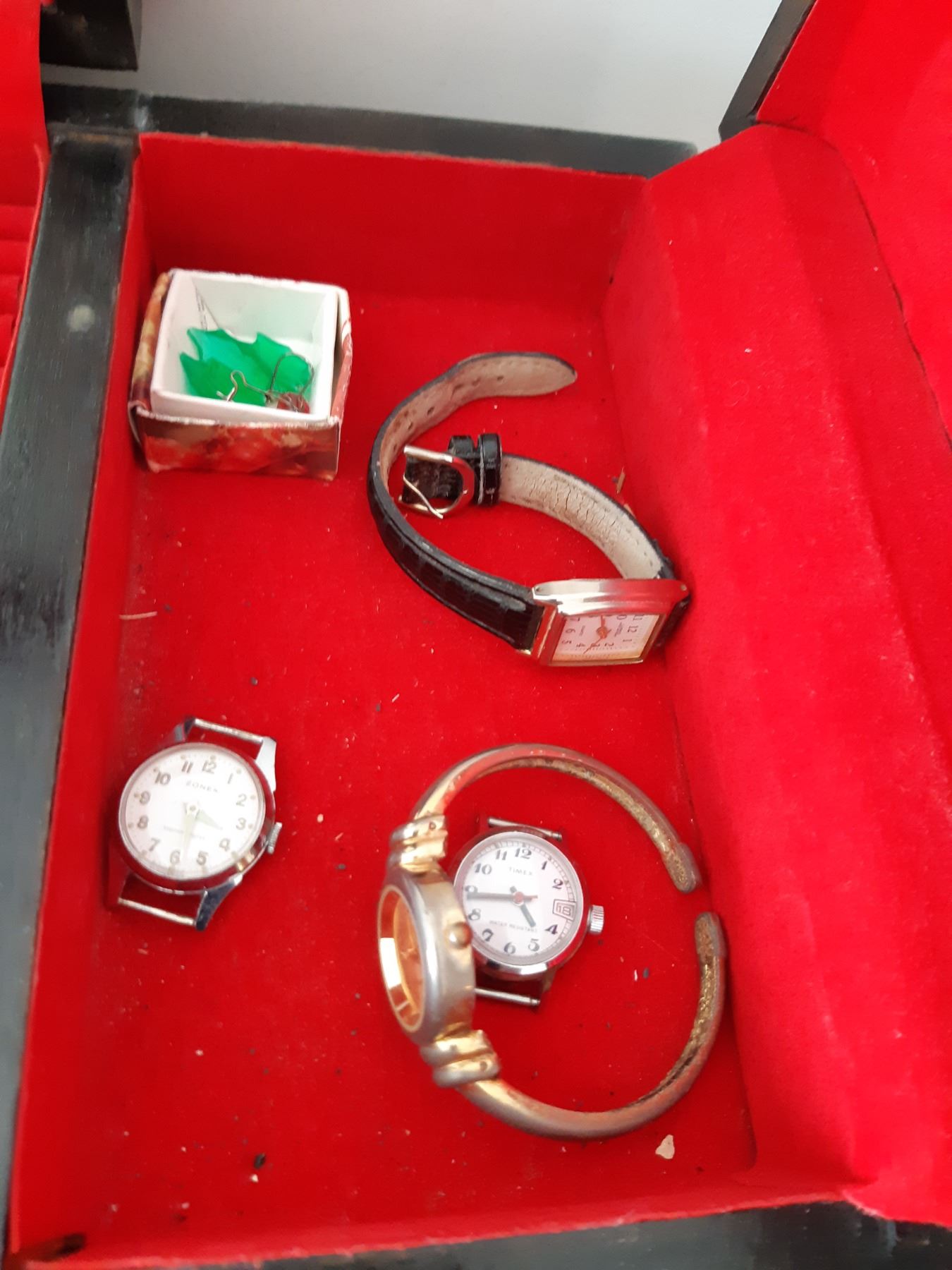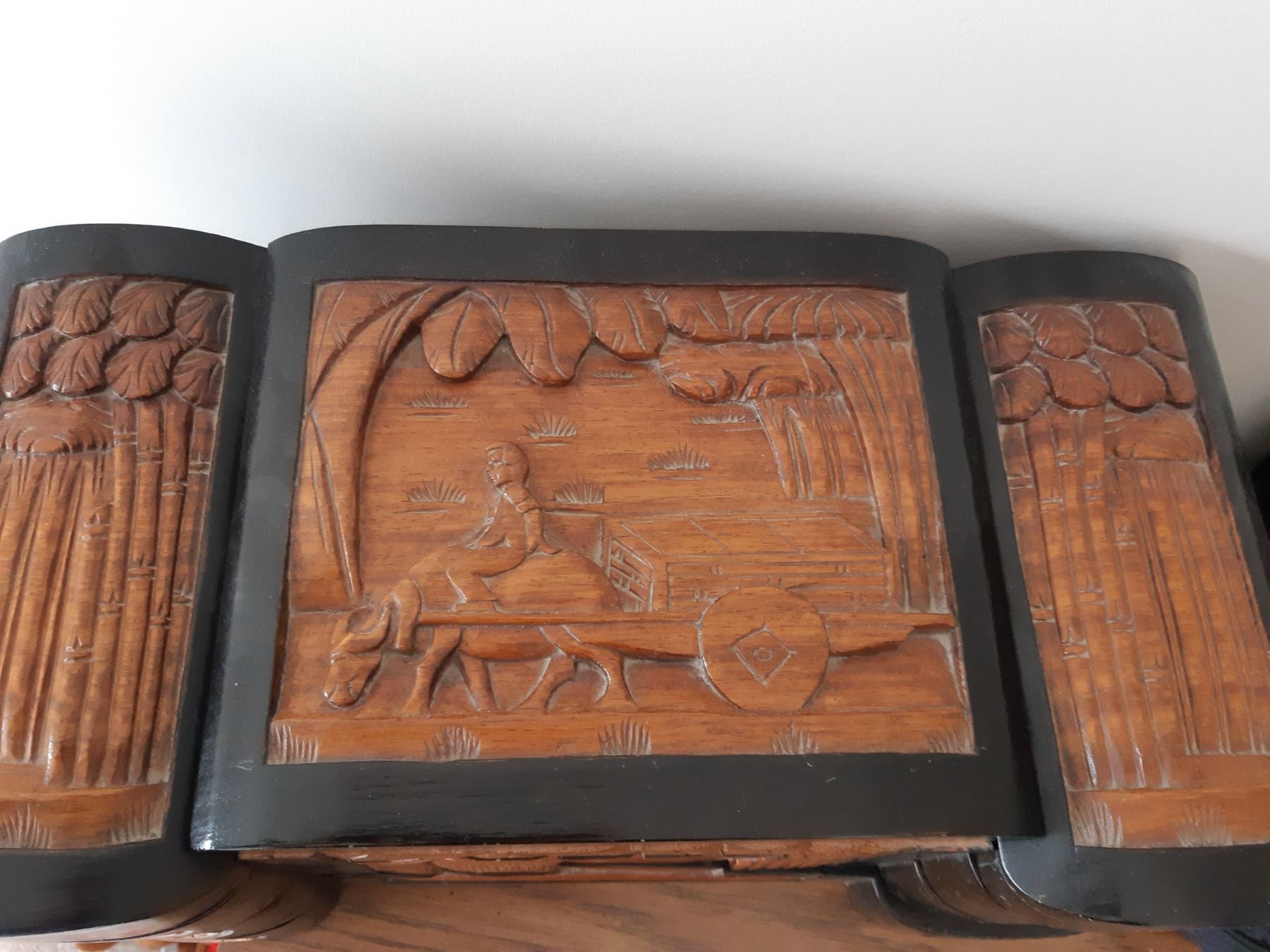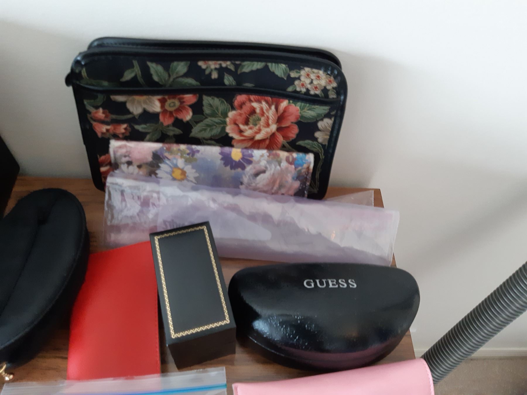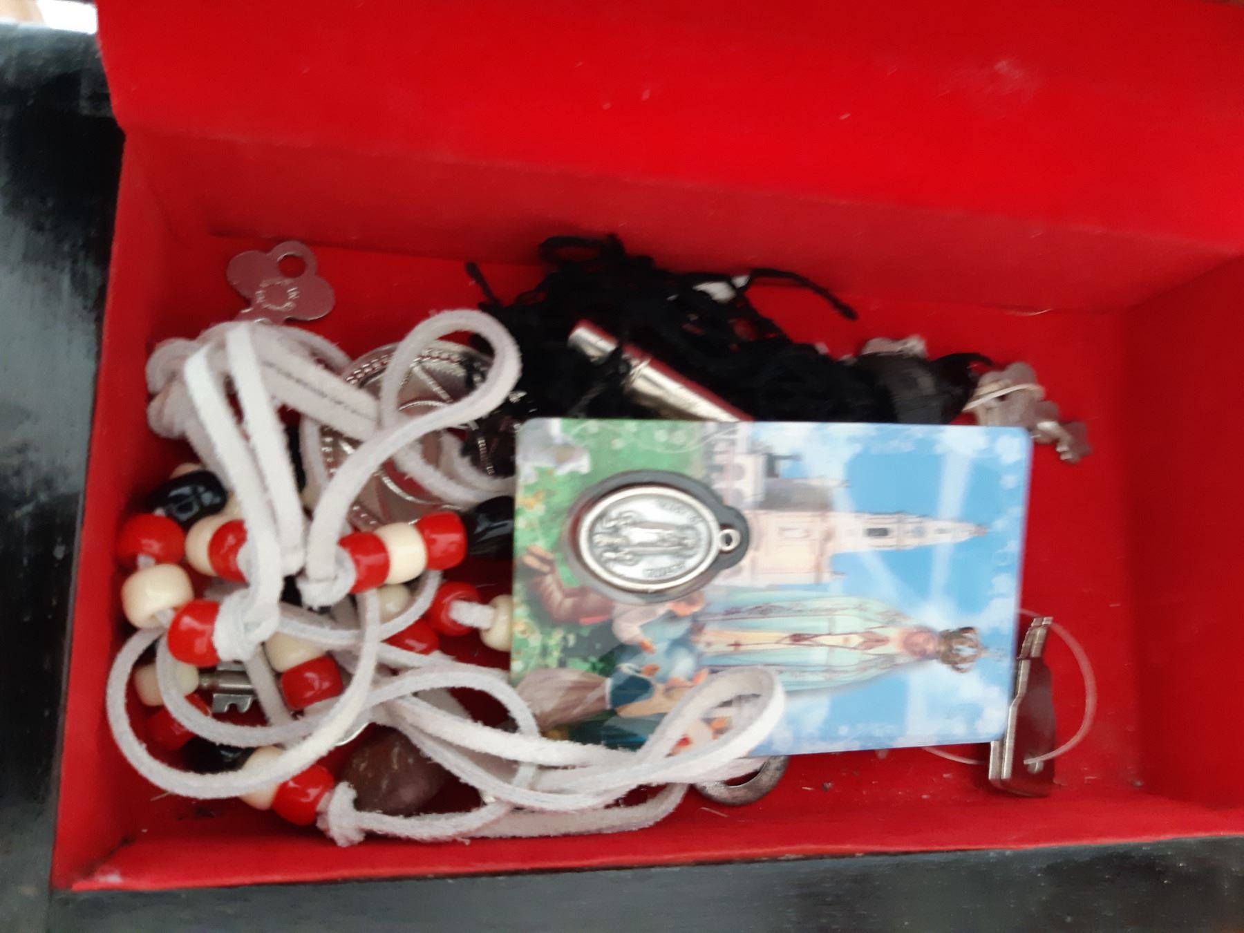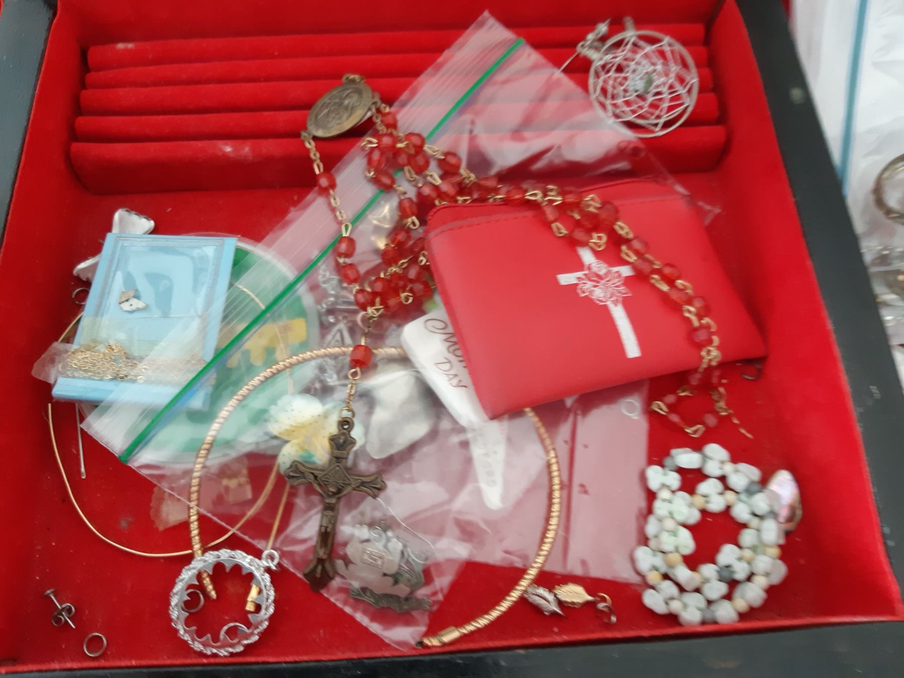 Hand Carved Jewelry Box, collection of wallets, costume jewelry. Pick up 9-11