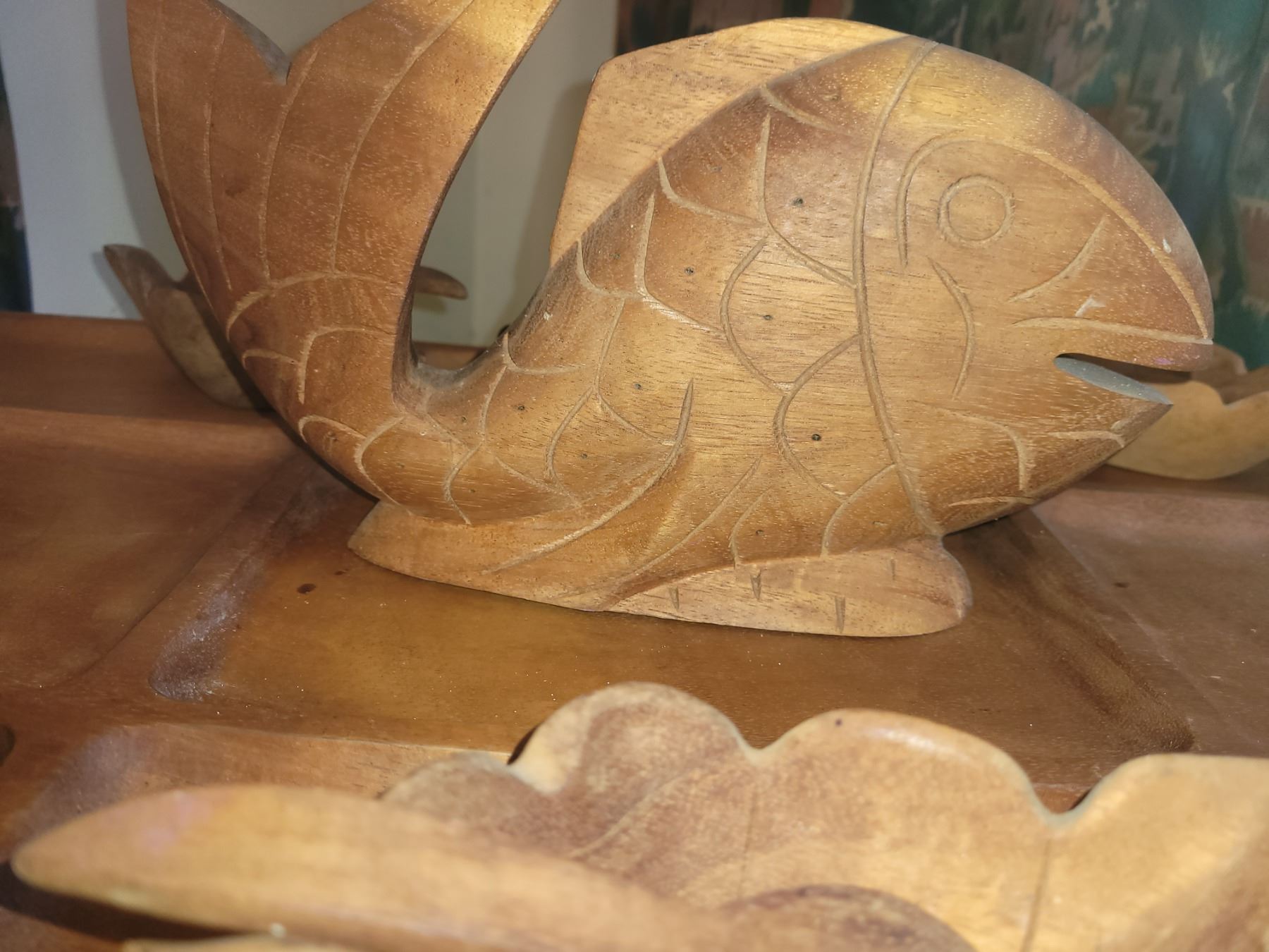 Wood table with in laid compartments 26x17x19, wood bowls, spoons, carved whale.pick up 9-10