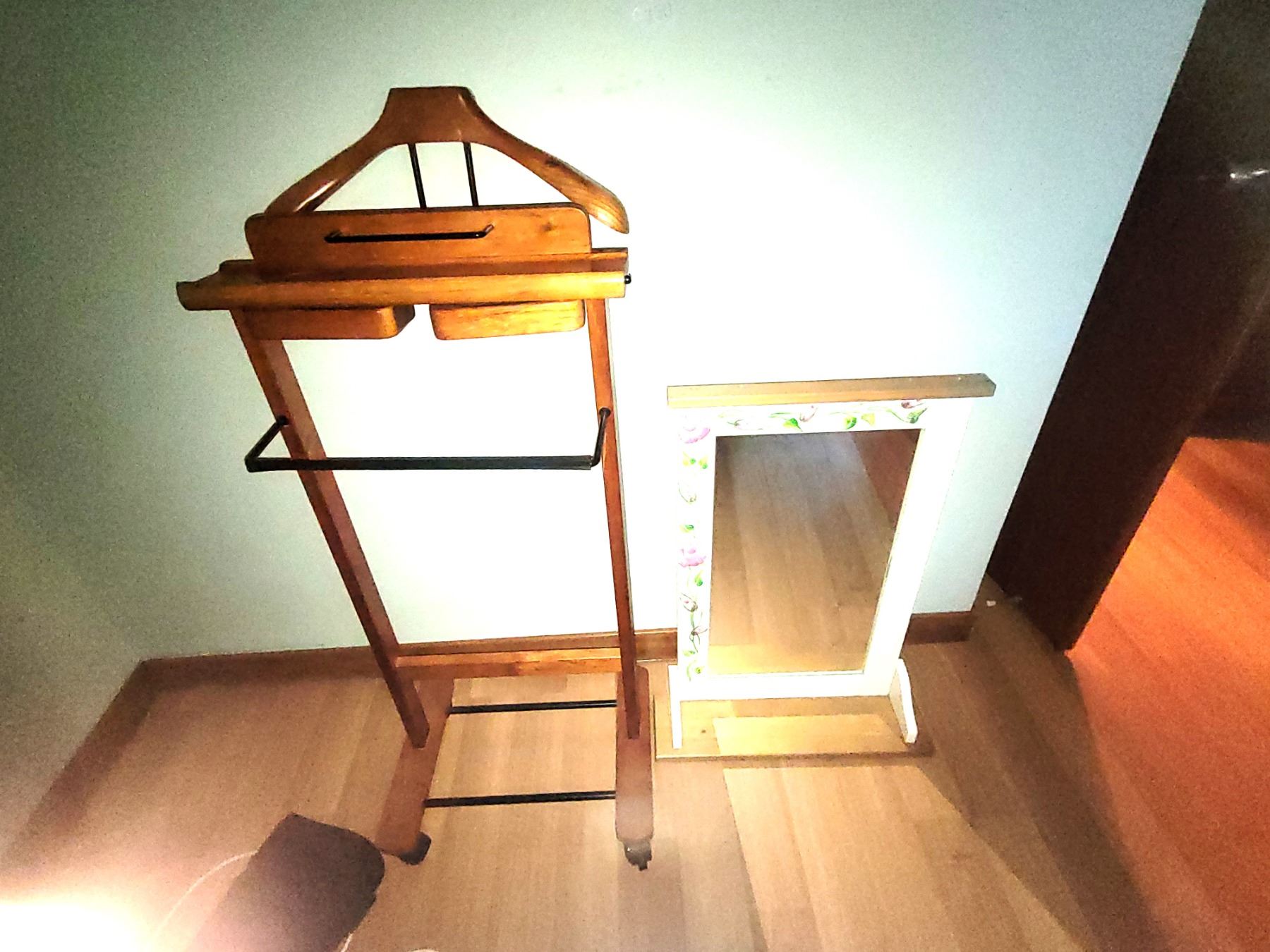 Rolling wood valet and table top mirror. Pickup at 10 am