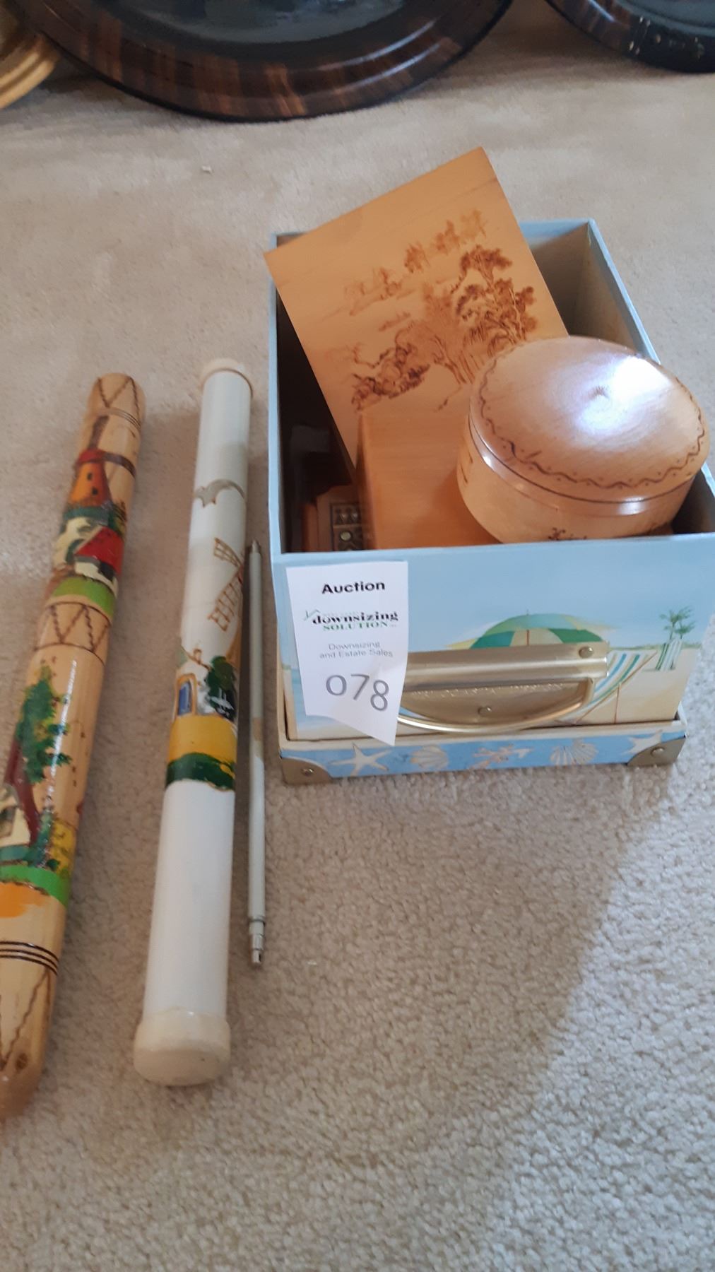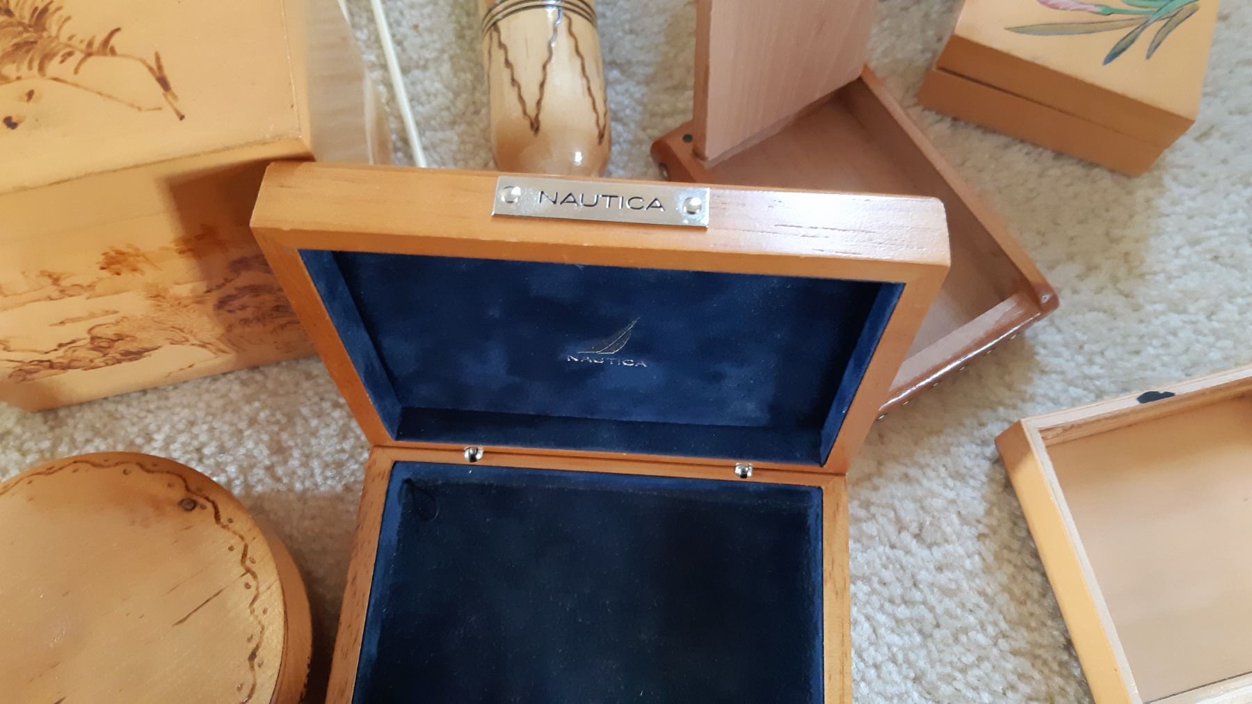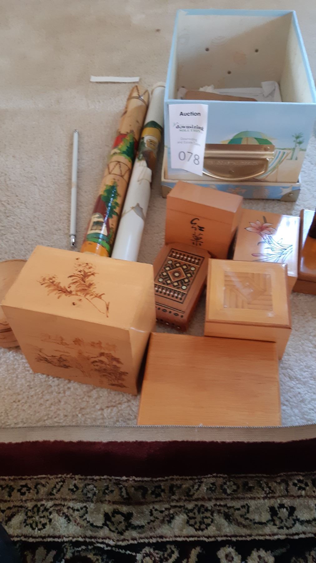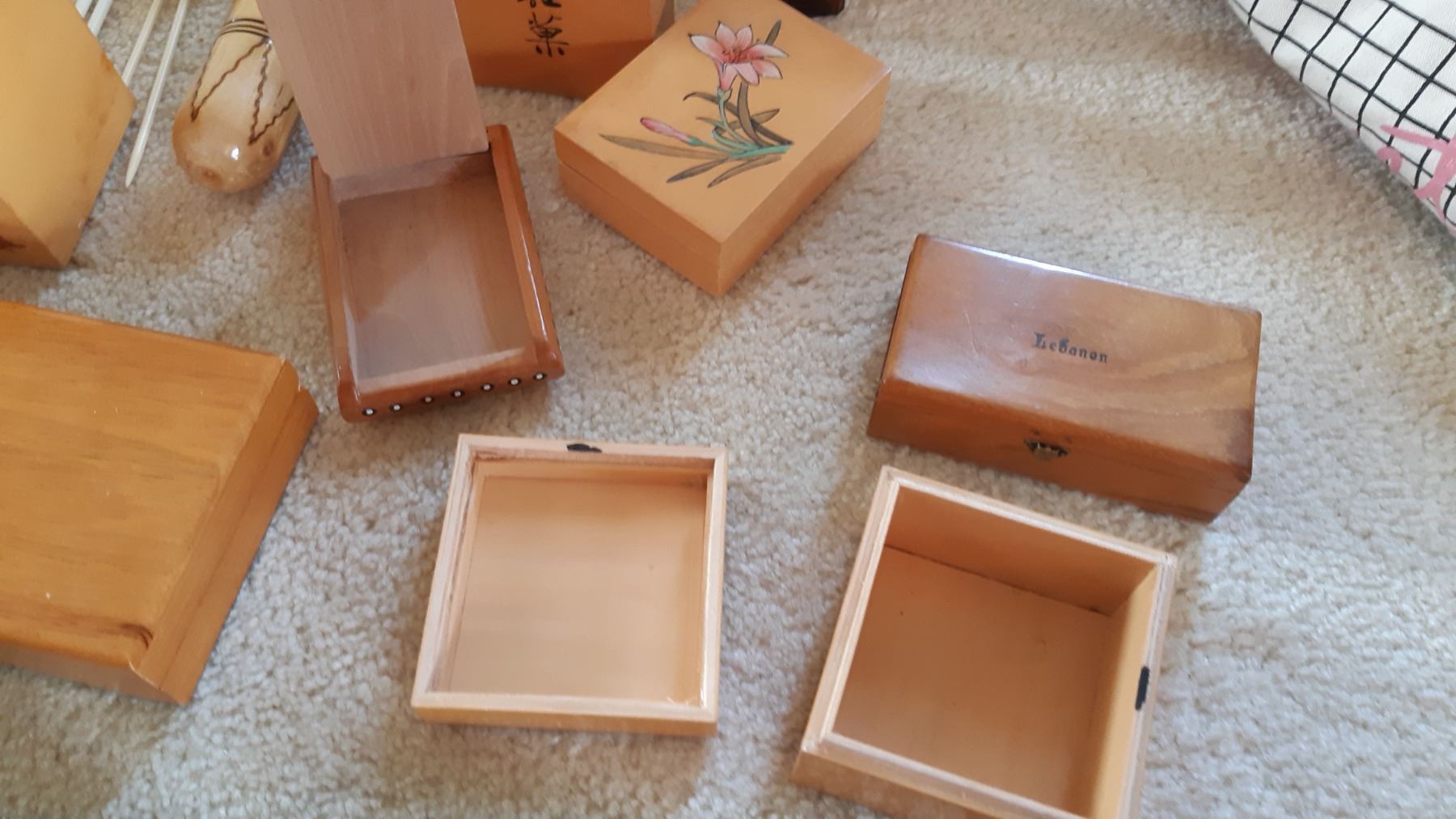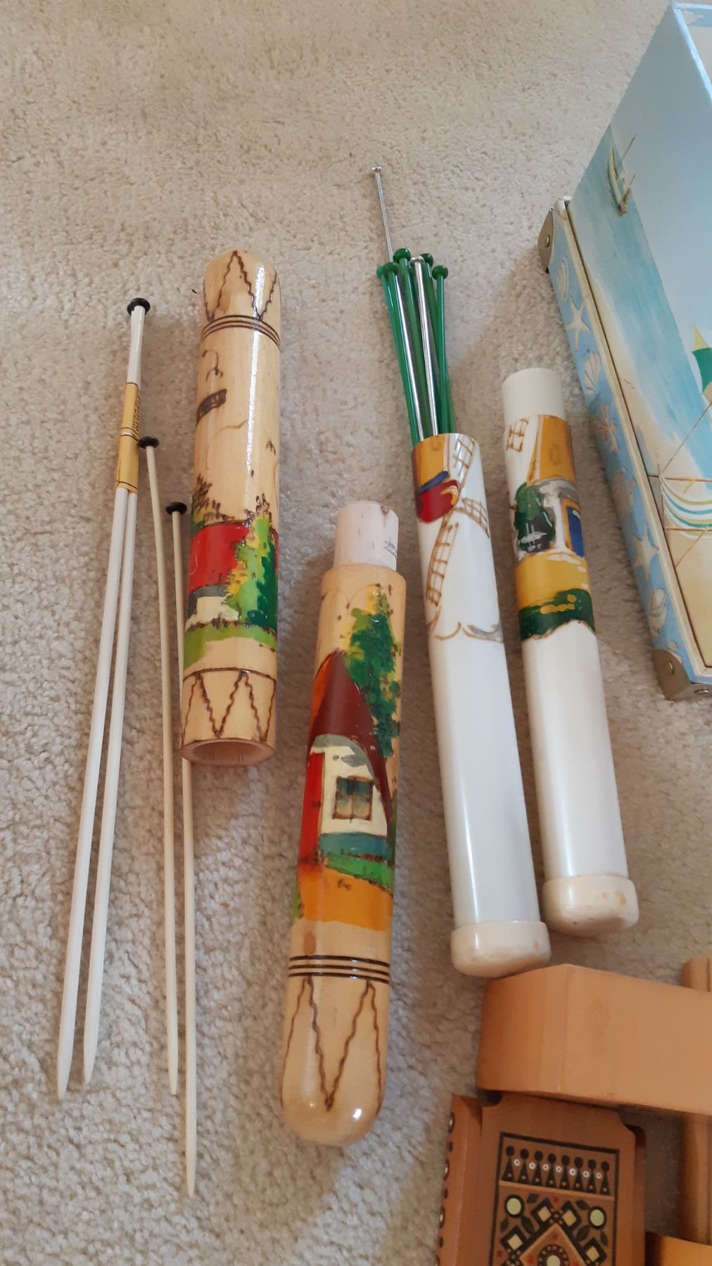 Variety of small wood boxes with some marks from use. Two containers of knitting needles inched for completeness.