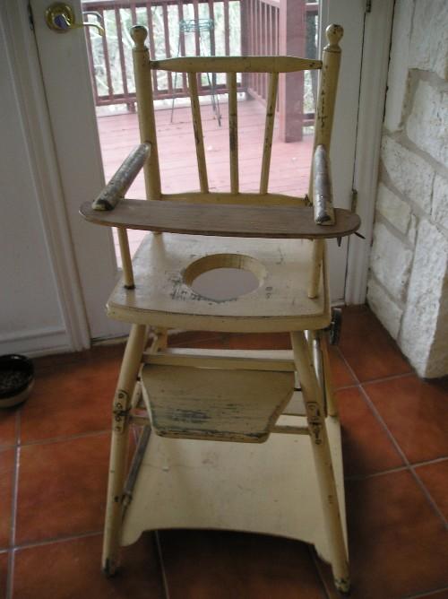 This old wooden high chair converts into a dolly. It measures approximately 38" tall.