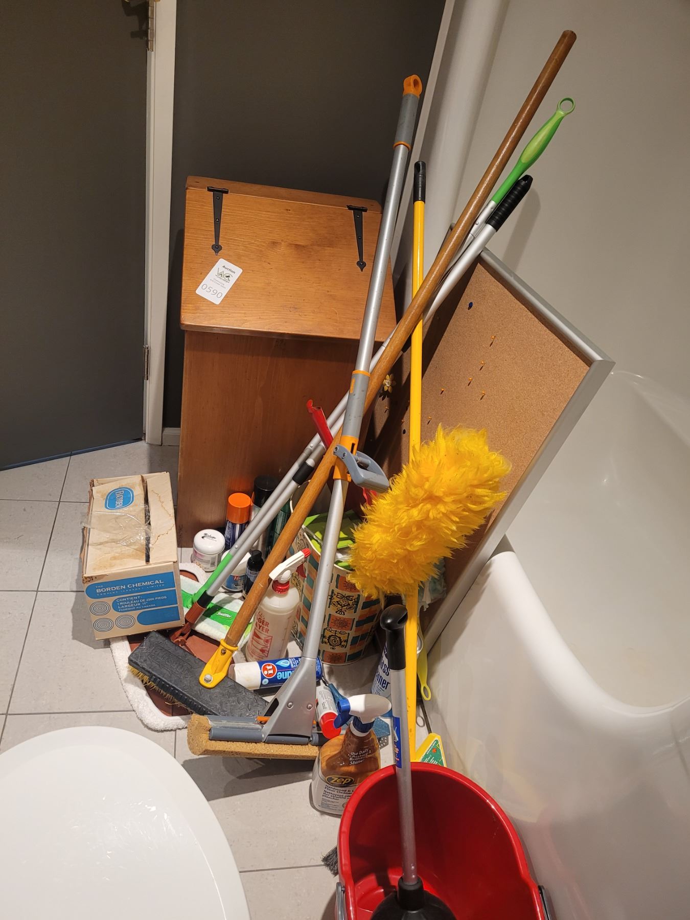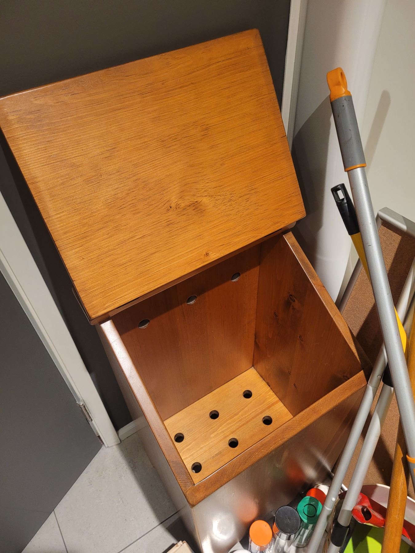 Wooden bathroom clothes hamper. Mops, brooms, cleaning chemicals. Pickup at 10 am