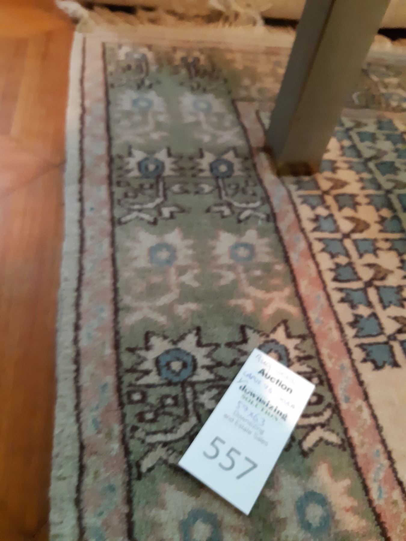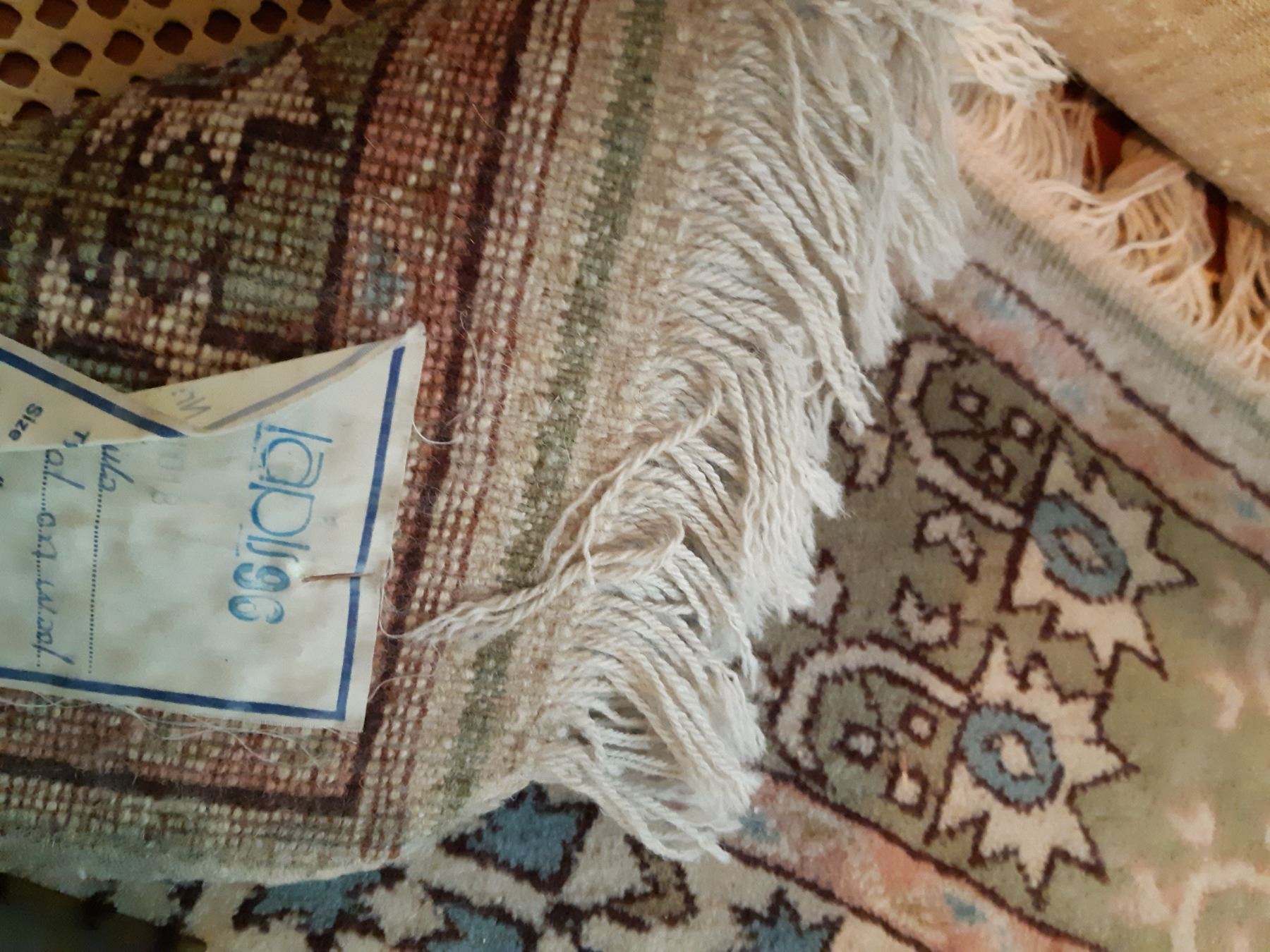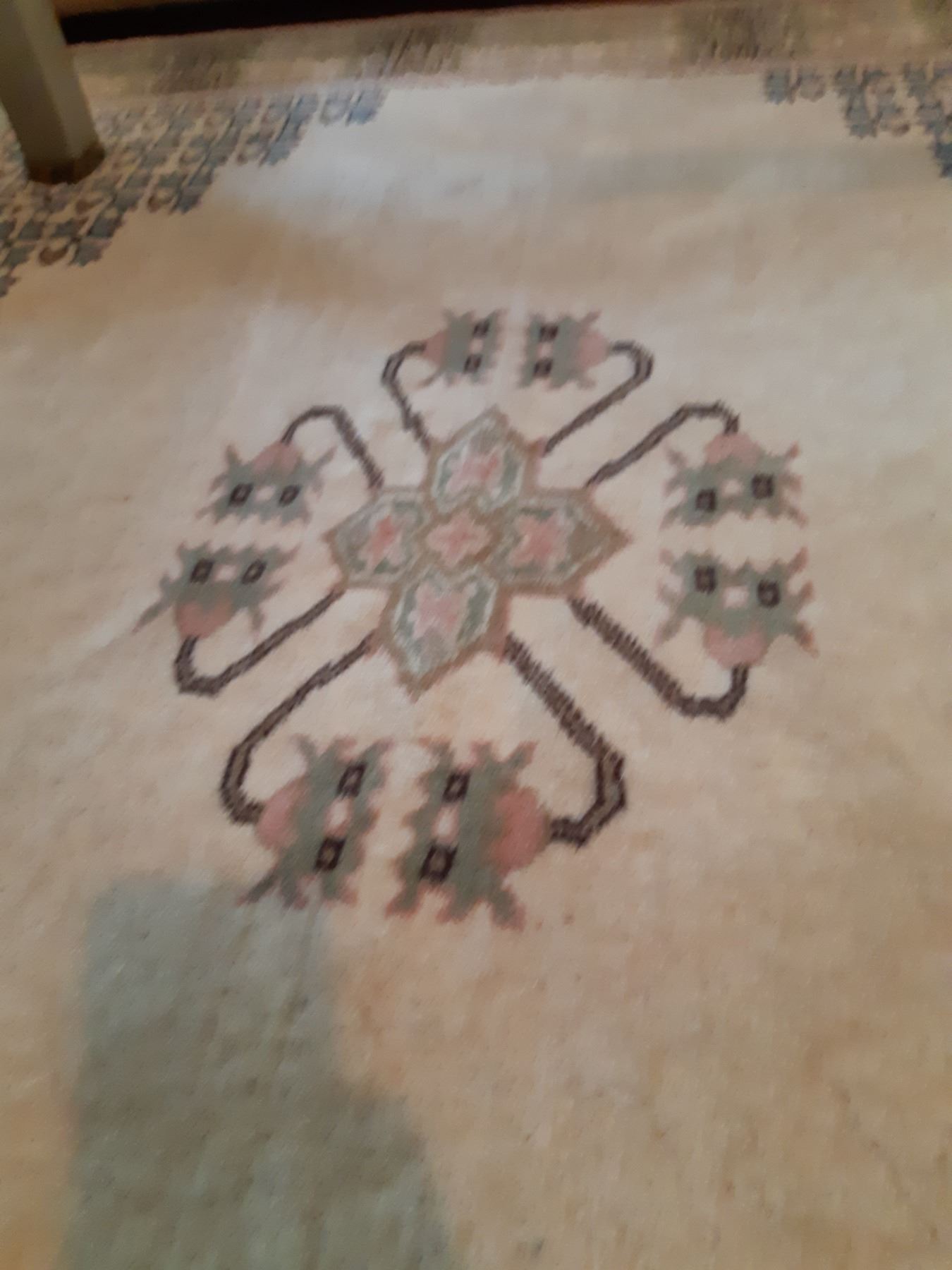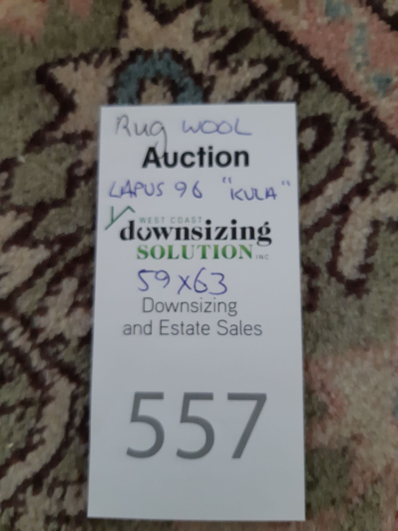 Wool Rug in sage green, rose, white & blue. Lapus 96 Kula 59x63 note stains Pickup at 12:30 pm