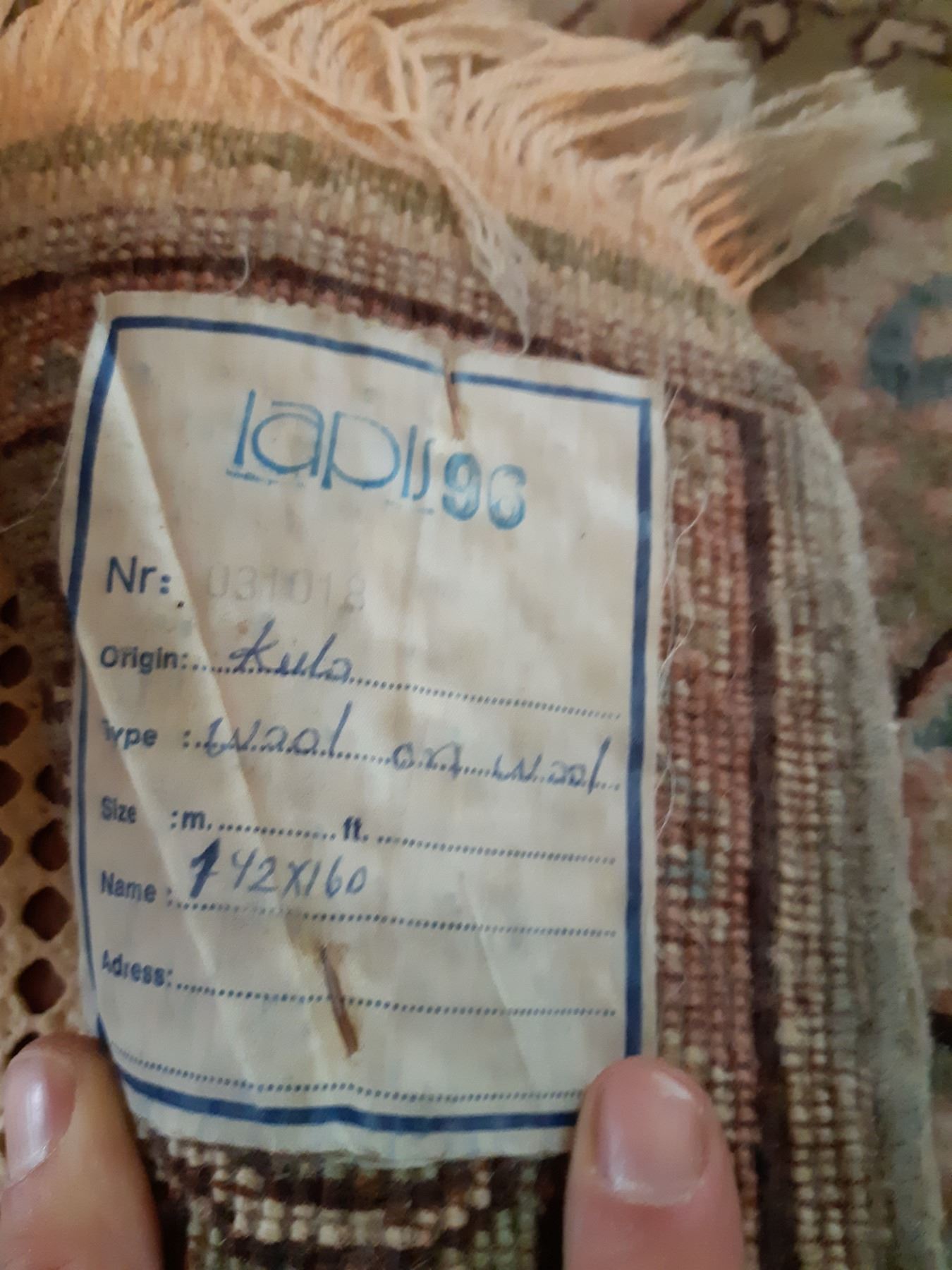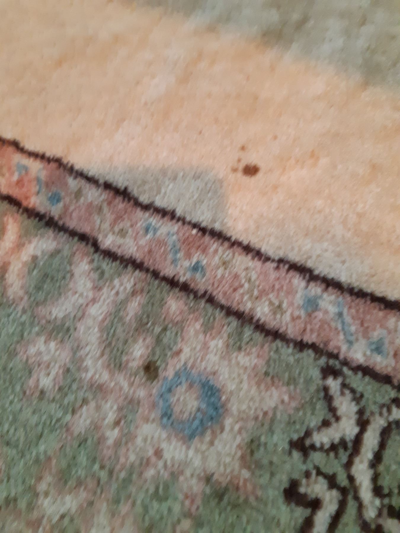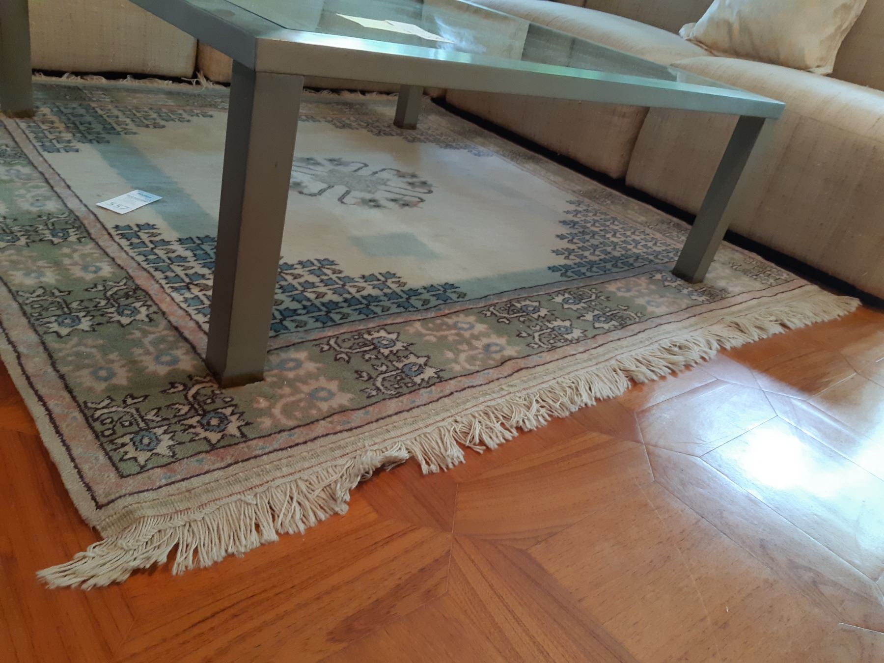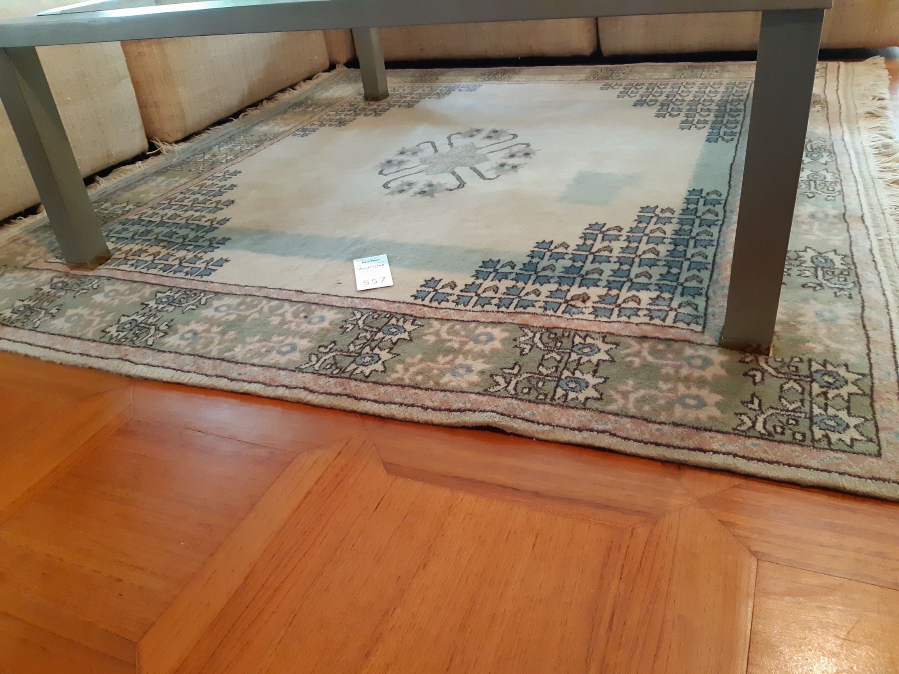 Wool Rug in sage green, rose, white & blue. Lapus 96 Kula 59x63 note stains Pickup at 12:30 pm