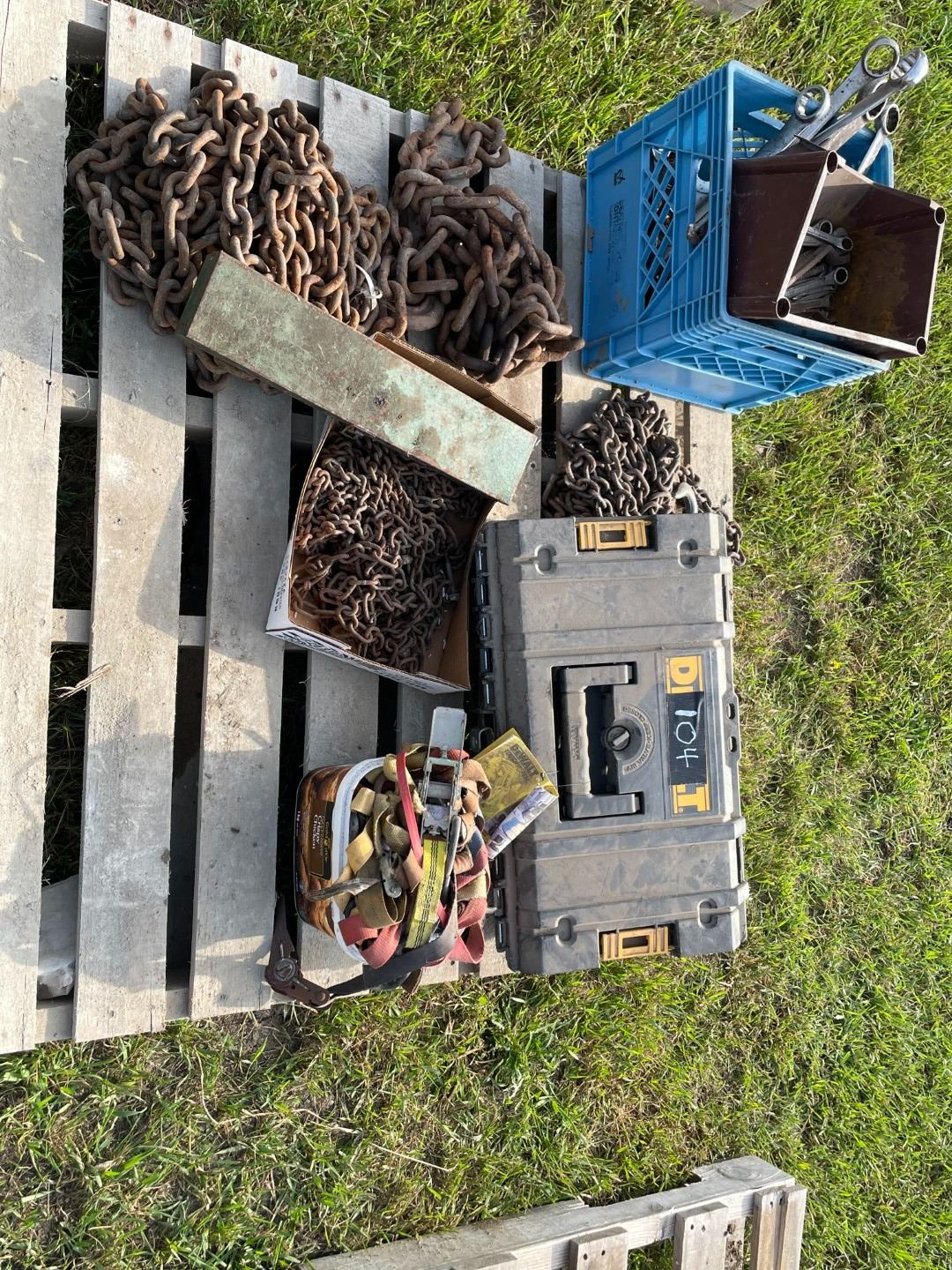 Box of wrenches, Logging chaings, Tool box, Rachet straps