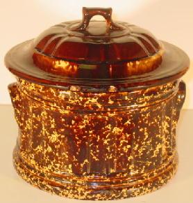 with two molded handles, base is "Rockingham/Bennington" tortoise shell glass, lid is brownish glaze, height 8 ½", diameter 10", English, mid/late 19th C.