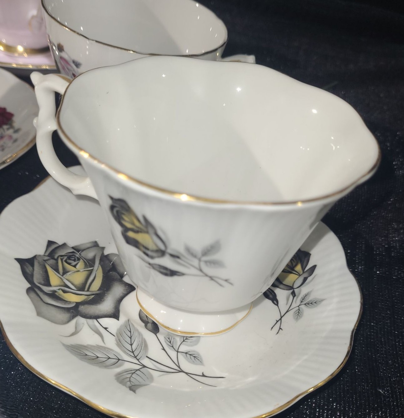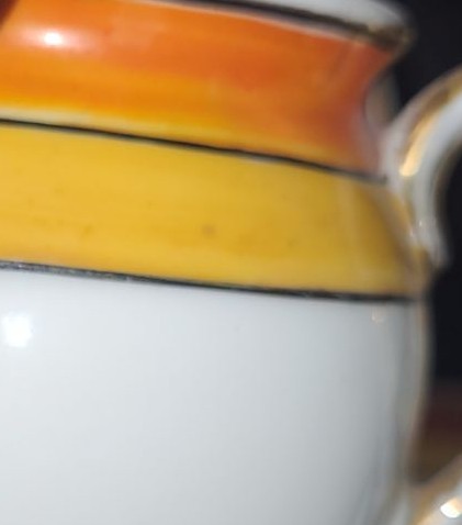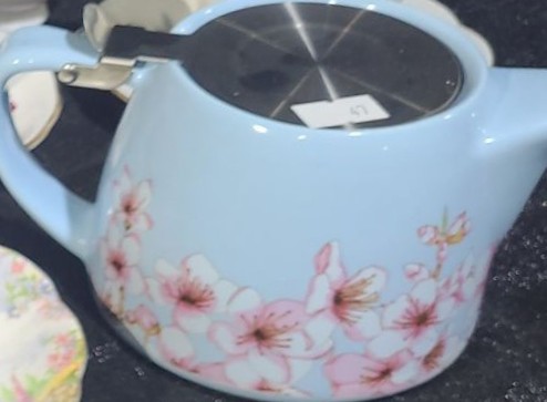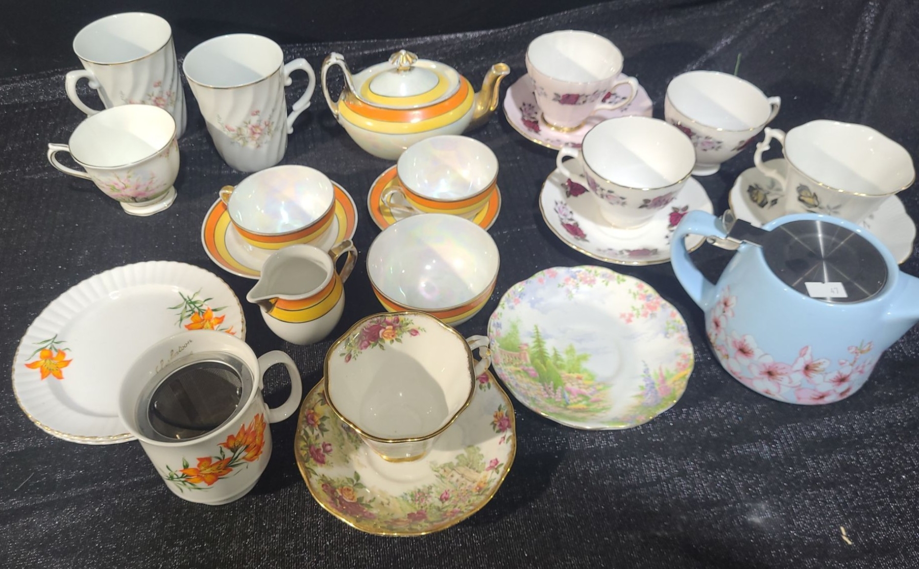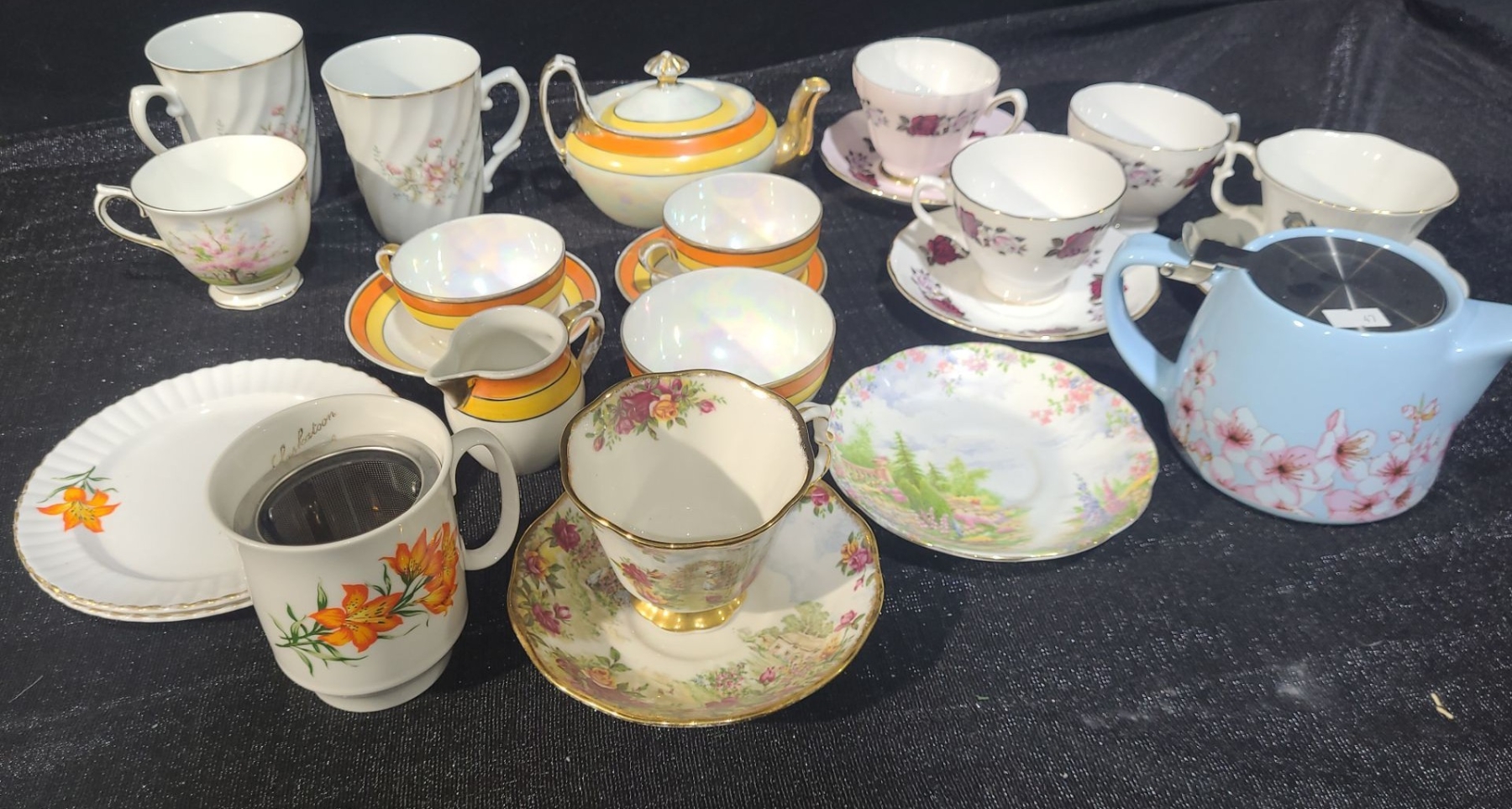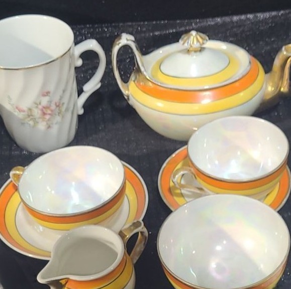 Yellow Striped Teaset: Teapot 6.5 W, 4 D, 4 T, Blue Teapot 3.5 T, Assorted Cups and Saucers
