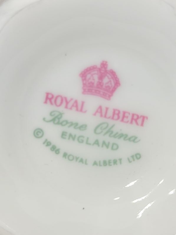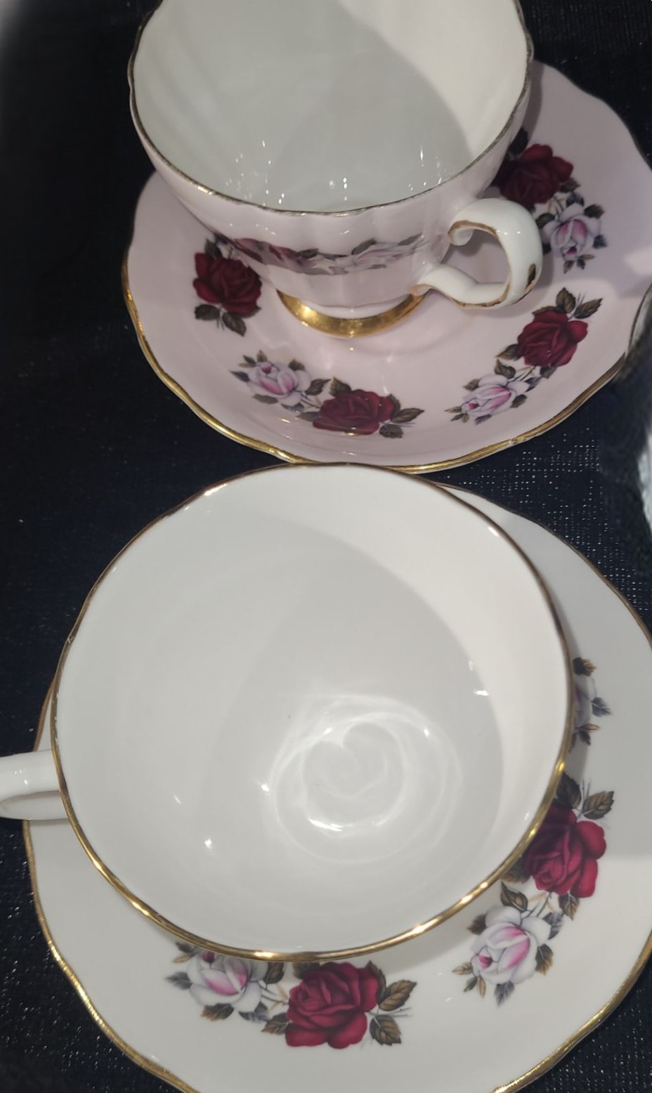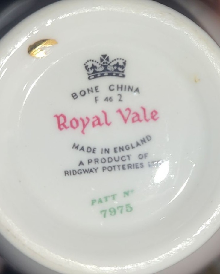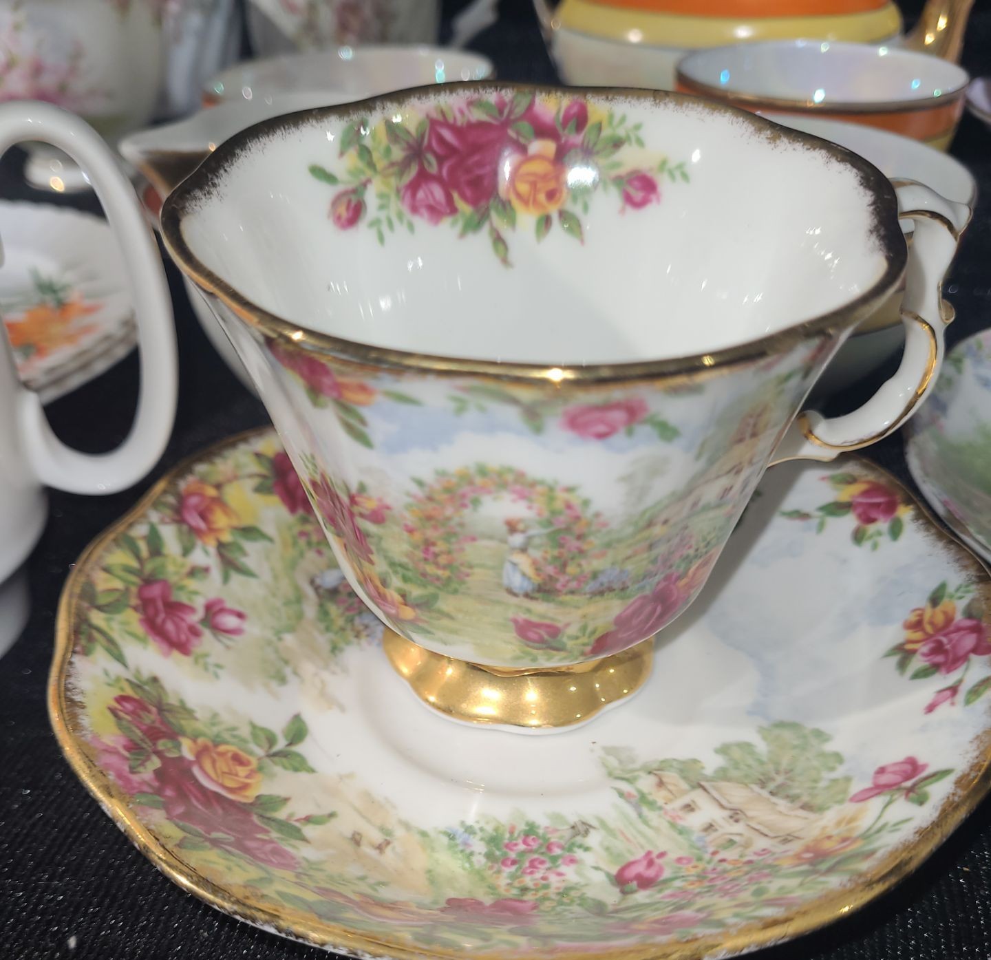 Yellow Striped Teaset: Teapot 6.5 W, 4 D, 4 T, Blue Teapot 3.5 T, Assorted Cups and Saucers