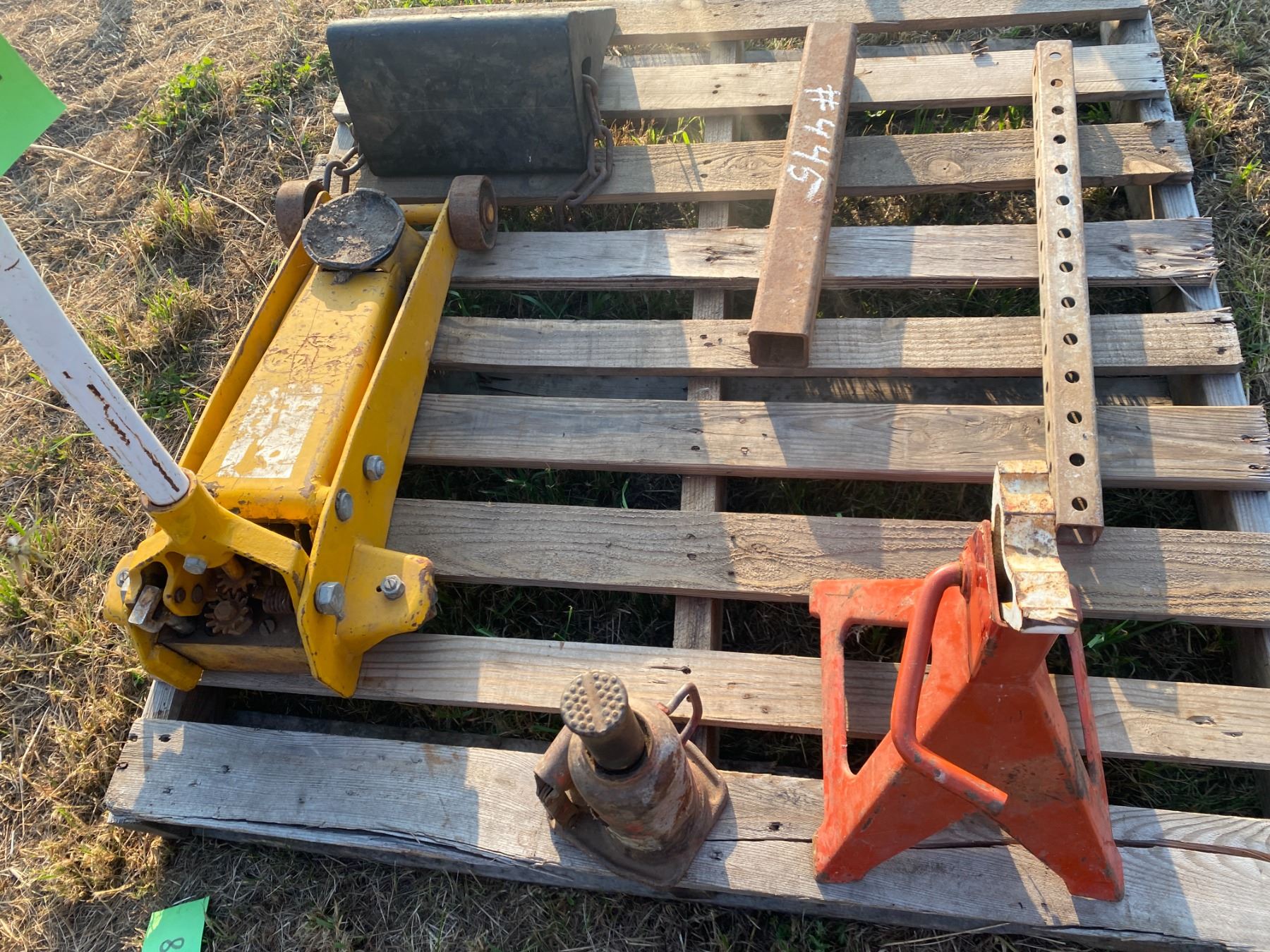 Yellow floor jack, rubber stopper, hyd jack, red jack stand