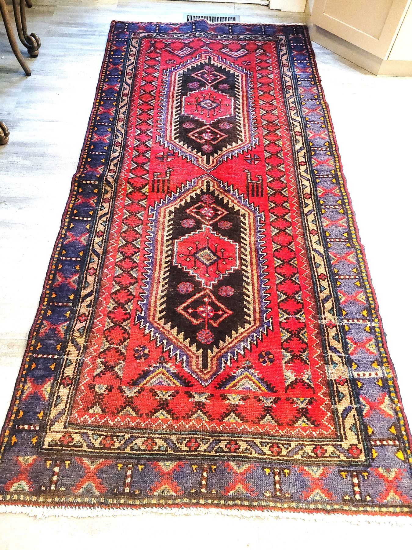 Zanjan low pile wool rug. Two medallion at the centre with geometric edges. Wool woven on cotton foundation. Natural colurs means the colour is plant-based non allergenic. 6'.9" X 3'.4". Professionally Washed. Pickup at 11 am