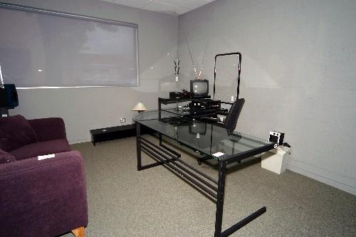 glass desk, chair, sofa, bookcase, 2 tables, 2 lamps, coat rack, file cabinet - room 167