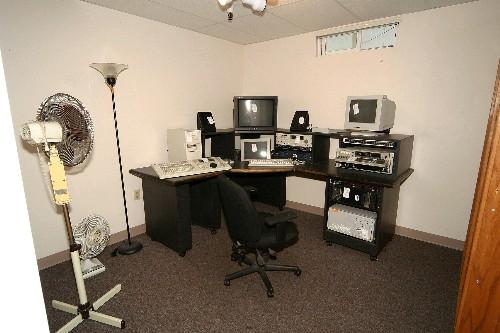Fairlight editing workstation - incl. Fairlight editing rig (MFX mini, controller, 13" CRT monitor), CPU, Acoustic Research speakers, Sony PVM-2030 monitor, 13" CRT monitor, Fostex D-10 DAT recorder, Rane SM82 line mixer, Symetrix 420 20W amp, JVC VCR BR-S525U, SCSI 7 bay (2 wide/1 tape), workdesk with Furman PL-Plus Power Conditioner and patch bay, chair, bookcase - room 204