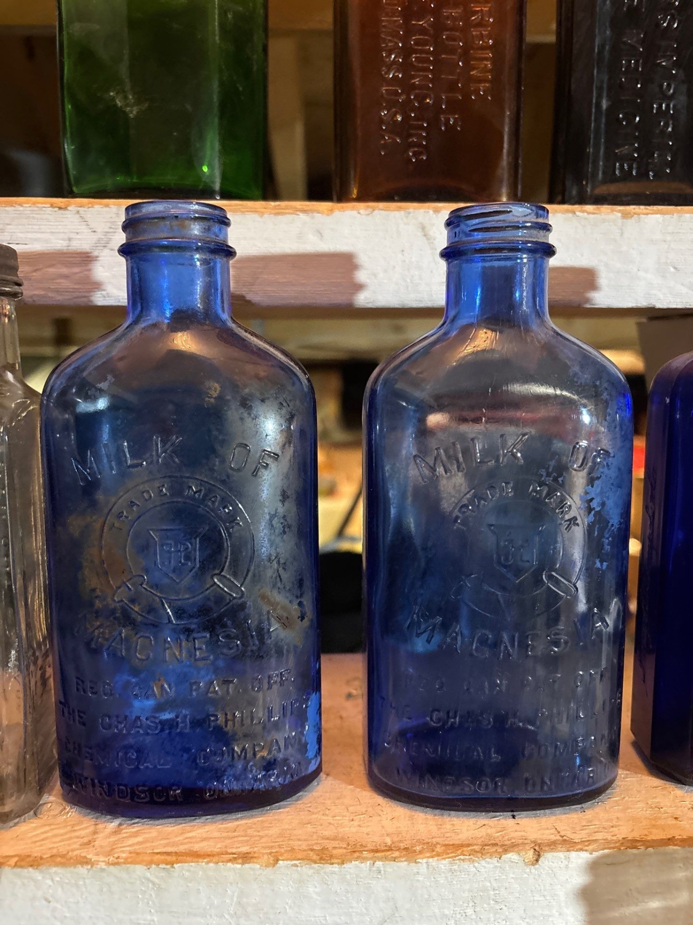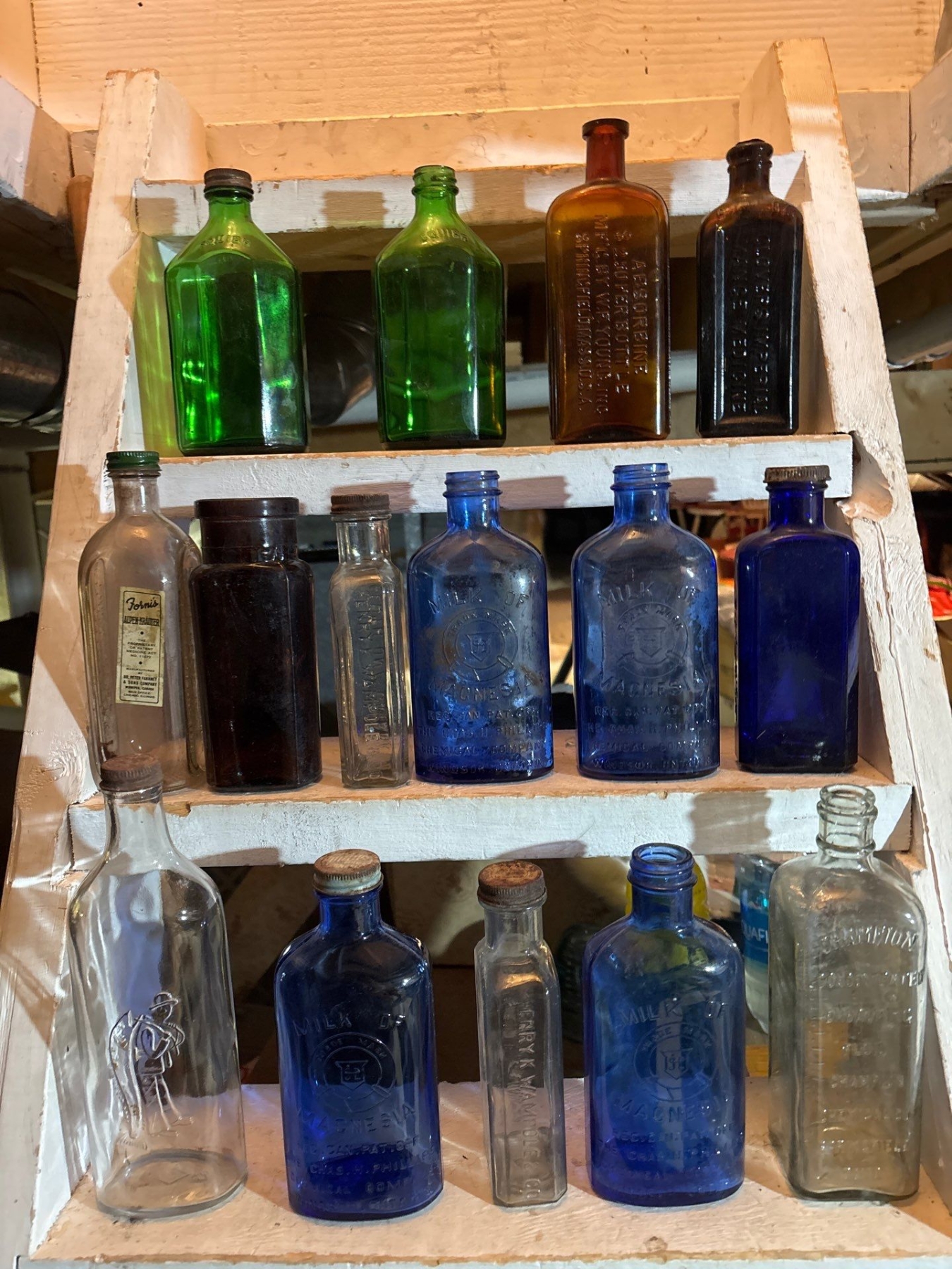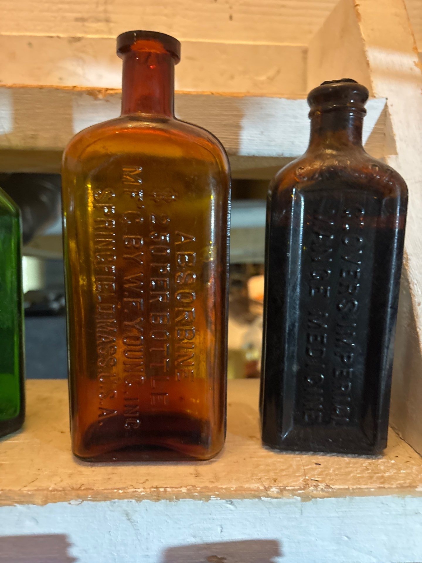 amazing selection of green Amber, blue large and medium apothecary embossed medicine bottles high value