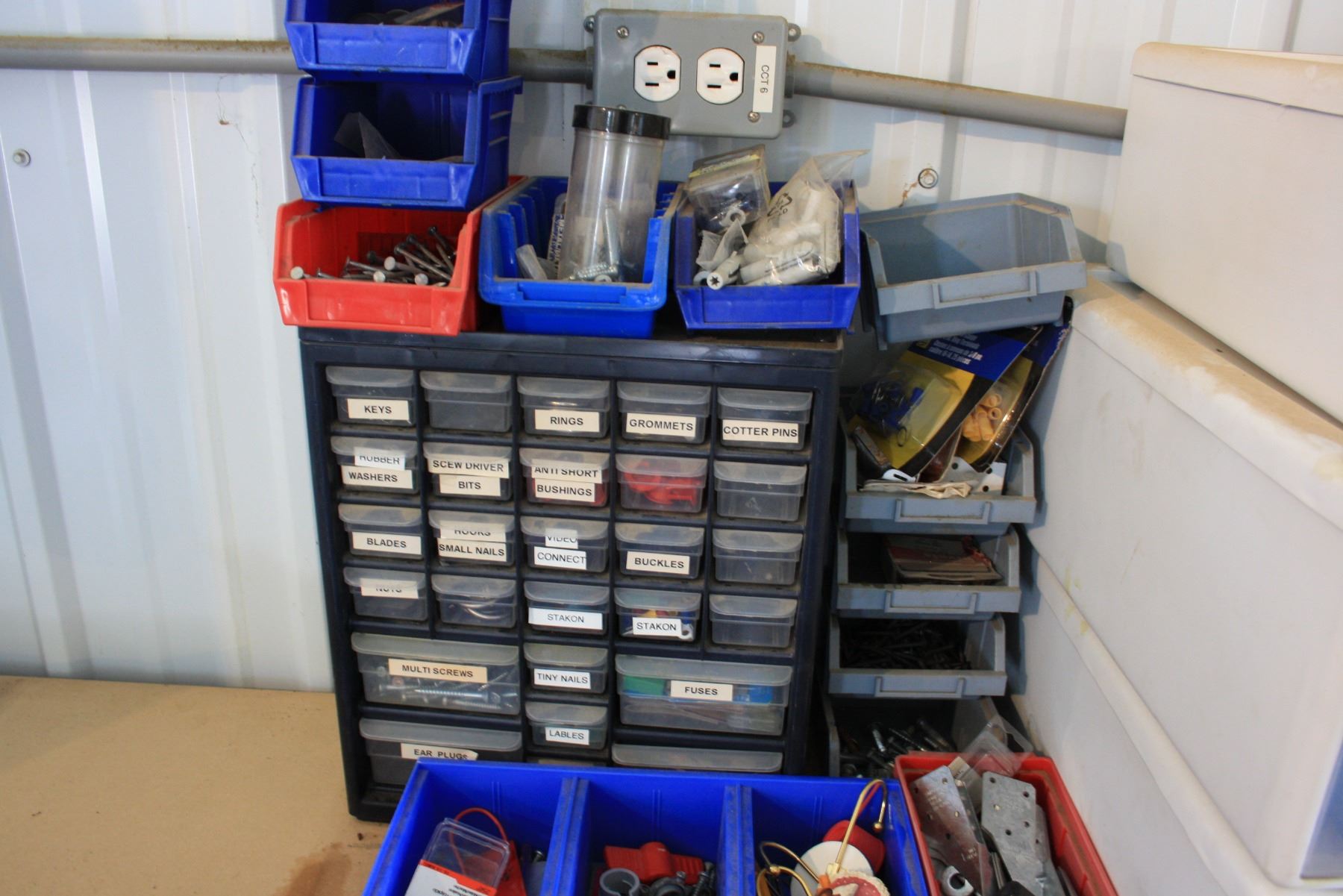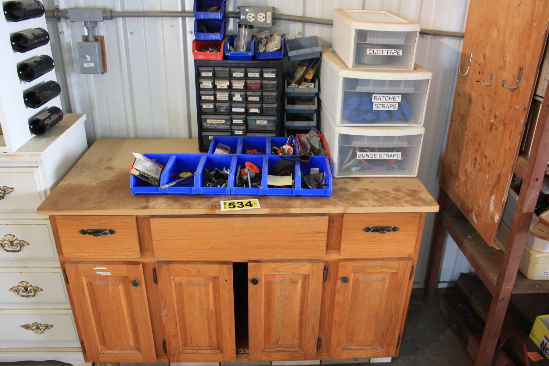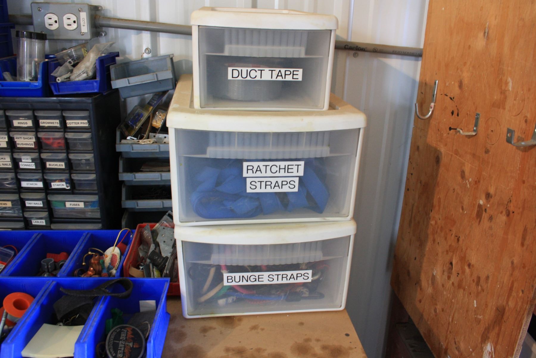 wooden cupboard has 4 cupboards 2 draws bolt bins misc hardware ratchet straps and bungee cords